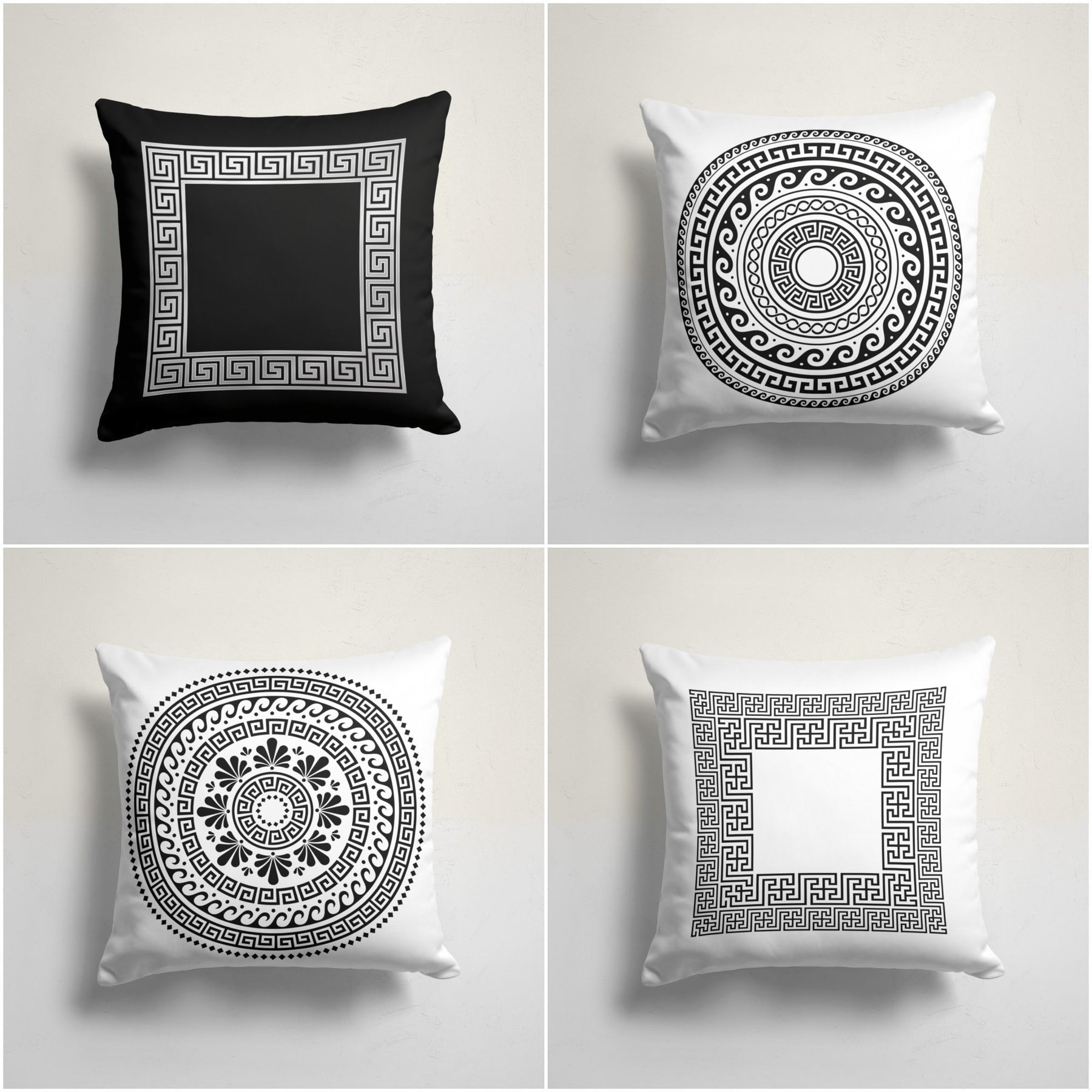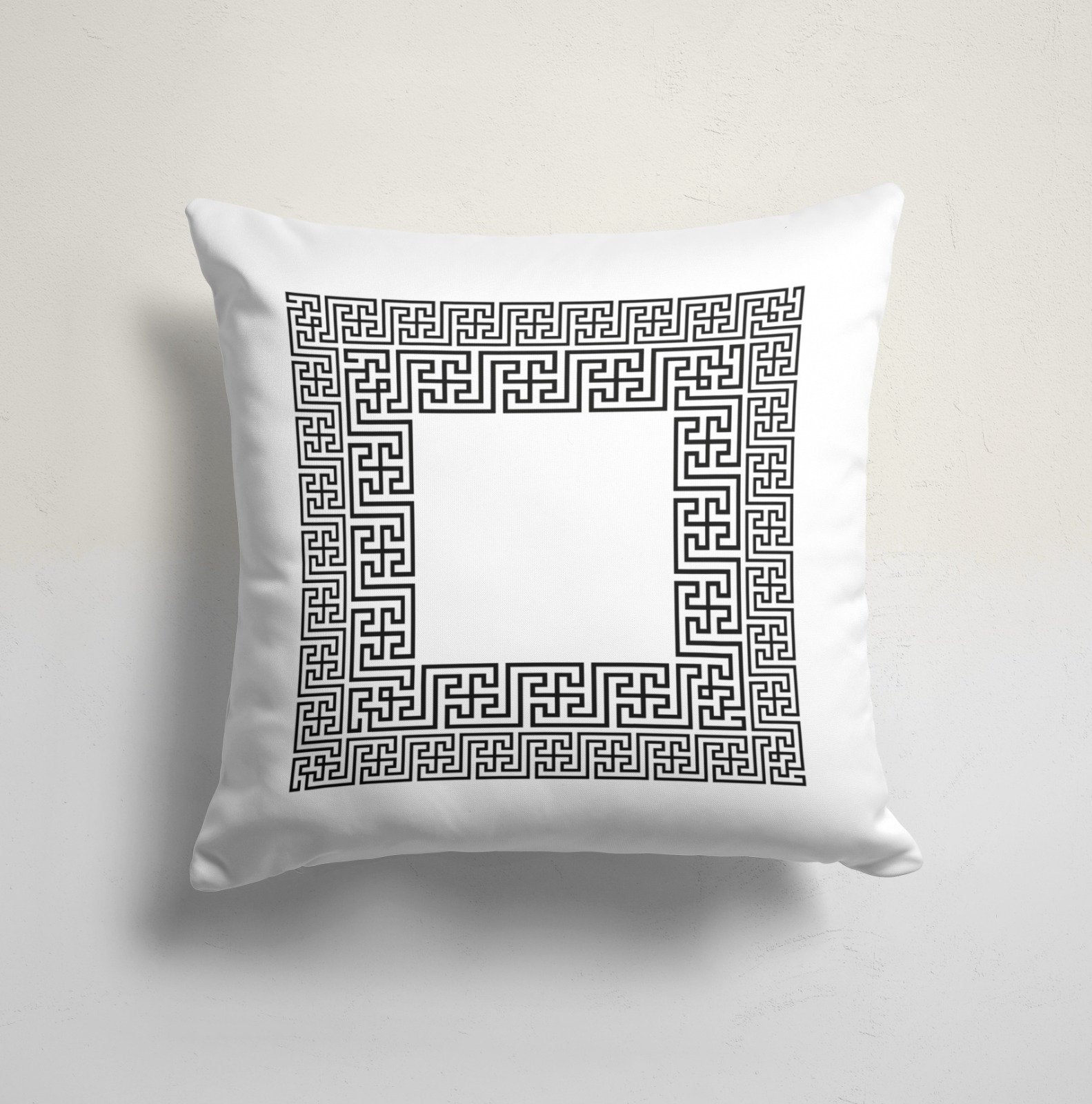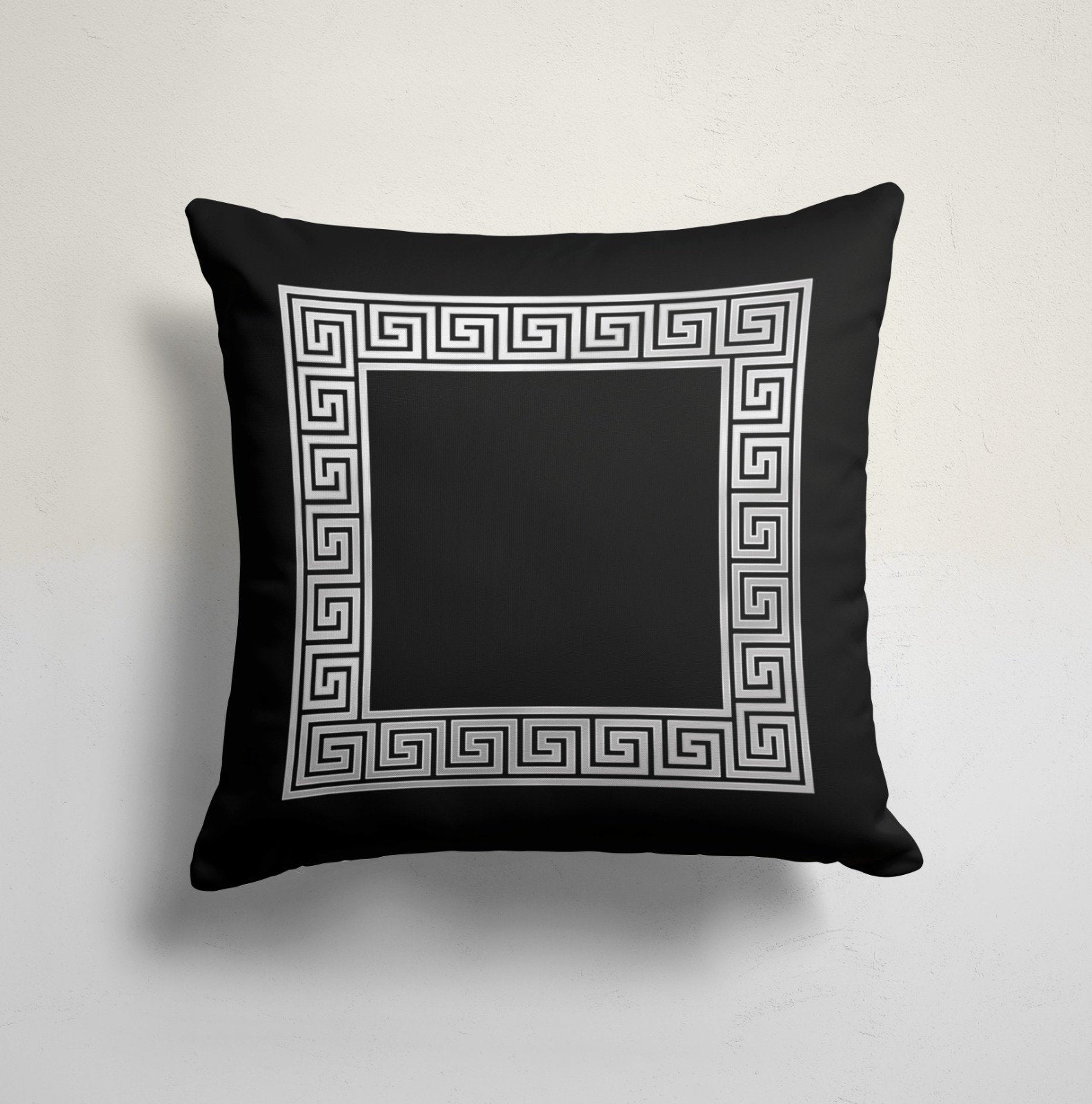 These elegant square decorative throw pillow covers with black, white Greek Key patterns;