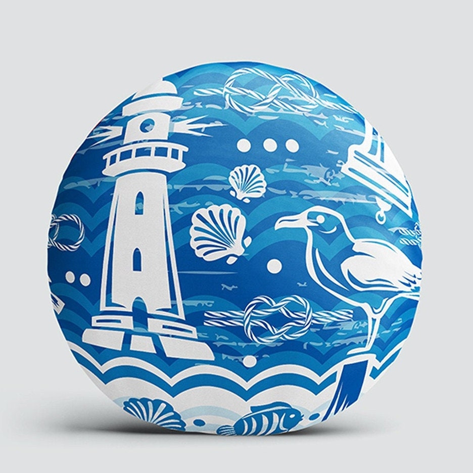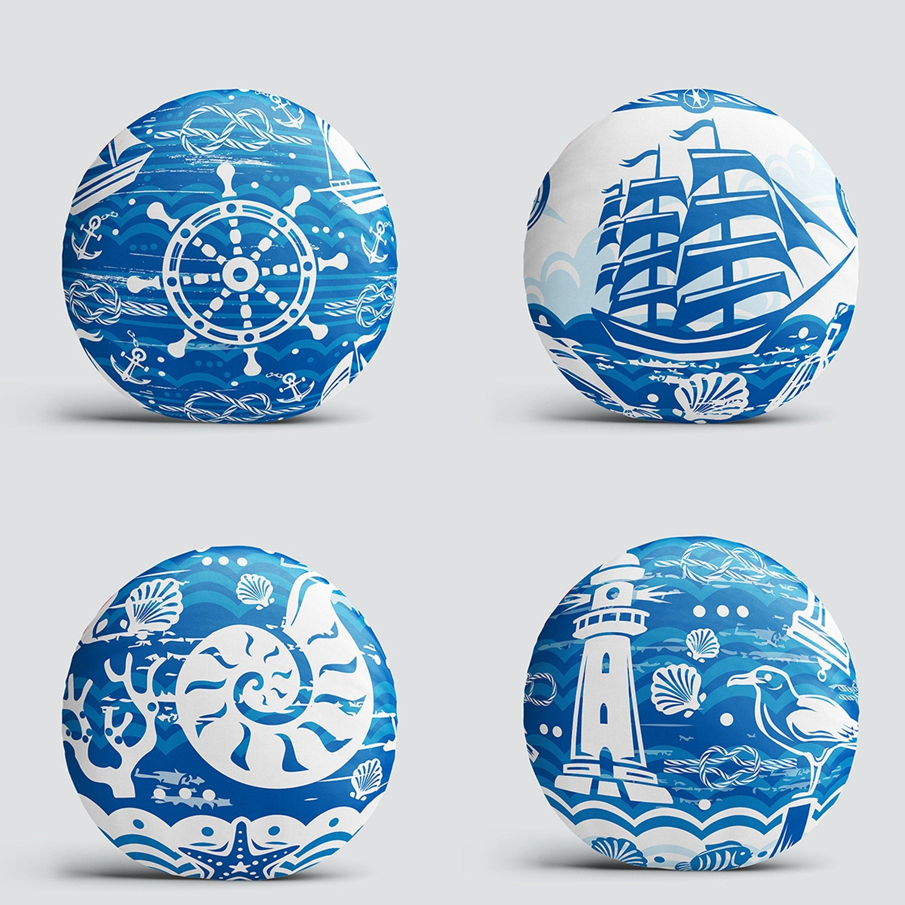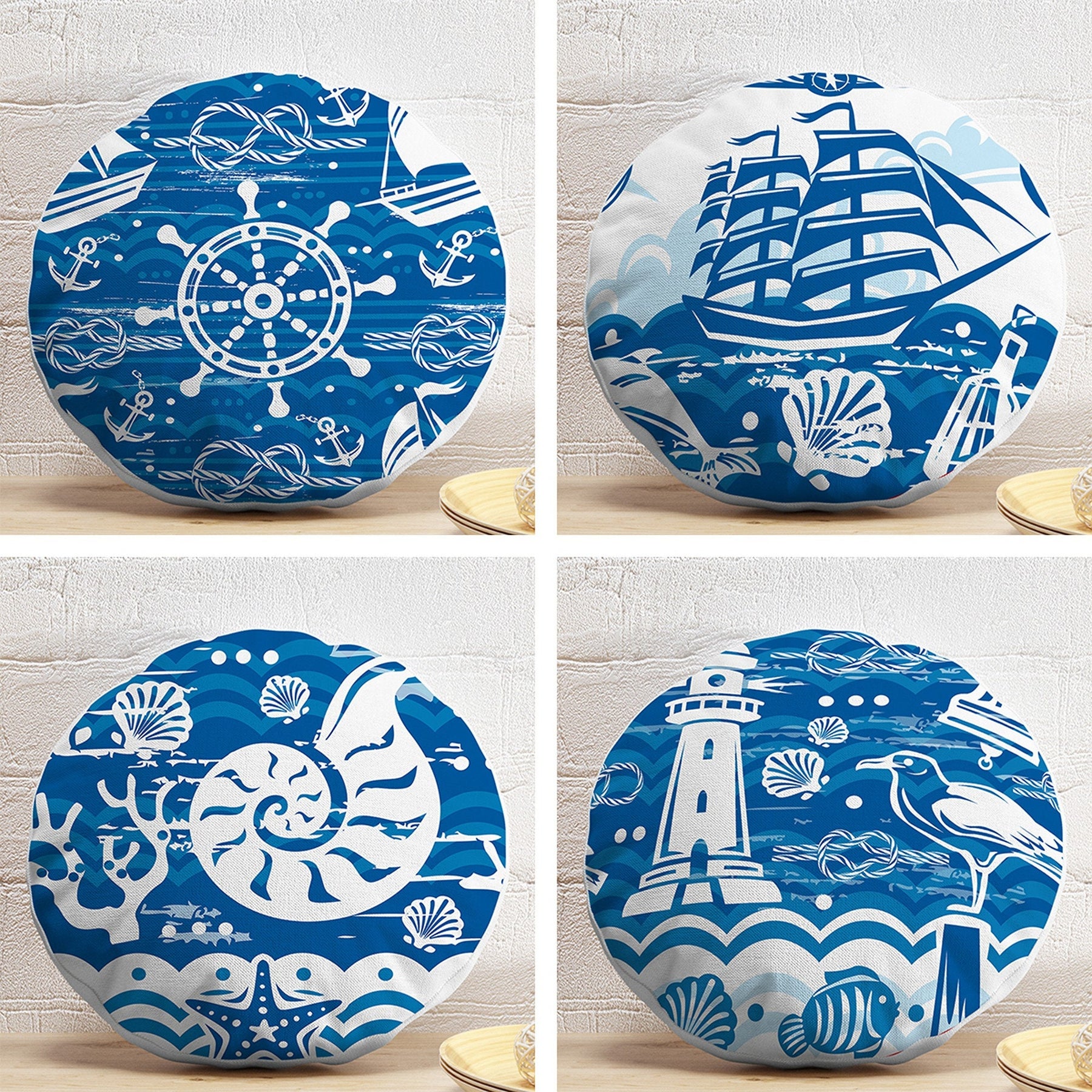 These set of 4 decorative round coastal beach house pillow covers (you can purchase as only pillow covers OR with round inserts) with Blue White Ship, Lighthouse, Wheel and Seashell prints;