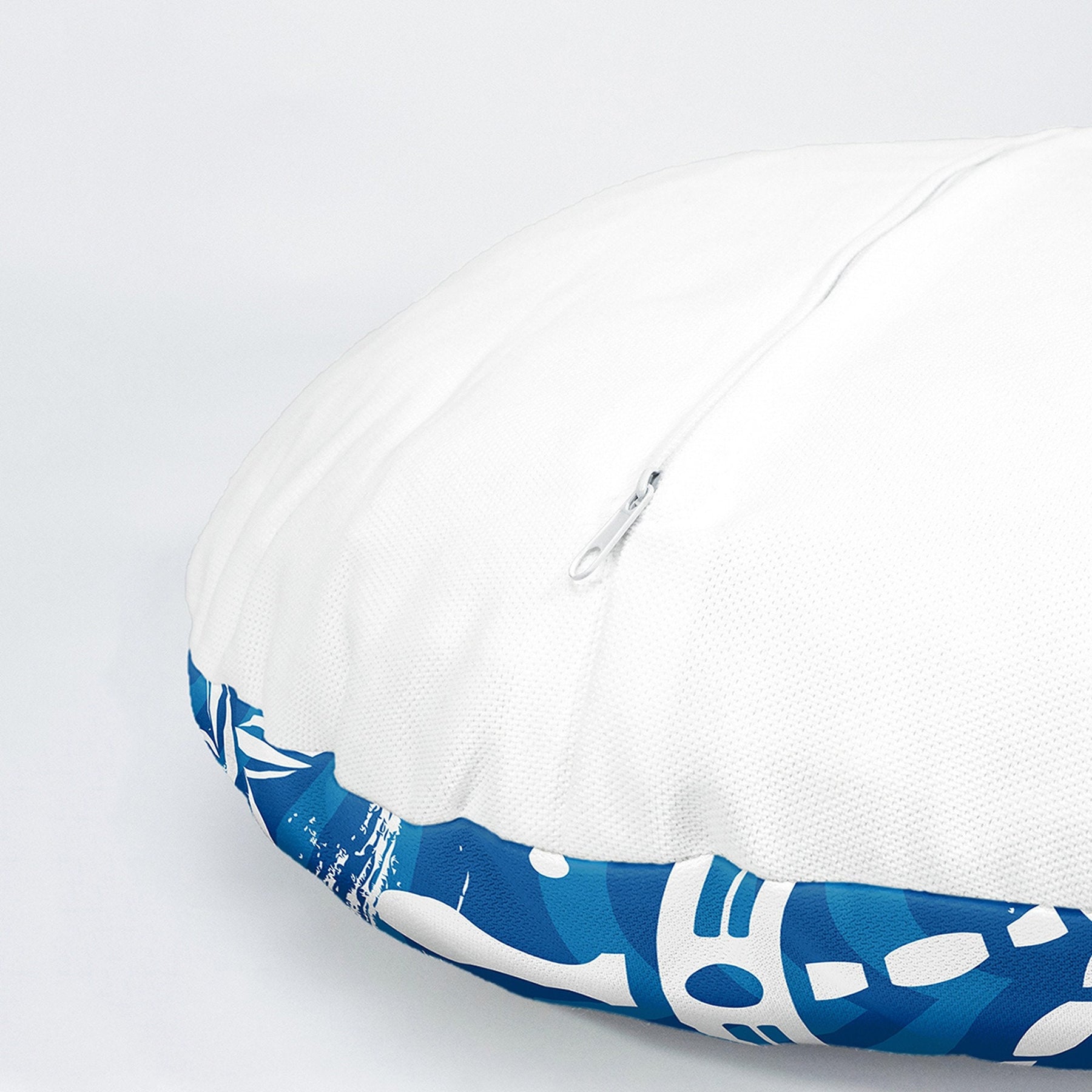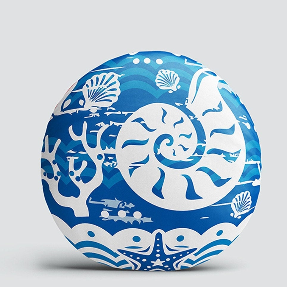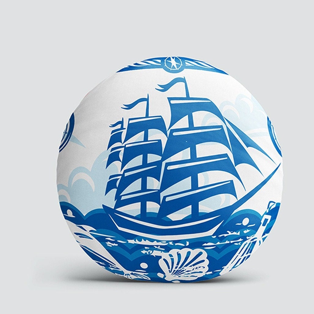 These set of 4 decorative round coastal beach house pillow covers (you can purchase as only pillow covers OR with round inserts) with Blue White Ship, Lighthouse, Wheel and Seashell prints;
