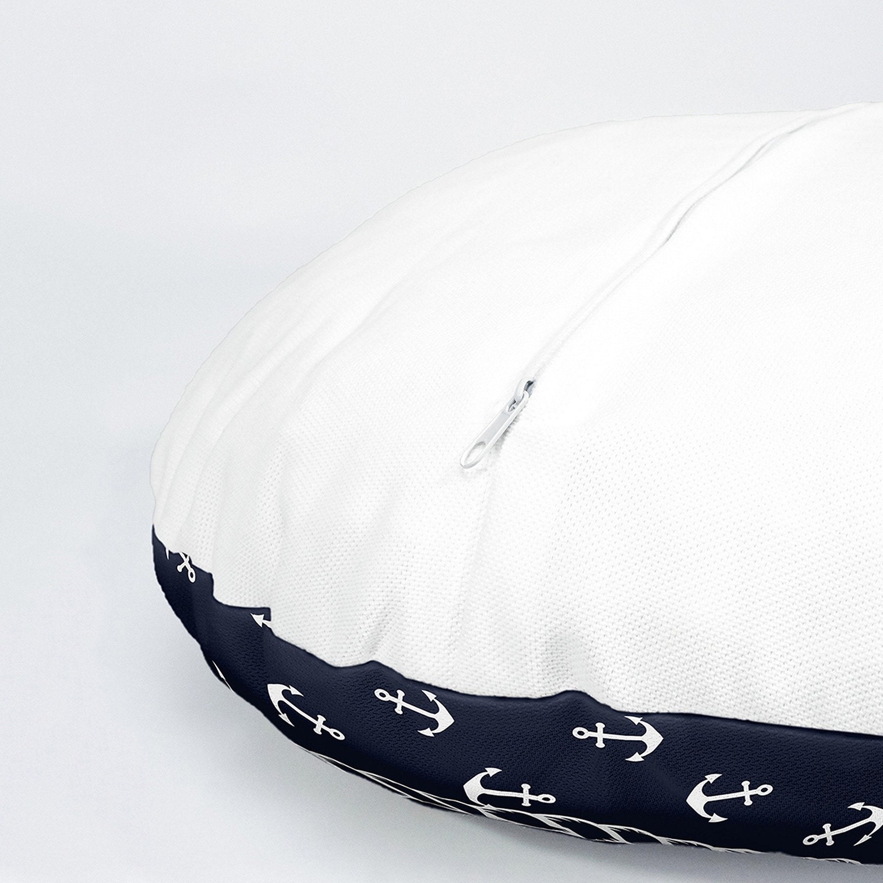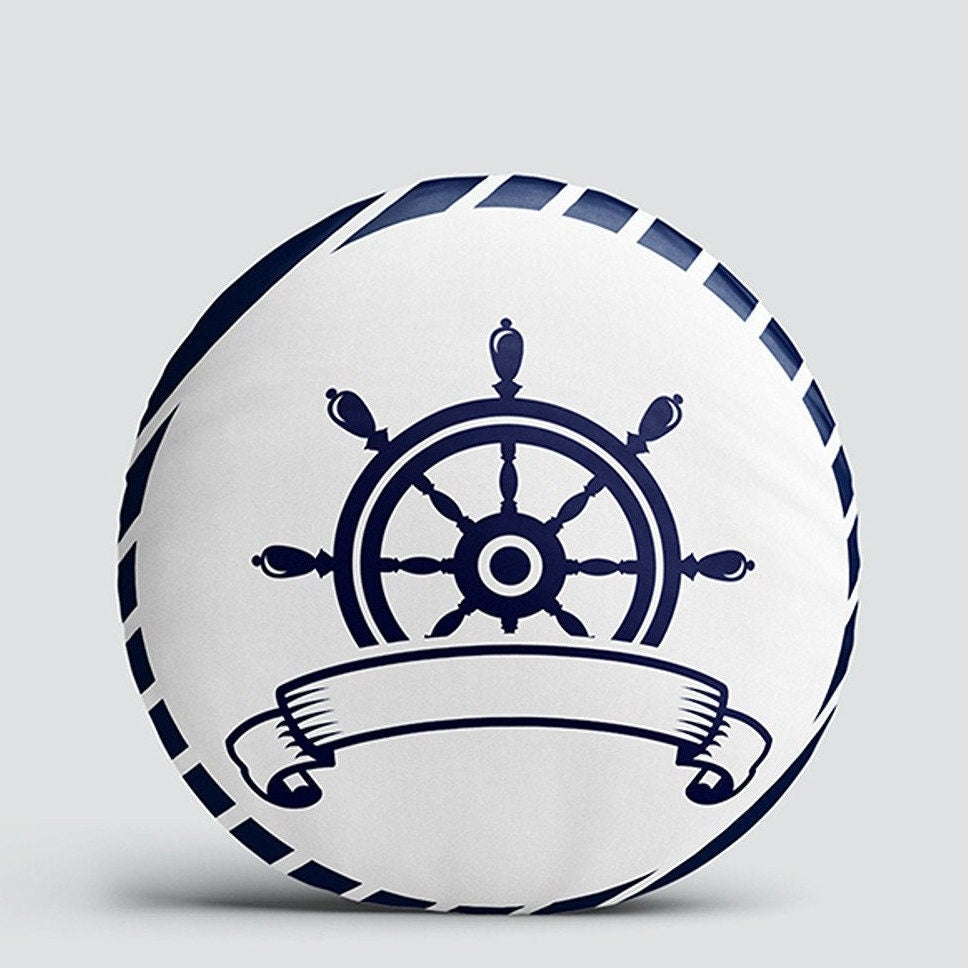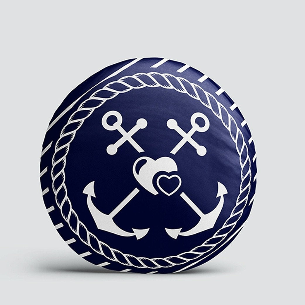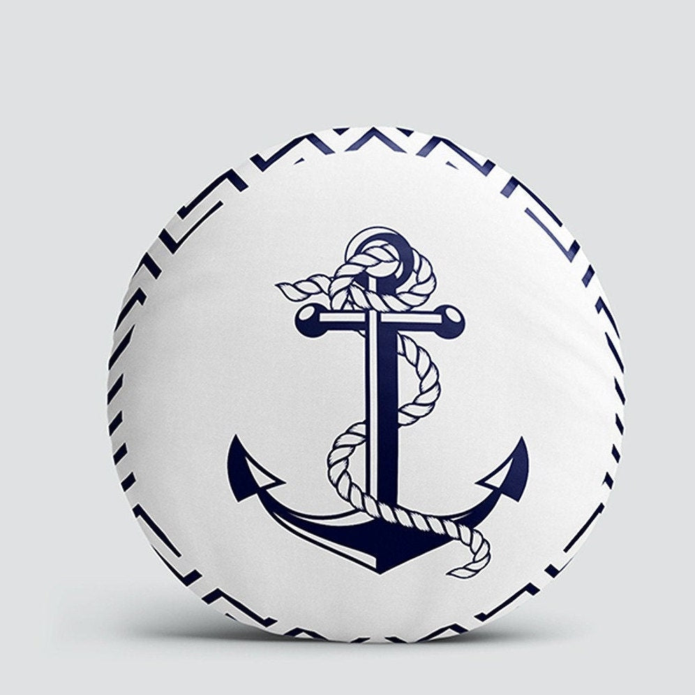 These set of 4 decorative round coastal beach house pillow covers (you can purchase as only pillow covers OR with round inserts) with Navy Blue Anchor and Wheel prints;