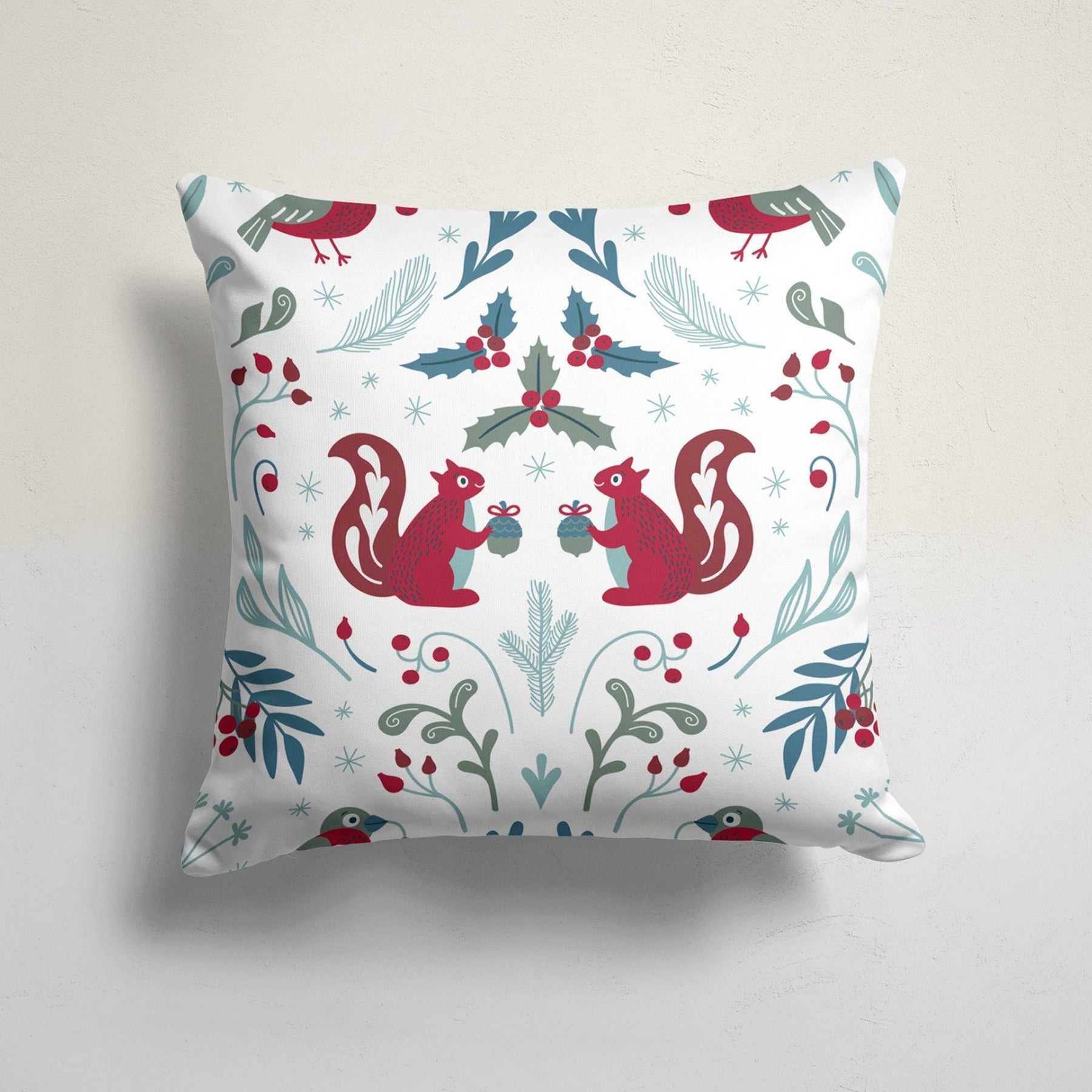 These elegant square decorative rustic farmhouse throw cushion covers with Xmas Gift Box, Pine Tree, Squirrel and Santa Claus ;