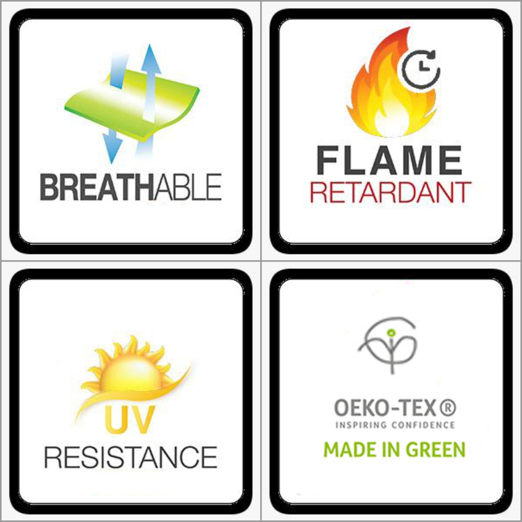 • Water repellency, easy cleaning technology, abrasion resistance, UV resistance, chlorine resistance, breathable, flame retardant