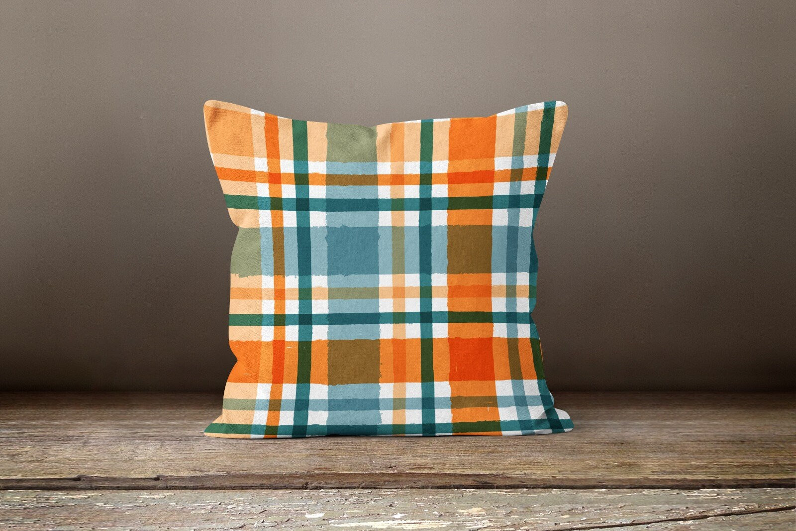 These elegant square decorative rustic farmhouse style throw cushion covers with orange leaves in basket, Happy Thanks Giving print, entrance of a village house with brown cubes, plaid design with matching fall colors;