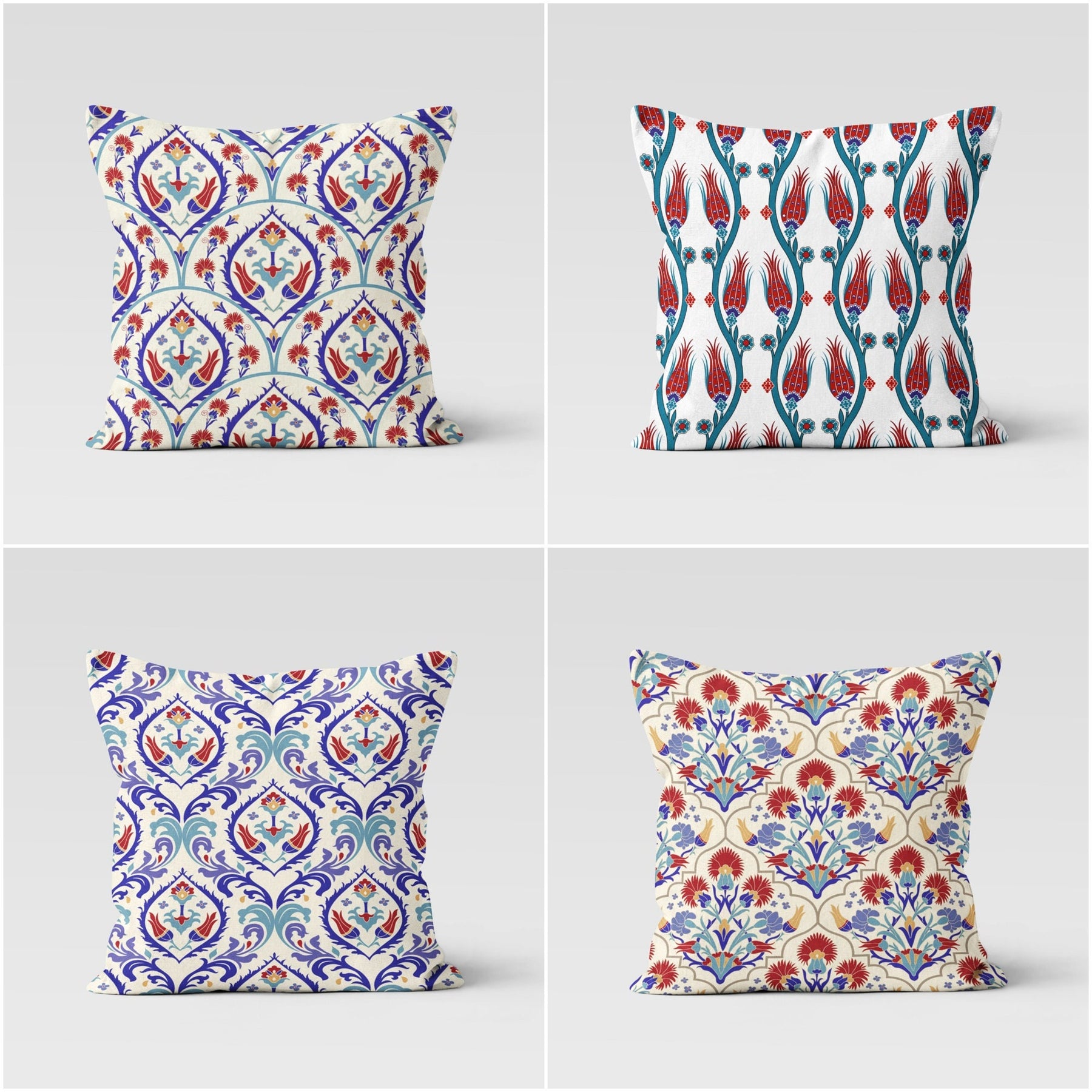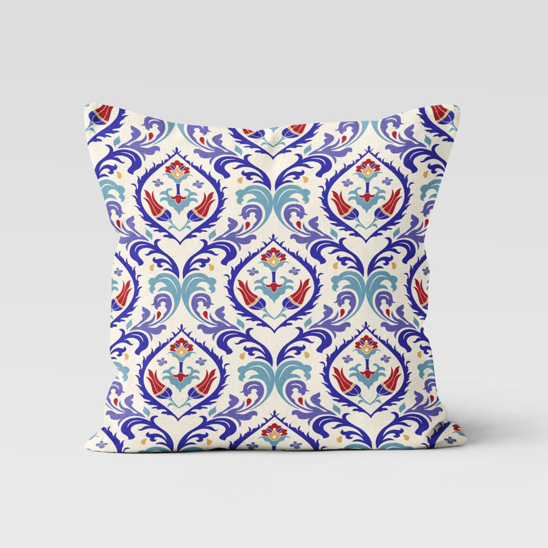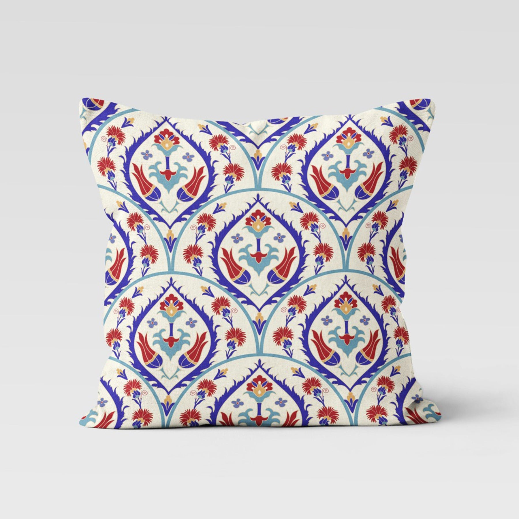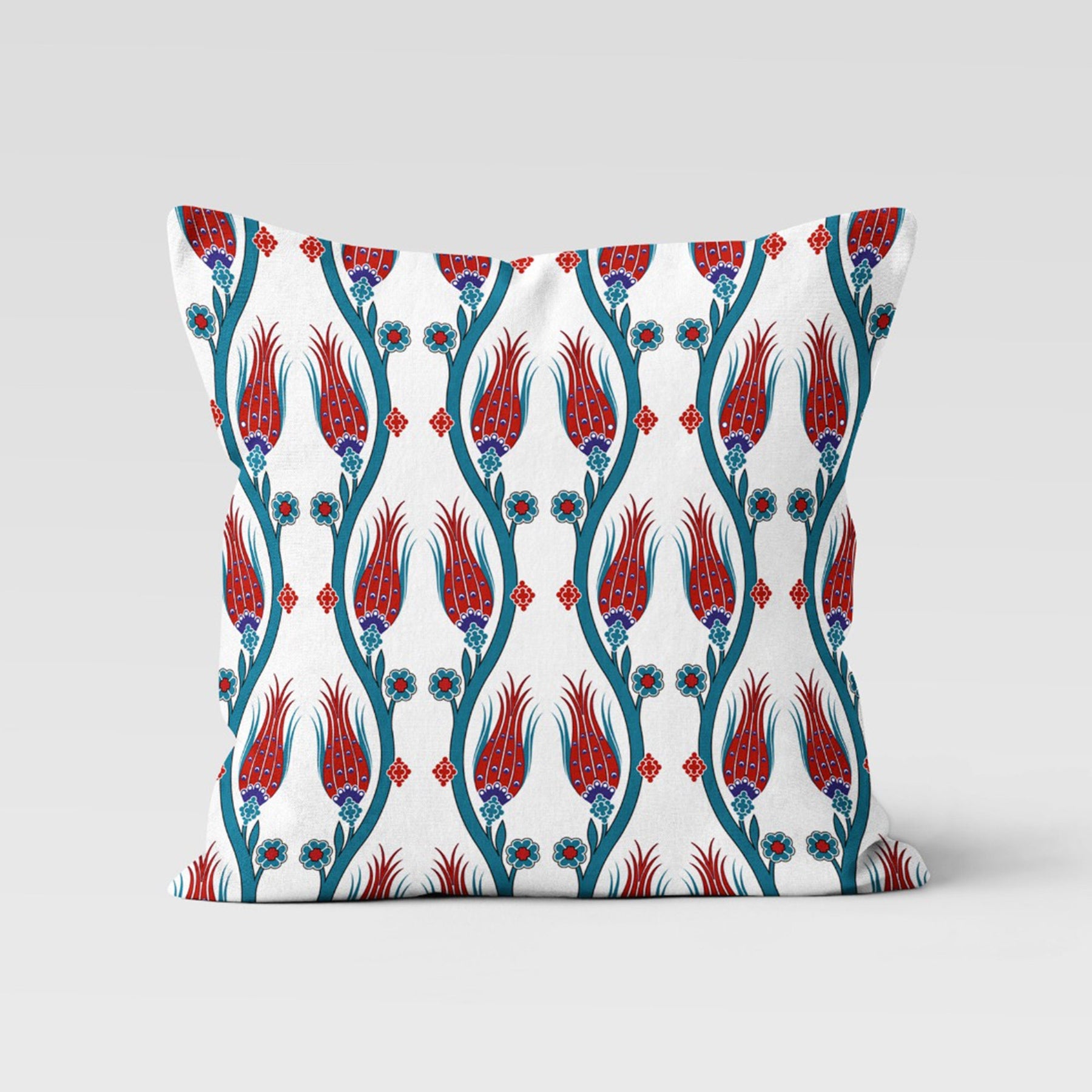 These elegant square decorative farmhouse style throw pillow covers with Turkish Tulip Tile Pattern;