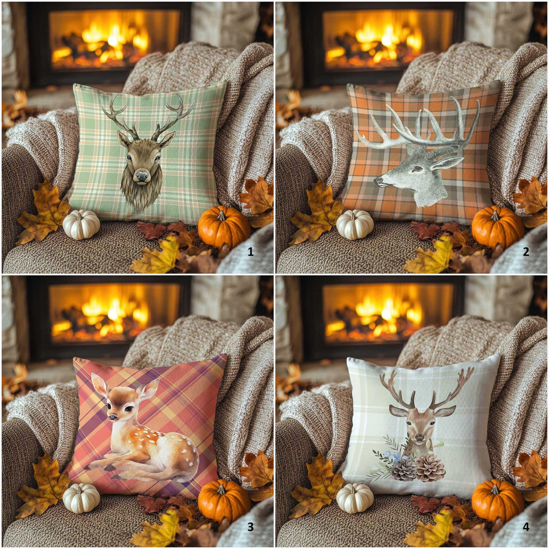 ⚓ These square decorative fall/autumn/Thanksgiving throw pillow covers with Plaid Deer prints;