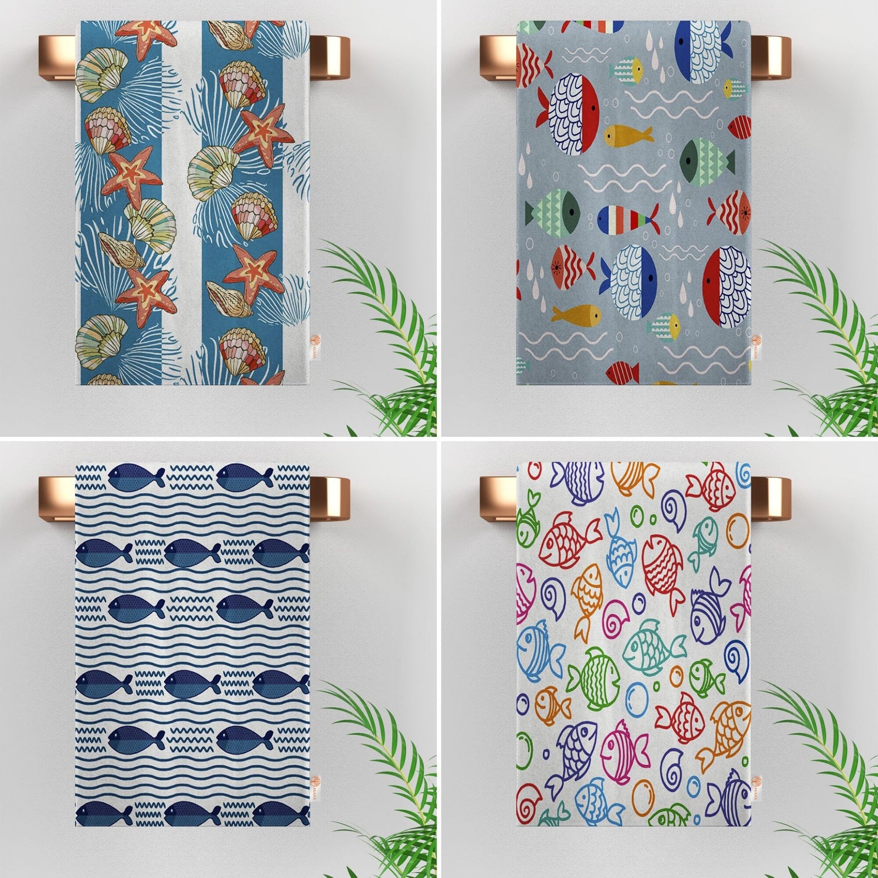 These elegant decorative rectangle kitchen/dish/hand/tea towels with colorful marine fish, seashells designs;