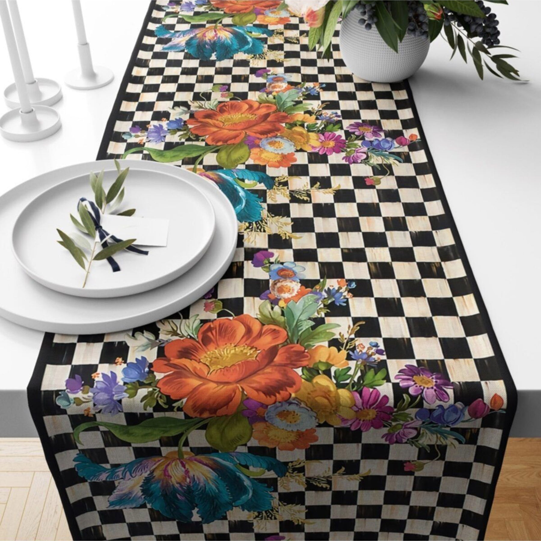 This high quality, rustic farmhouse style floral/summer trend table decor checkered floral design, flower print;