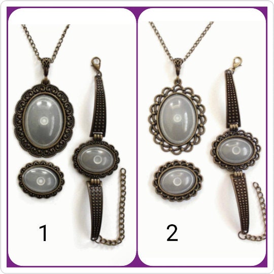 These personalized handmade vintage floral mom necklace, bracelet, and ring with tiny flowers and leaves in a round pendant: