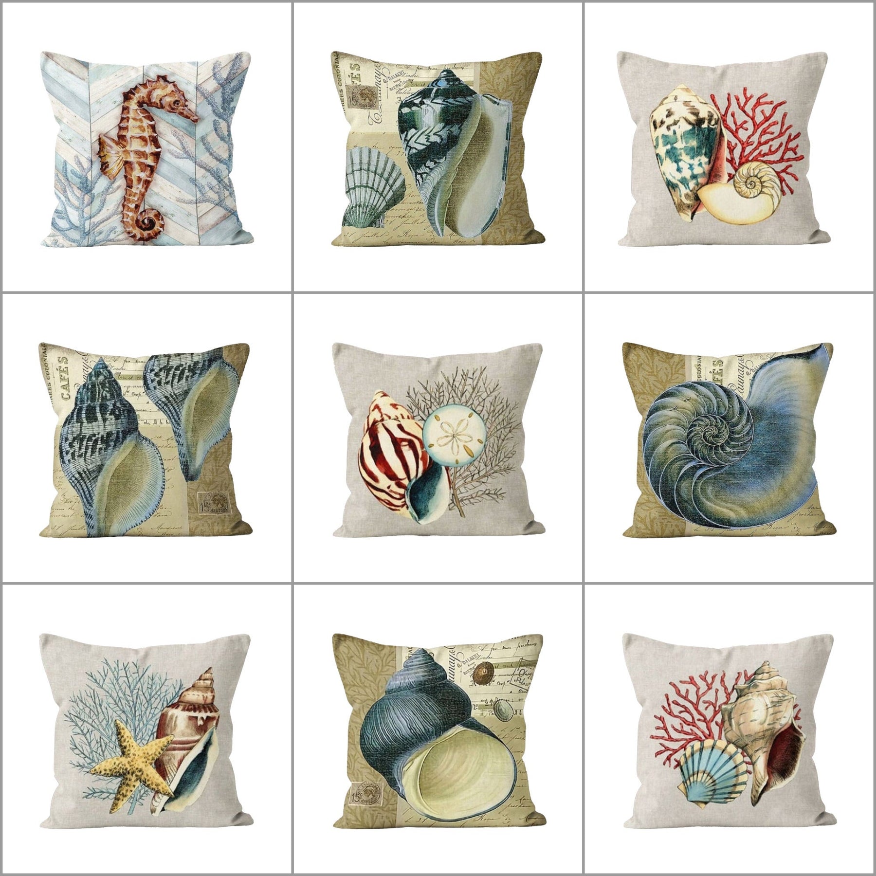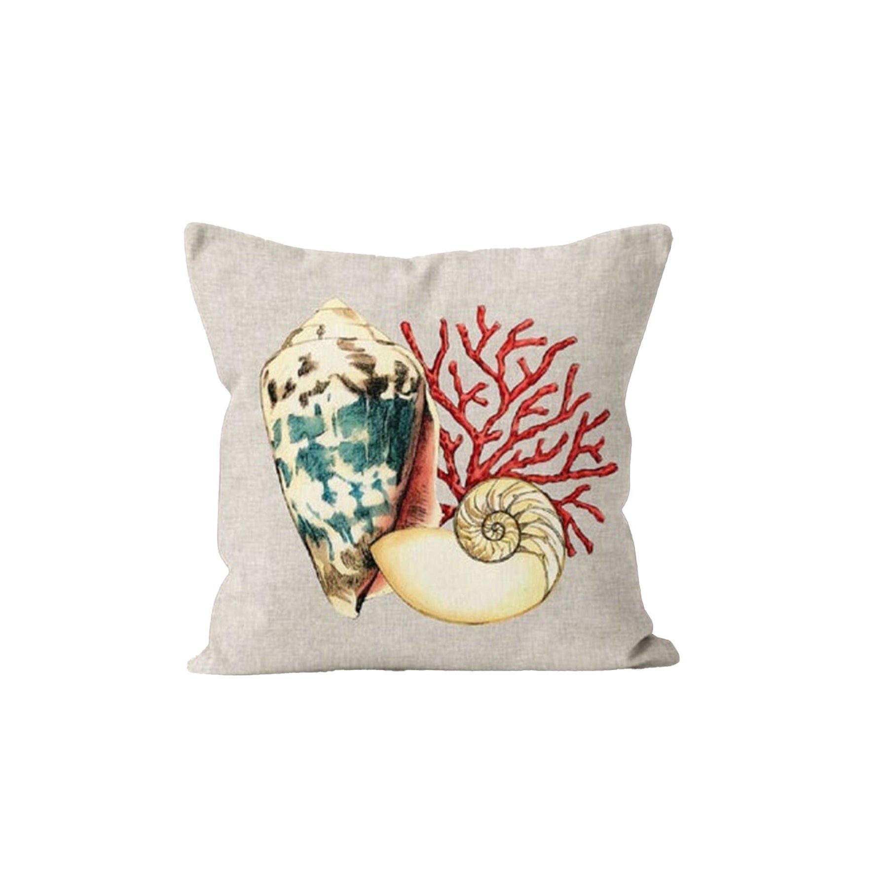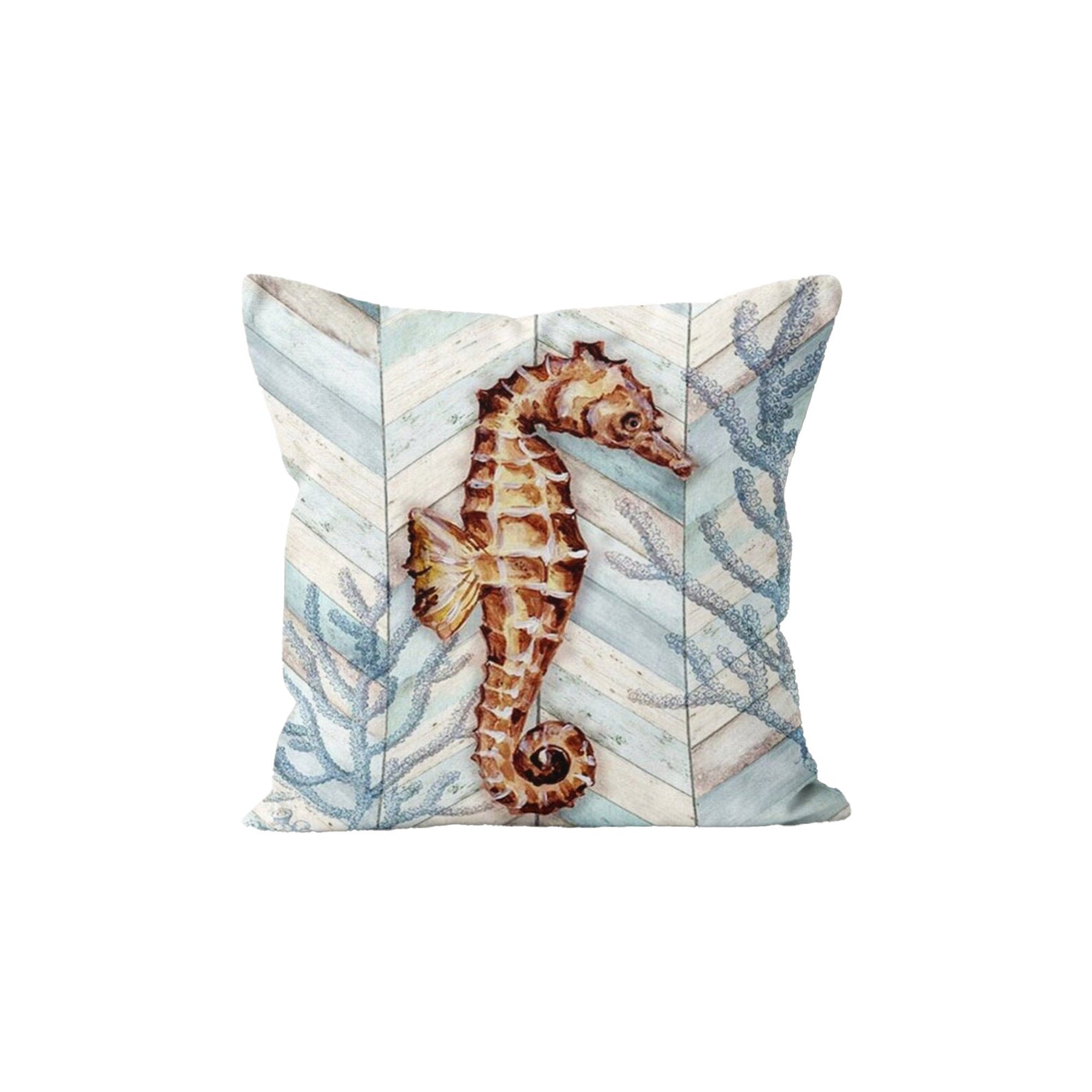 These square decorative beach house throw pillow covers with Seashell, Coral, Seahorse and Starfish print;