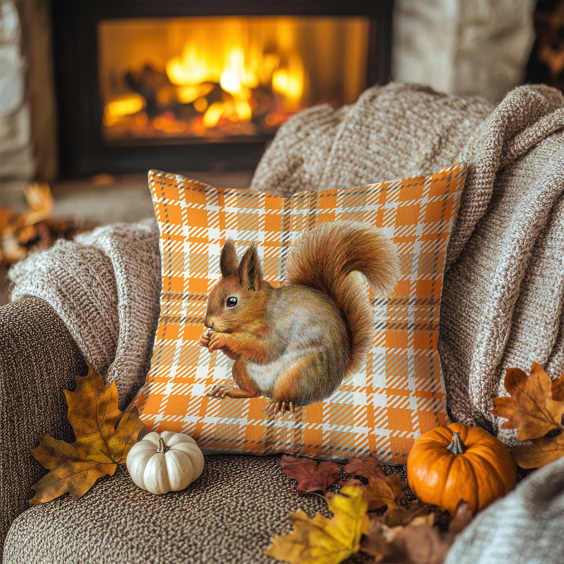 Squirrel and Leaf Print Pillowcase|Rustic Plaid Cushion Case|Fall Trend Pillow Cover|Warm Woodland Accent|Farmhouse Autumn Decor