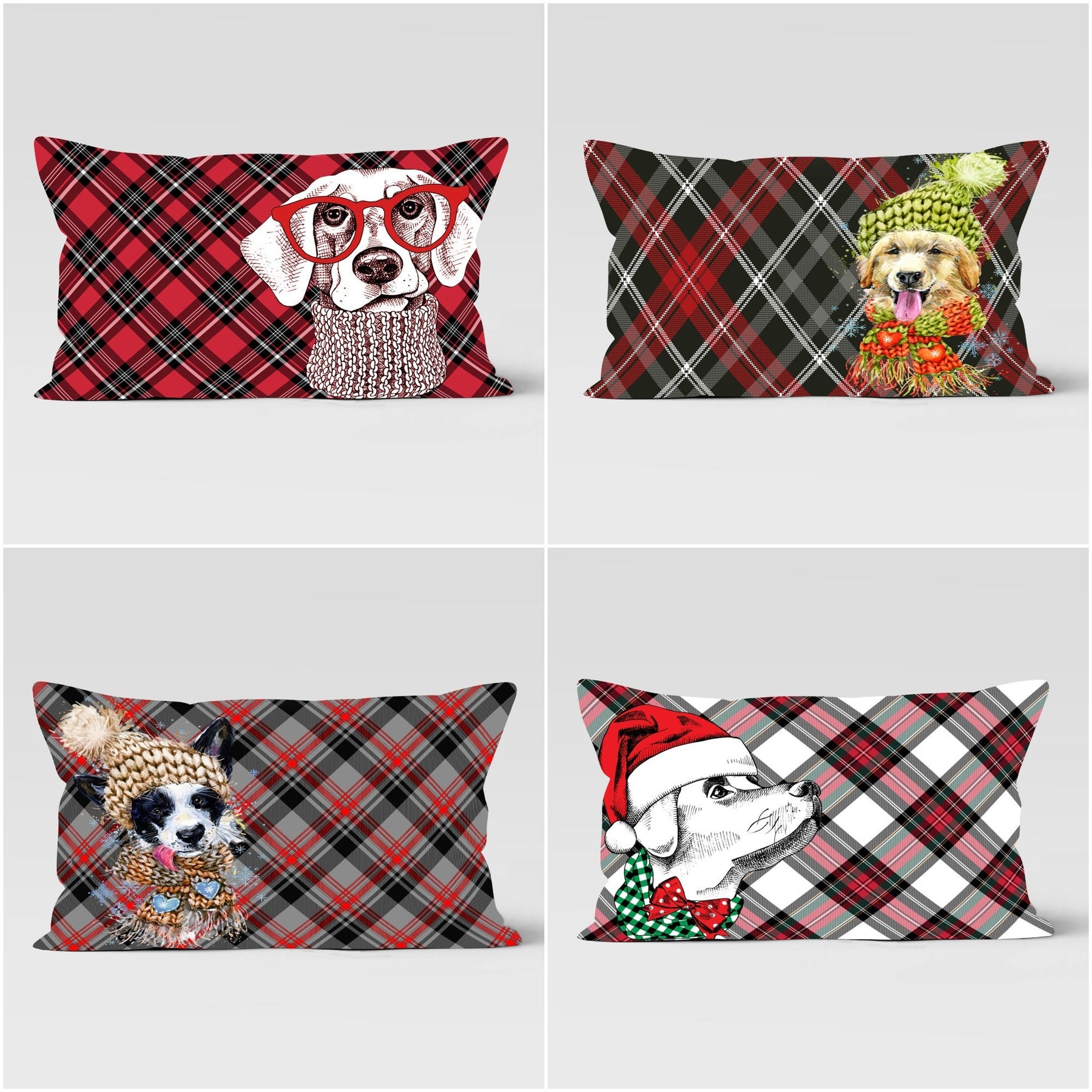 Winter Cushion Case|Dog Print Lumbar Pillowcase|Plaid Animal Home Decor|Xmas Trend Rectangle Pillow Cover|Dog with Santa Hat Cushion Cover