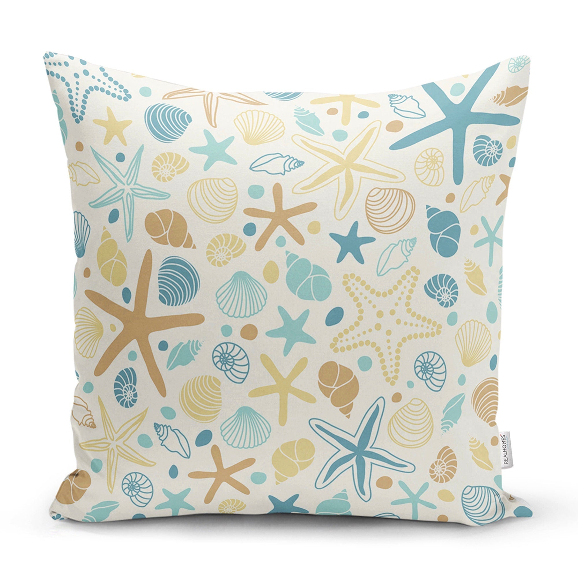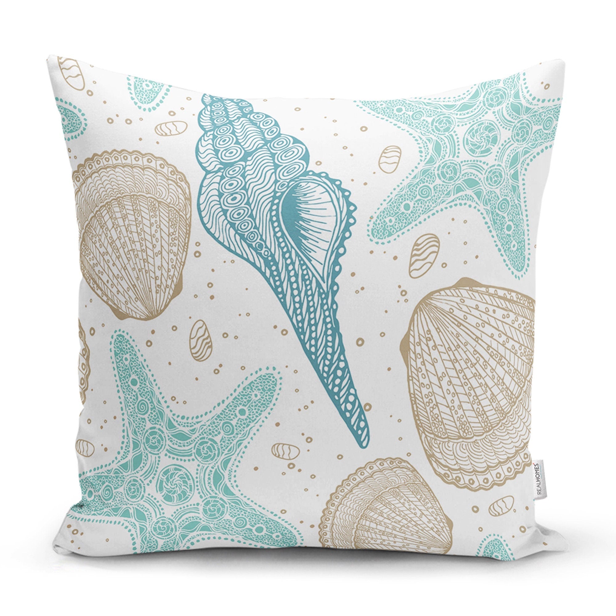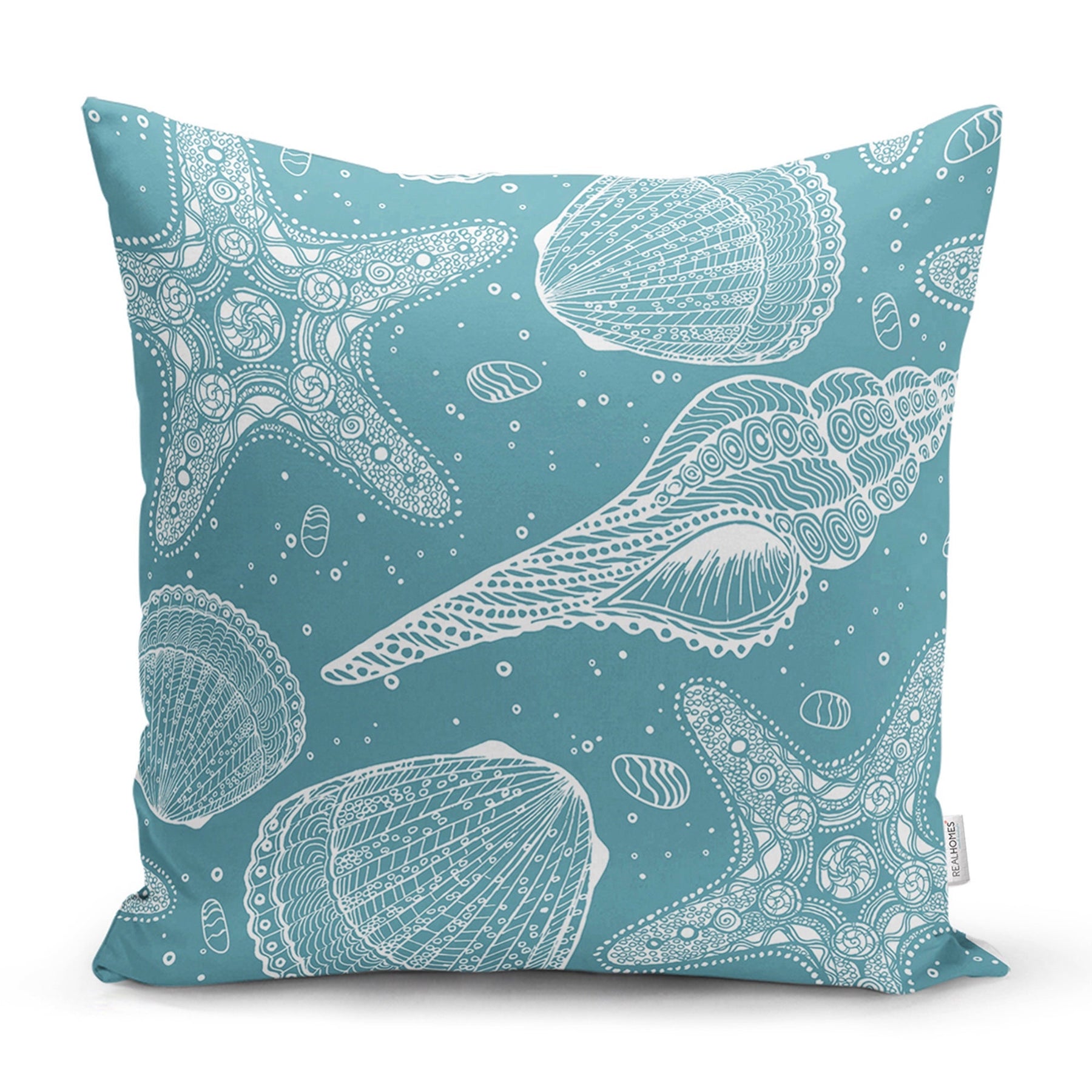 These square decorative blue, beige and turquoise beach house throw pillow covers with shells and starfish;
