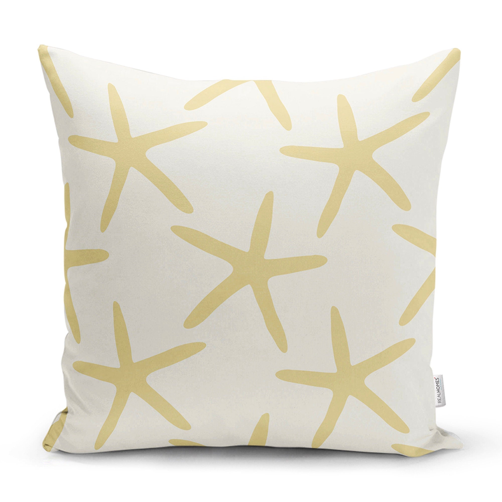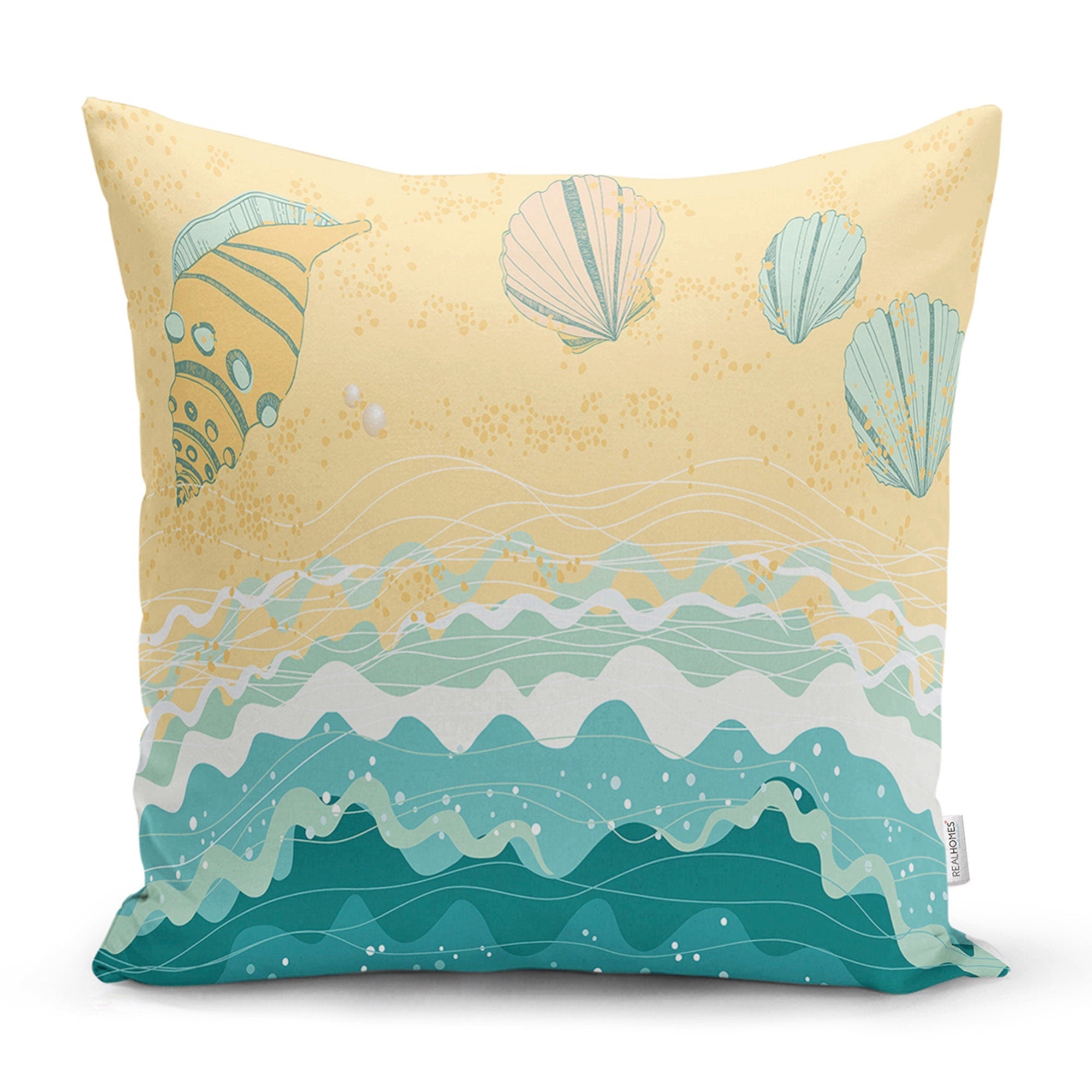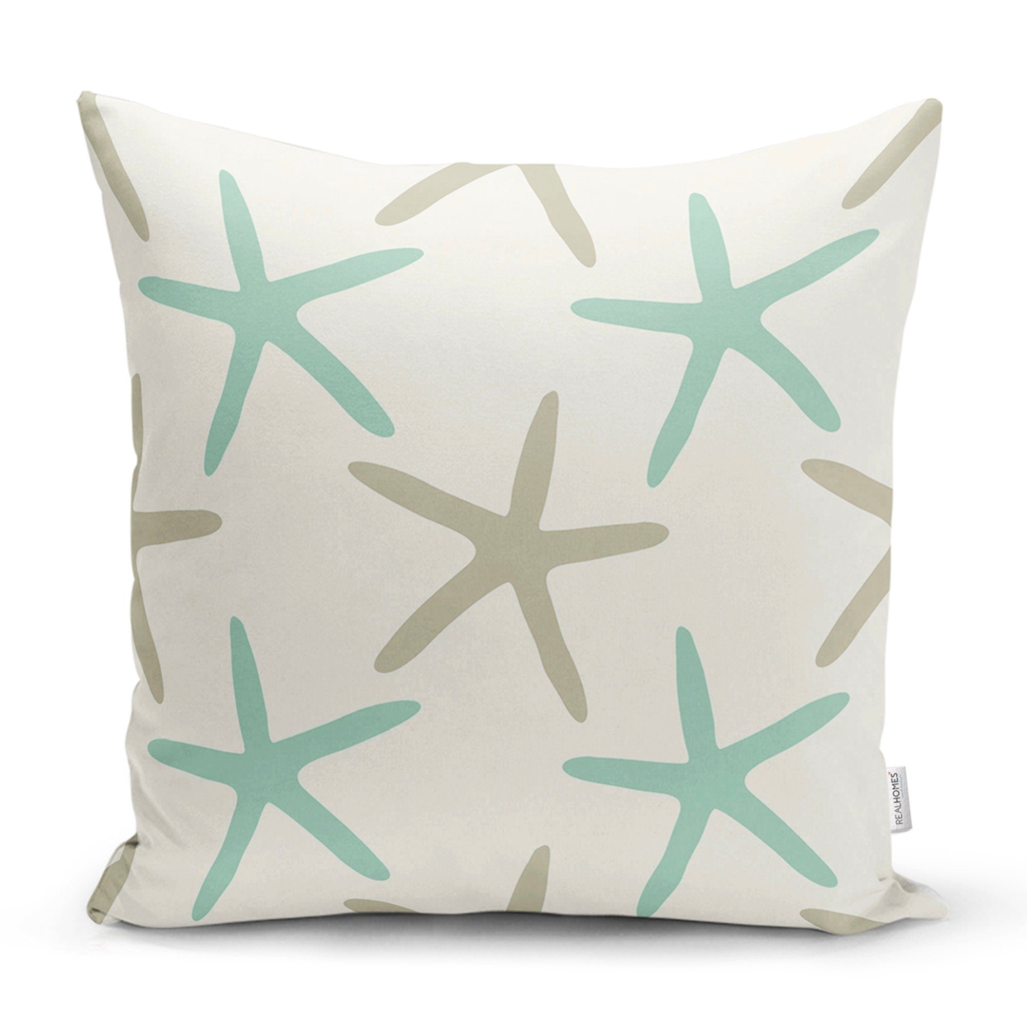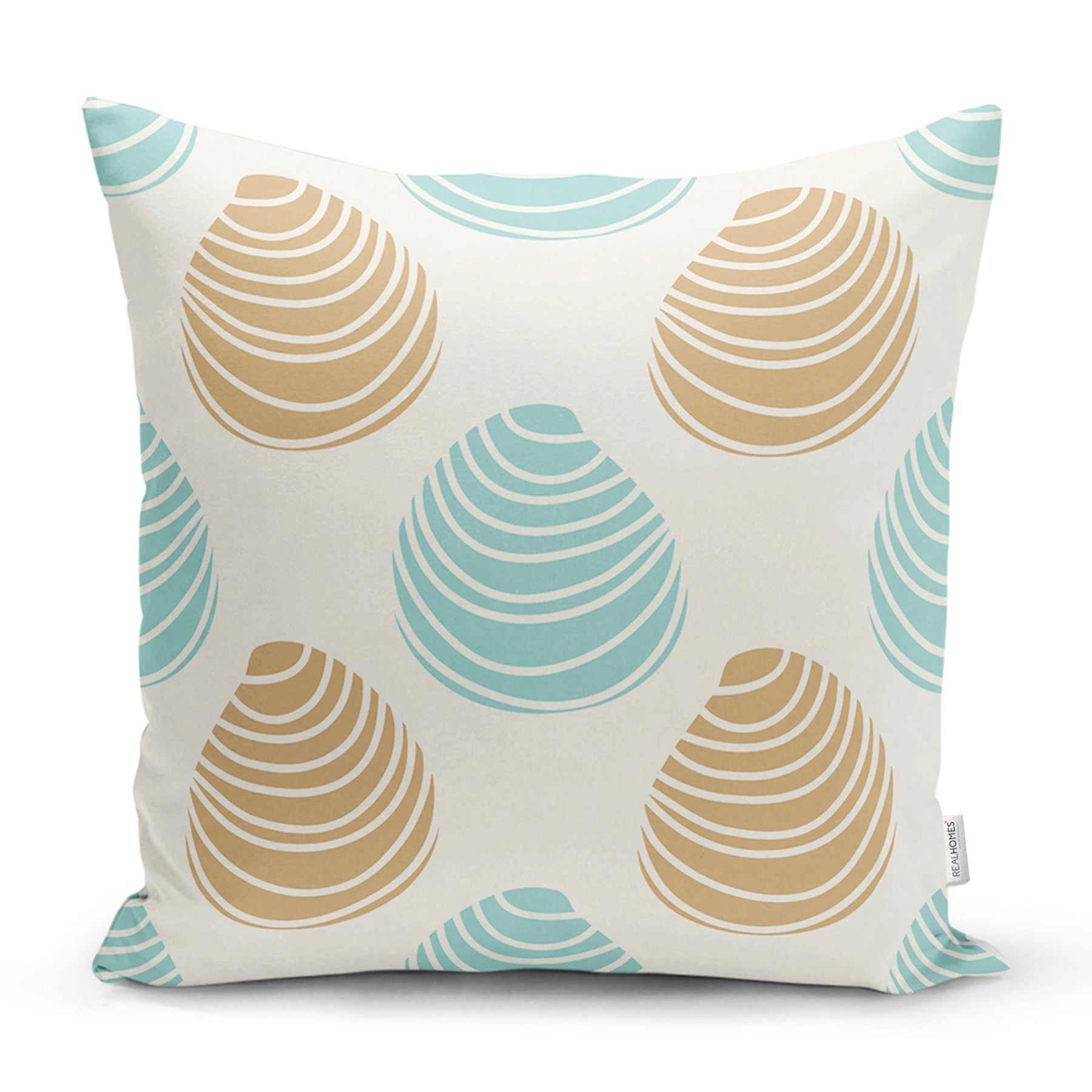 These square decorative blue, beige and turquoise beach house throw pillow covers with shells and starfish;