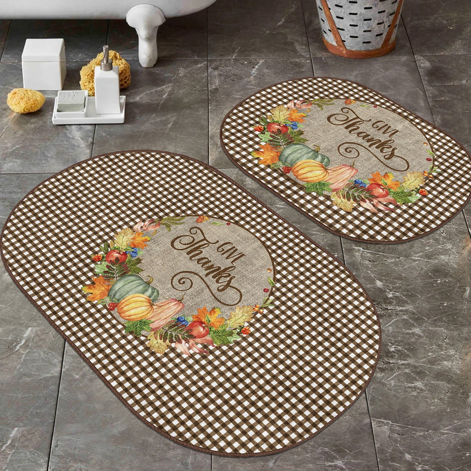 These elegant oval bathroom/kitchen floor mats with Orange Green Brown Pumpkin, Welcome, Harvest Blessings, Give Thanks and Hello Fall prints on polkadot and plaid backgrounds;
