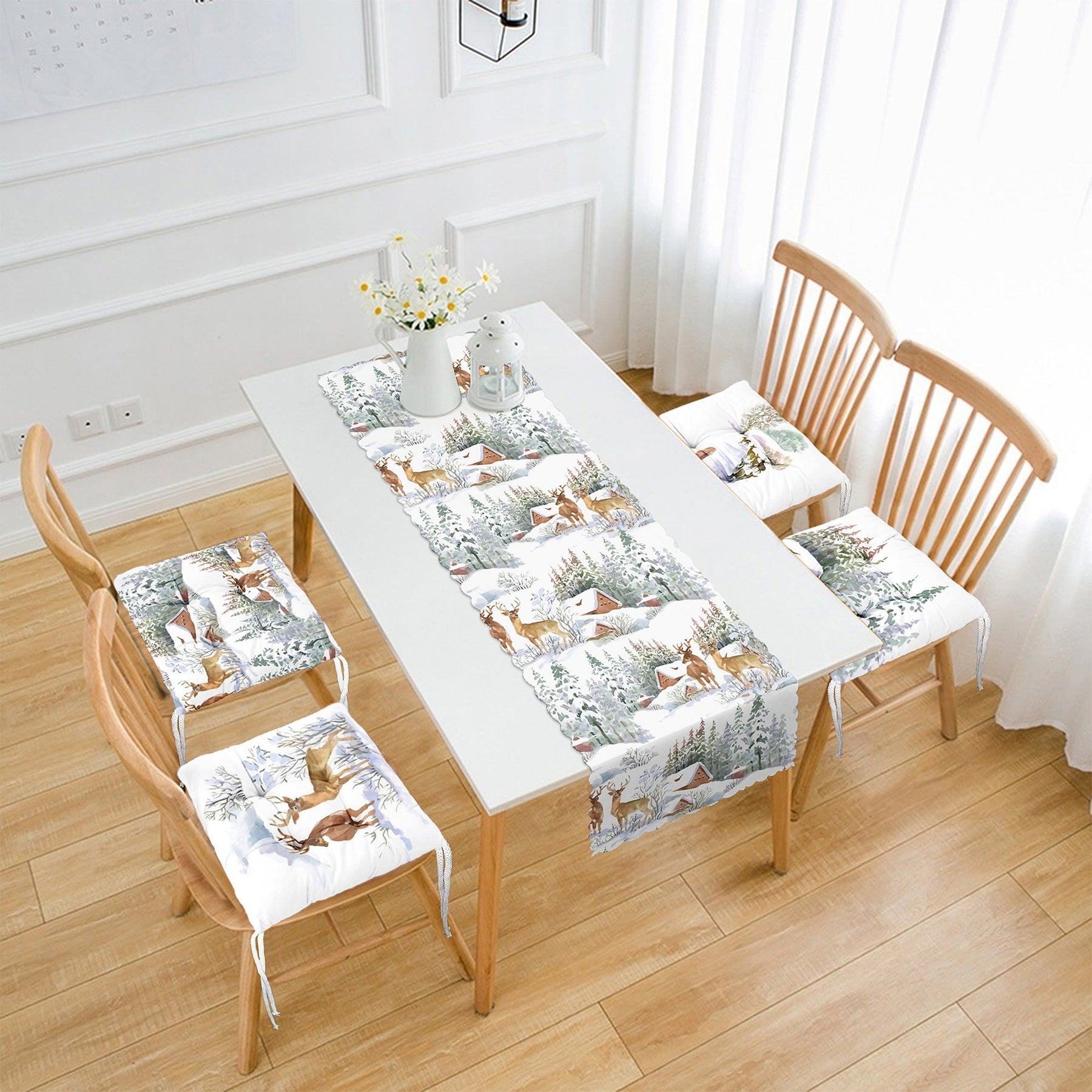 These elegant winter trend/Xmas themed chair cushions and table runner set (including 4 chair cushions and 1 runner) with Snow, House, Pine Tree and Deer;