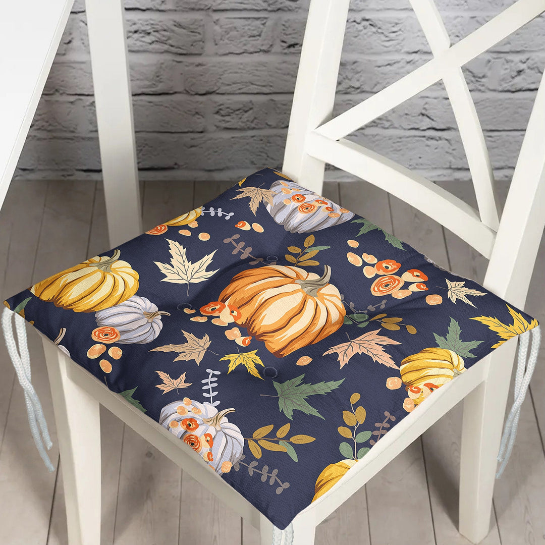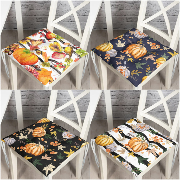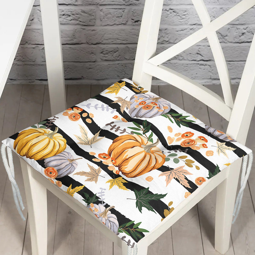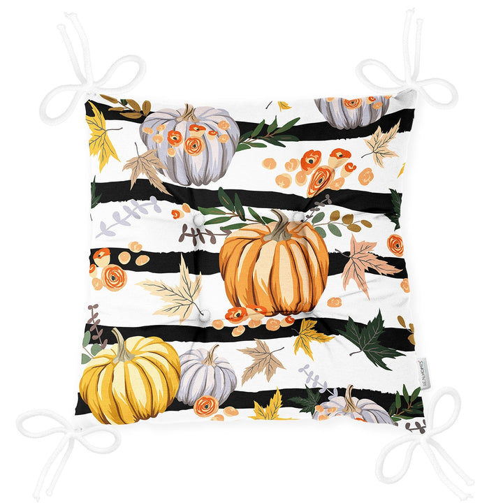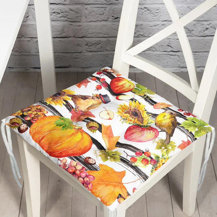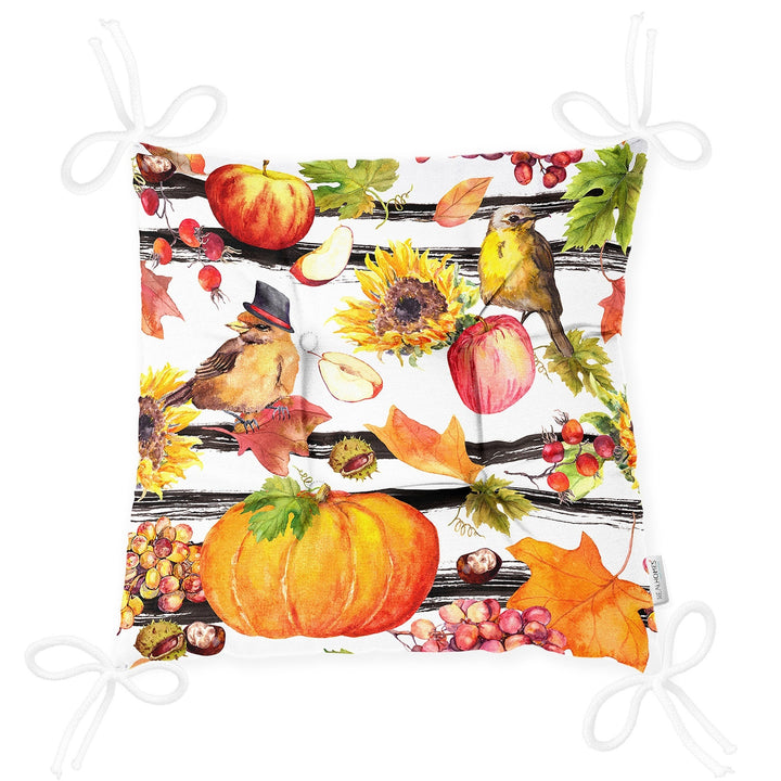 These elegant square decorative one-sided coastal puffy chair pads with orange, gray pumpkin, sunflower, bird and fruit prints with striped design;