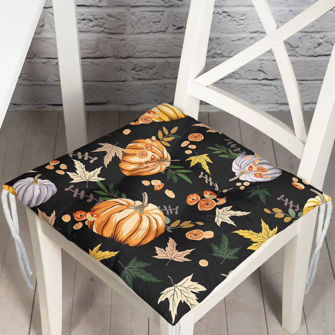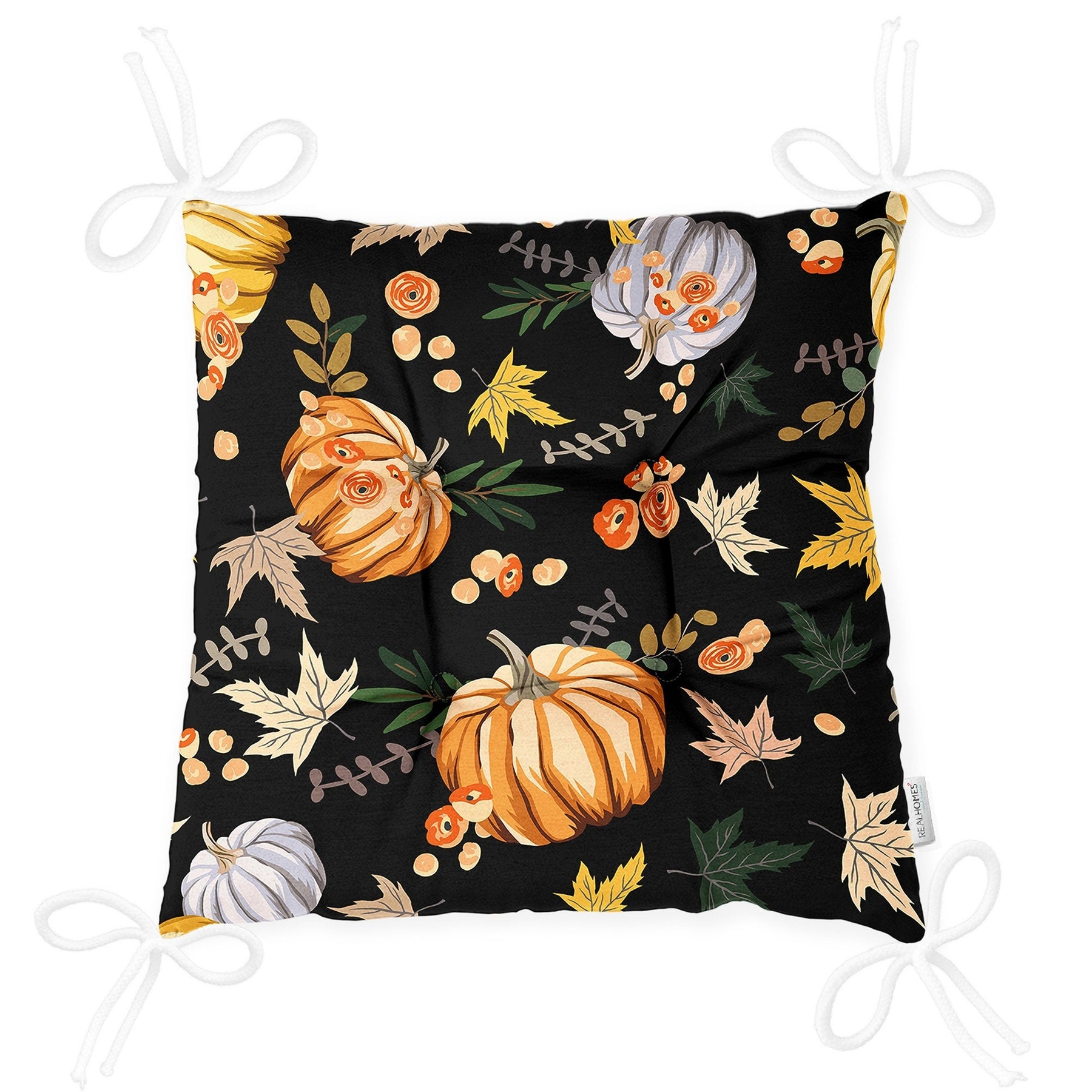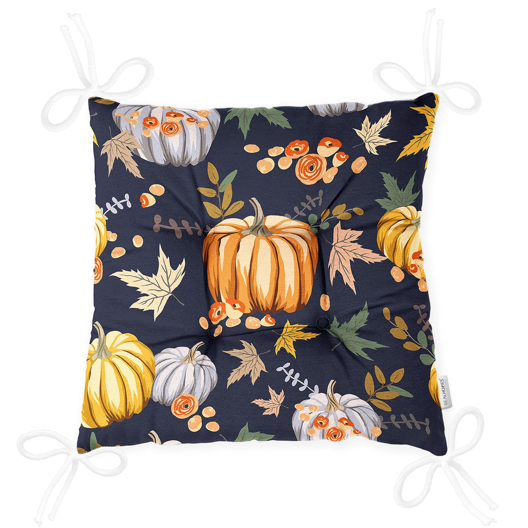 These elegant square decorative one-sided coastal puffy chair pads with orange, gray pumpkin, sunflower, bird and fruit prints with striped design;