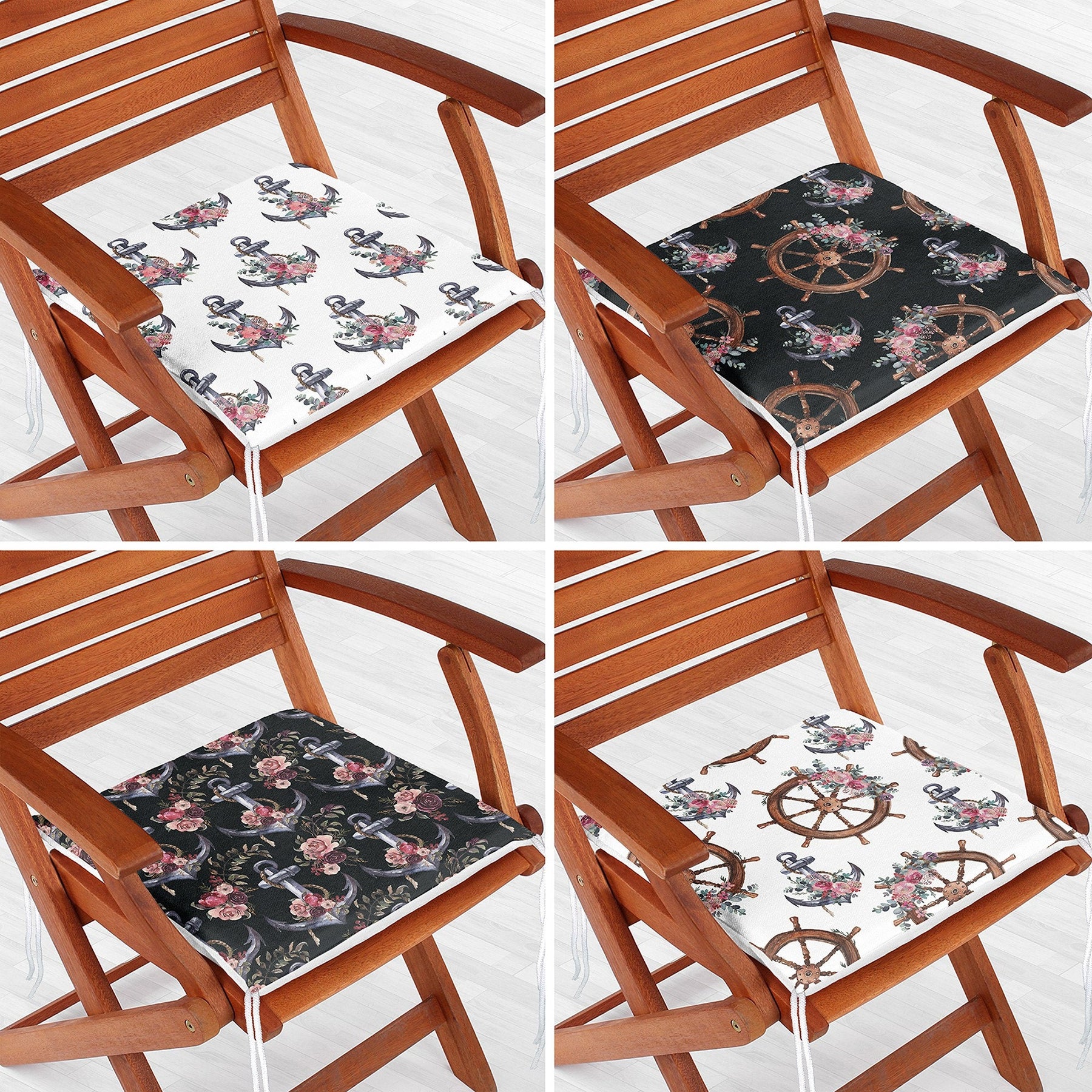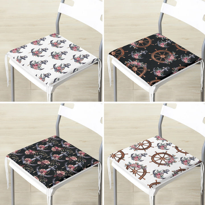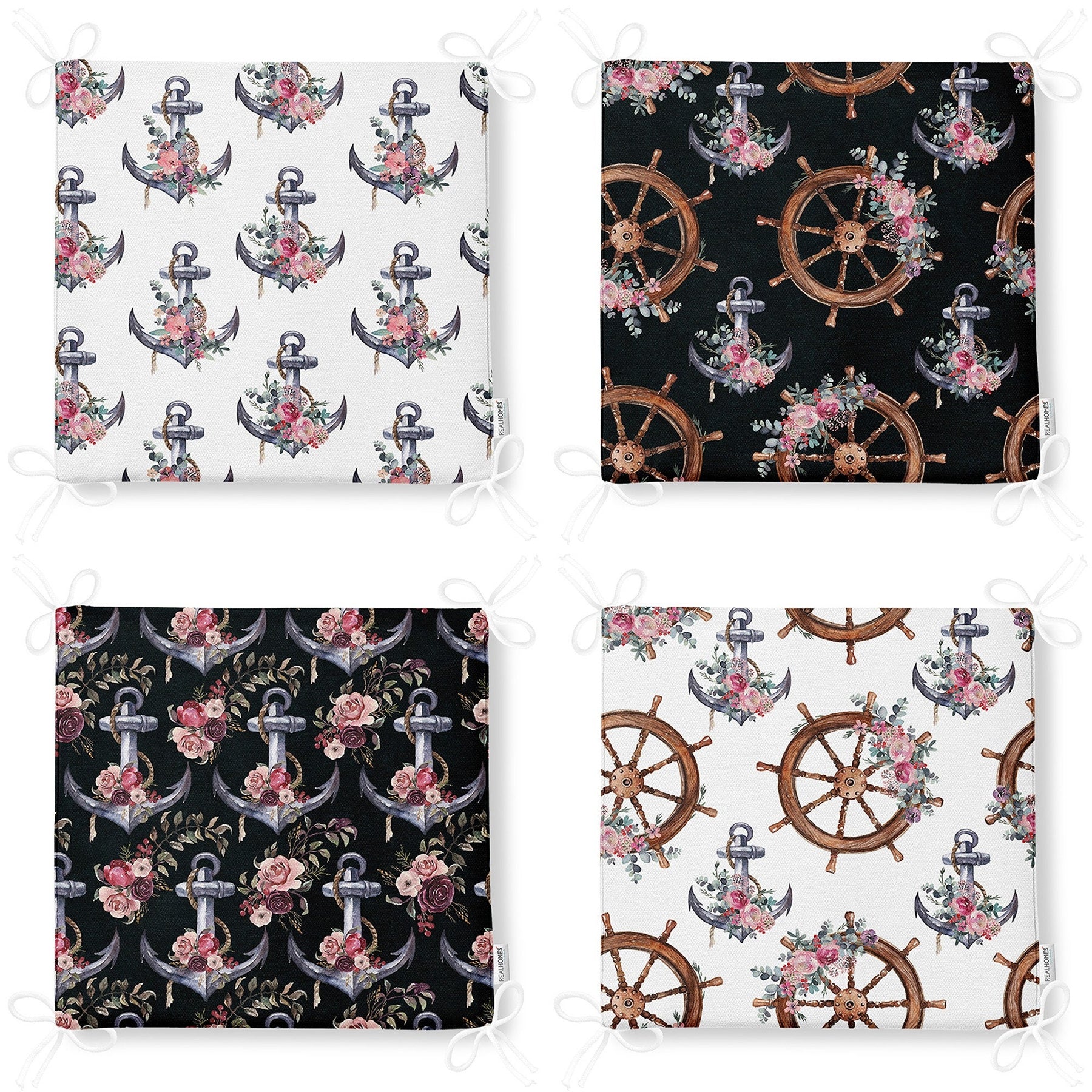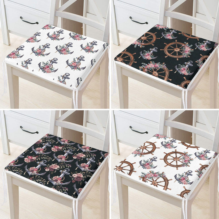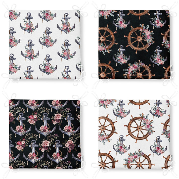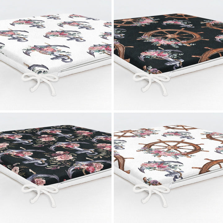 These elegant square decorative one-sided Set of 4 nautical chair pads with Floral Anchor and Wheel Print;