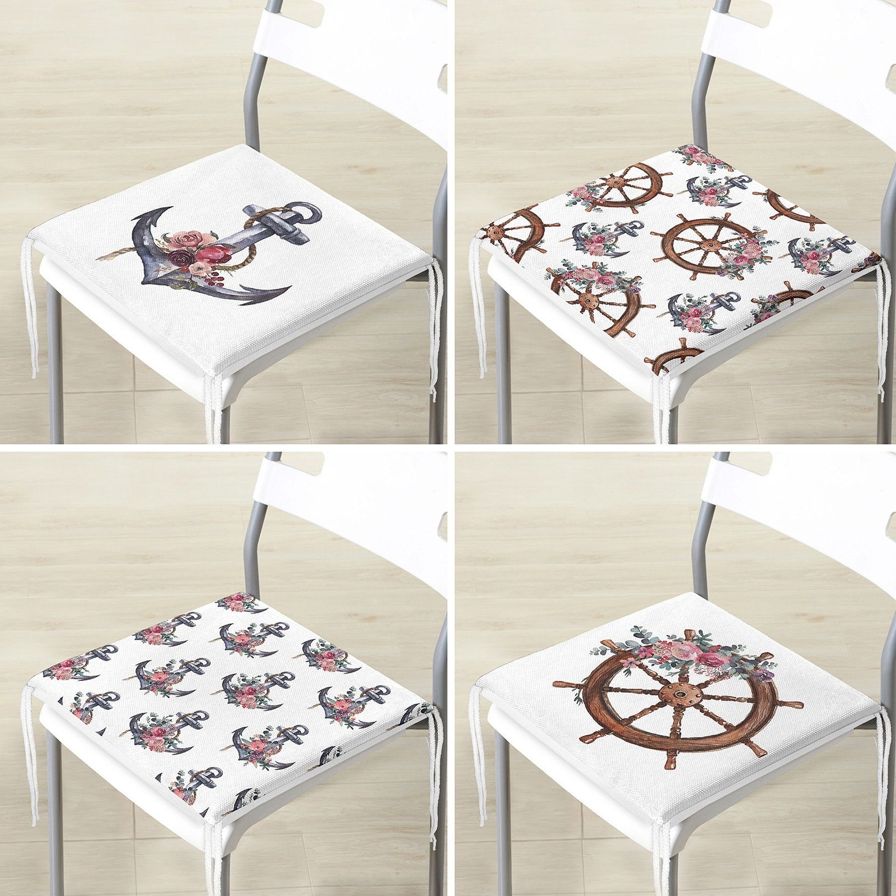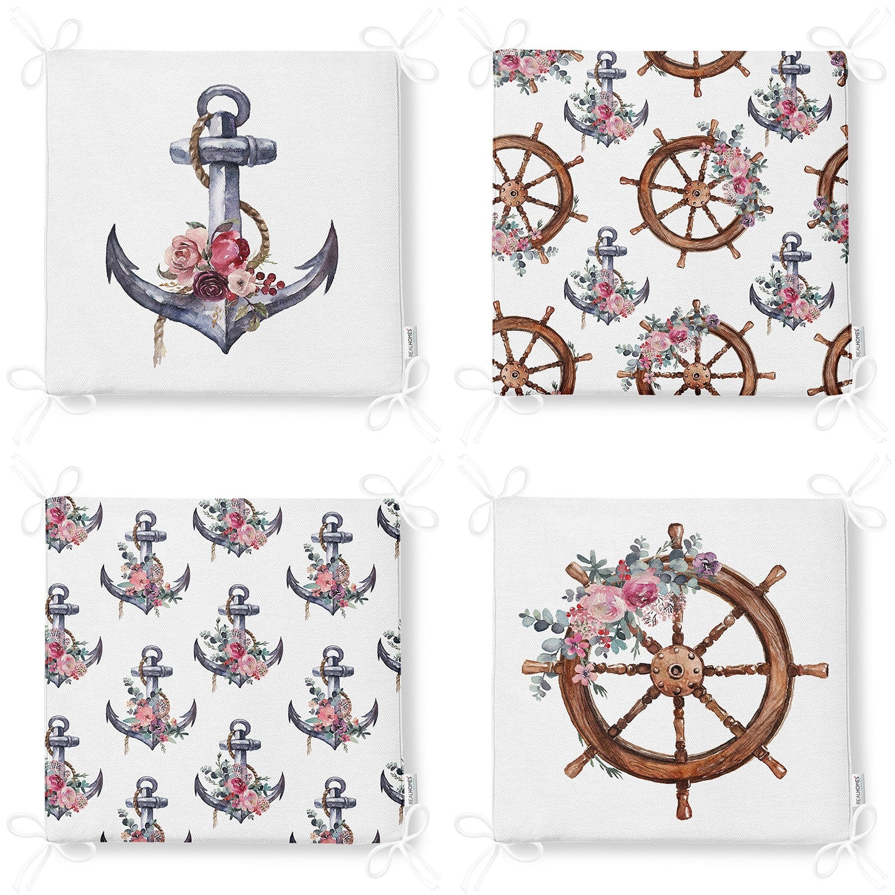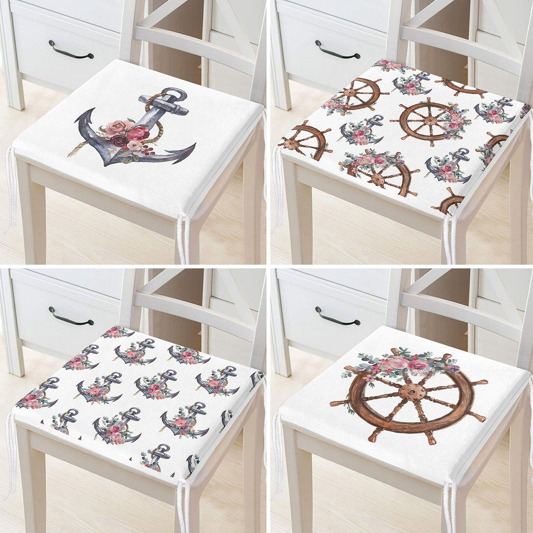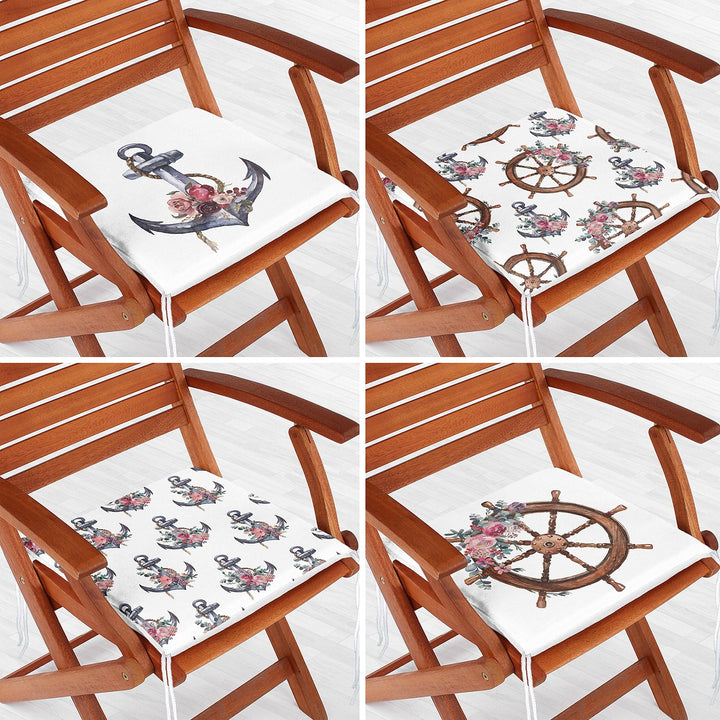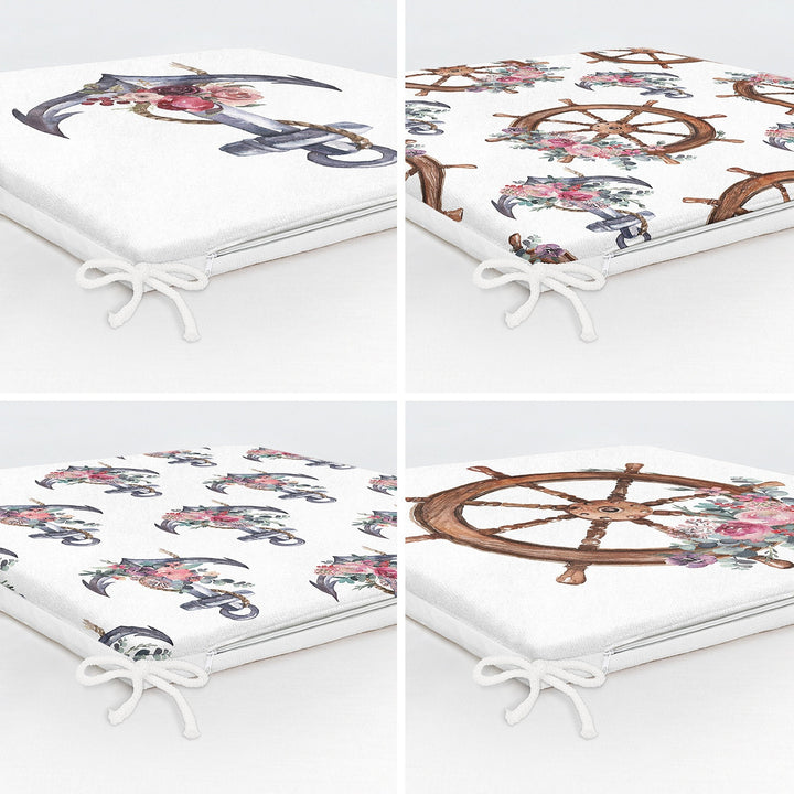 These elegant square decorative one-sided Set of 4 nautical chair pads with Floral Anchor and Wheel Print;