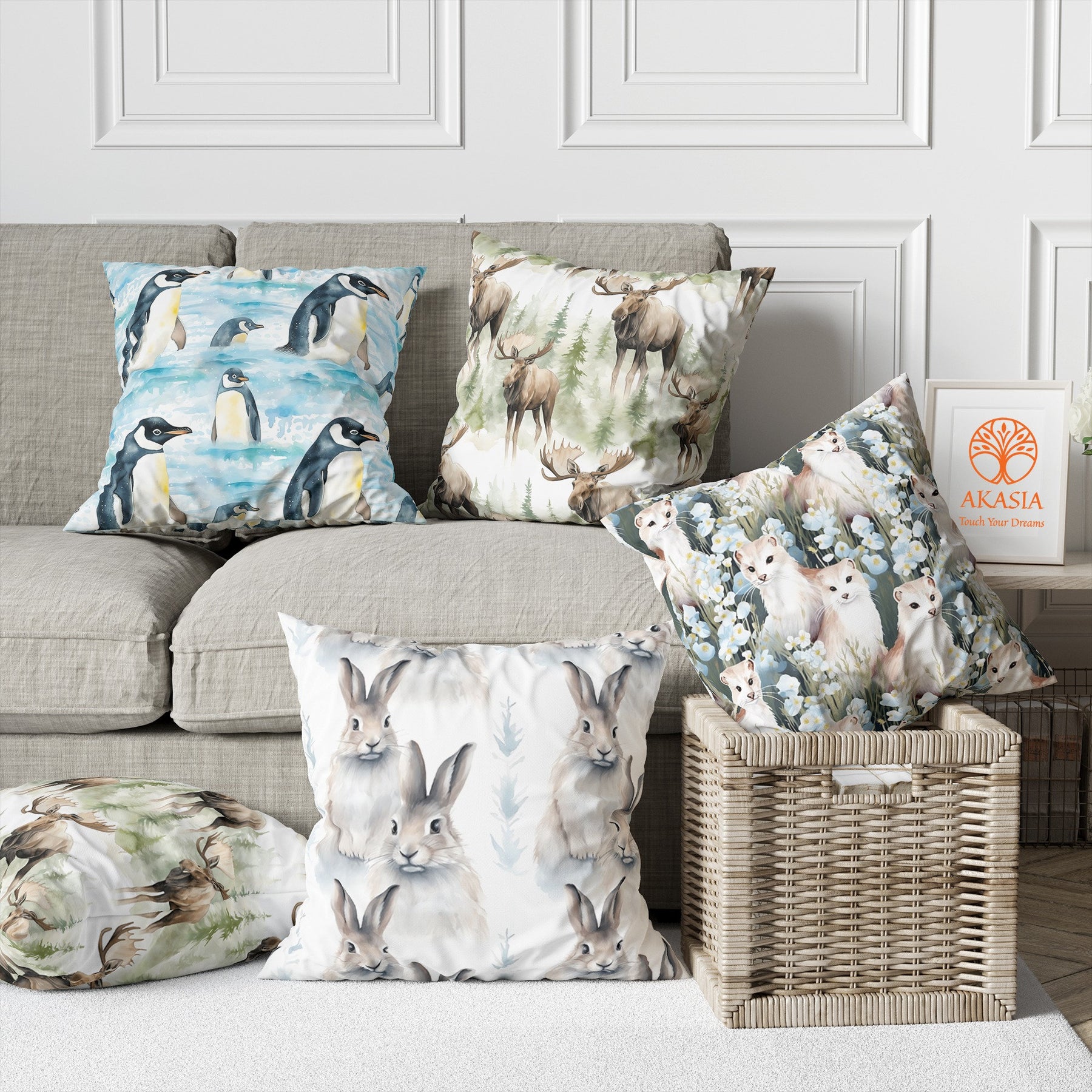 Animal Print Winter Cushion Cover|Penguin Throw Pillowtop|Winter Pillow Cover|Reindeer Porch Decor|Xmas Pillow Case|Rabbit Cushion Case
