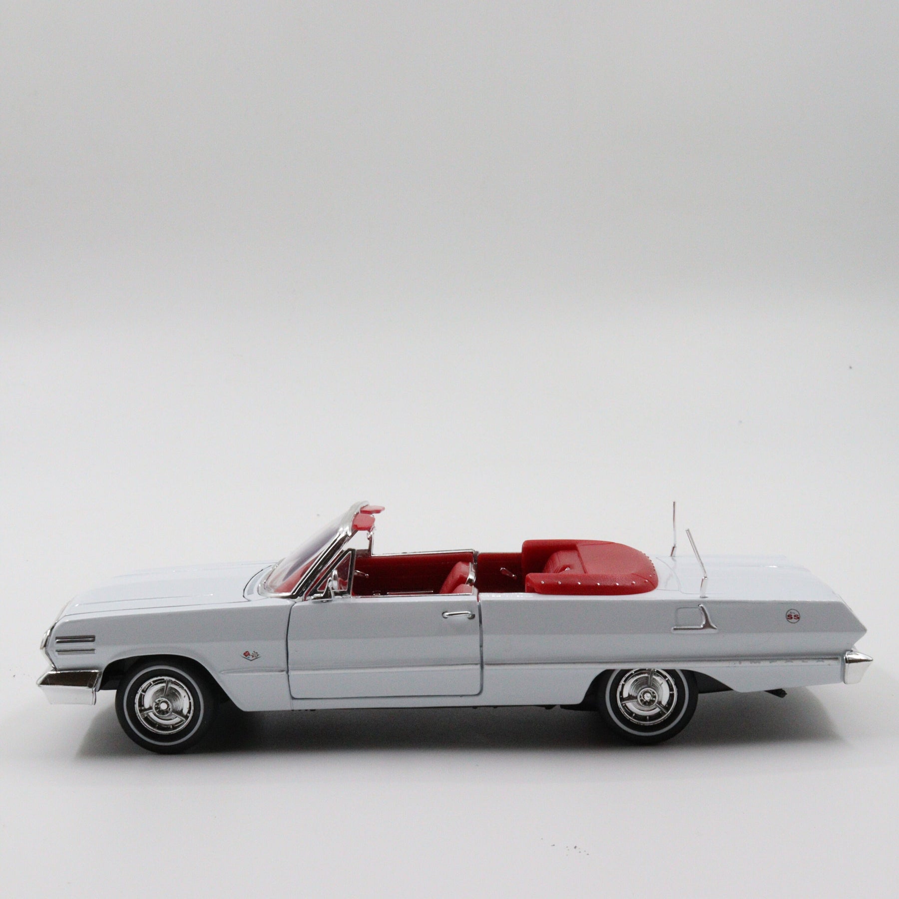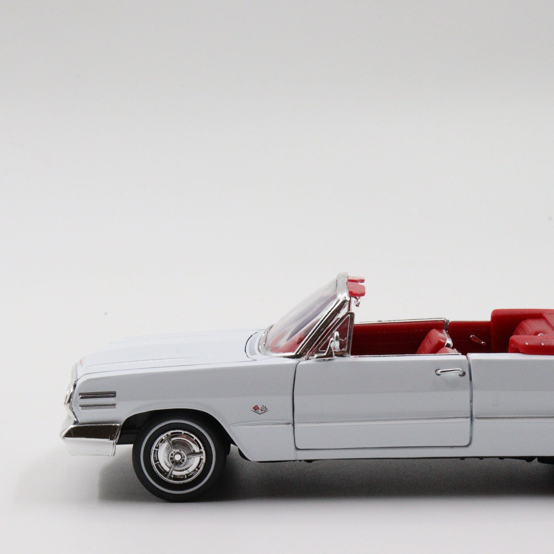 - This unique classic model convertible car in white and red color has a metal body and rubber tires.