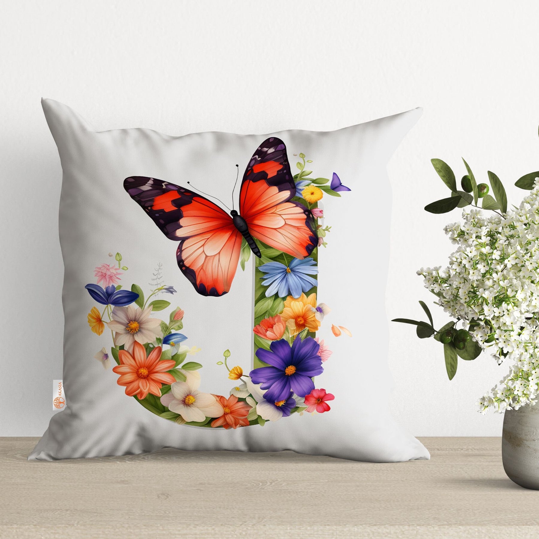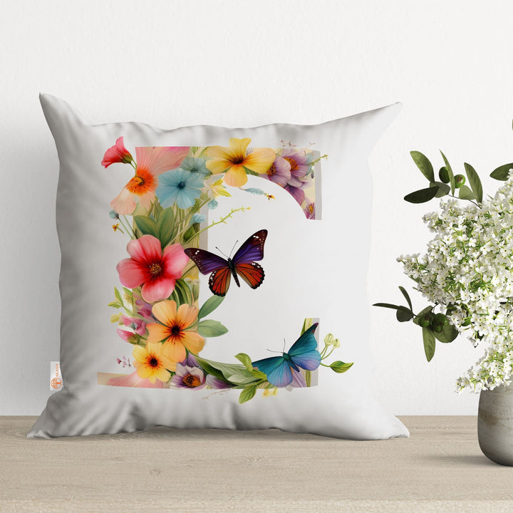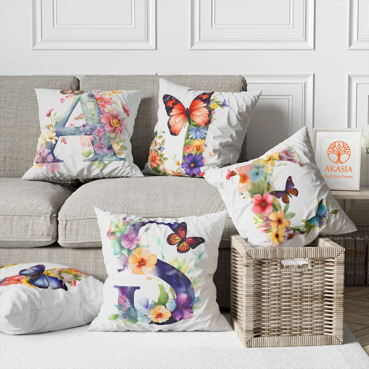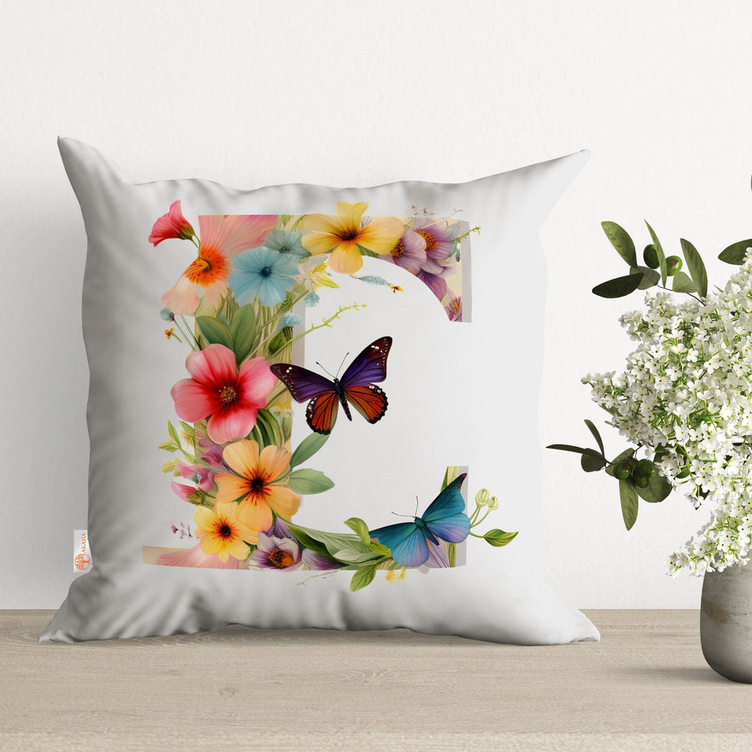 These elegant square decorative farmhouse summer trend monogram throw pillow covers with Flower, Butterfly prints with your selected letter;