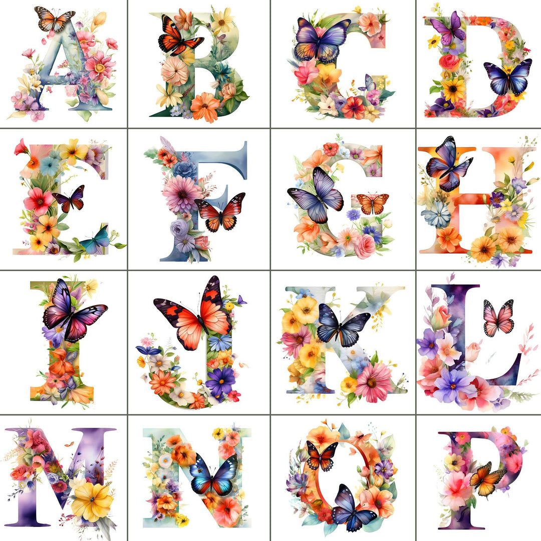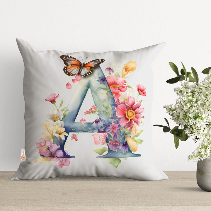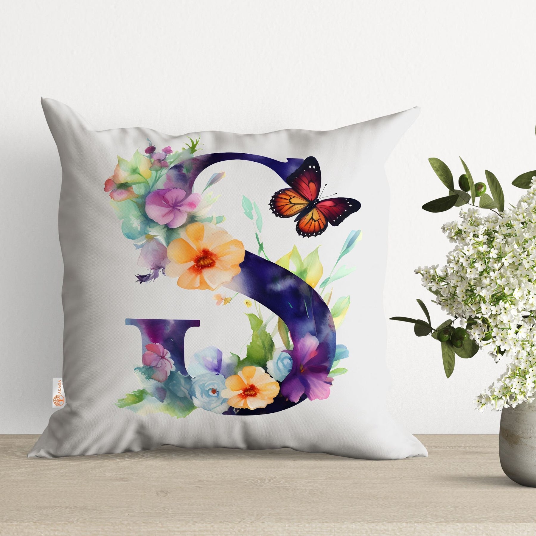 These elegant square decorative farmhouse summer trend monogram throw pillow covers with Flower, Butterfly prints with your selected letter;