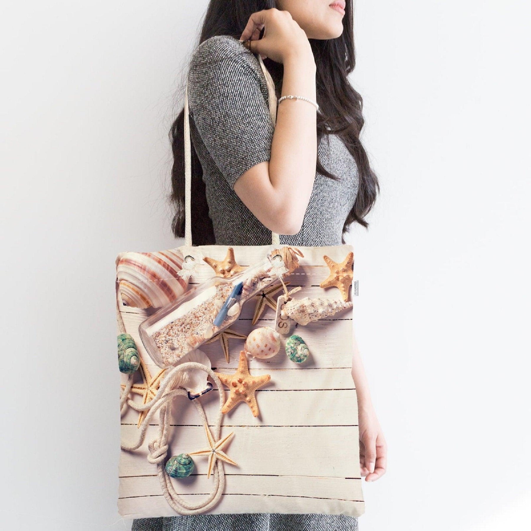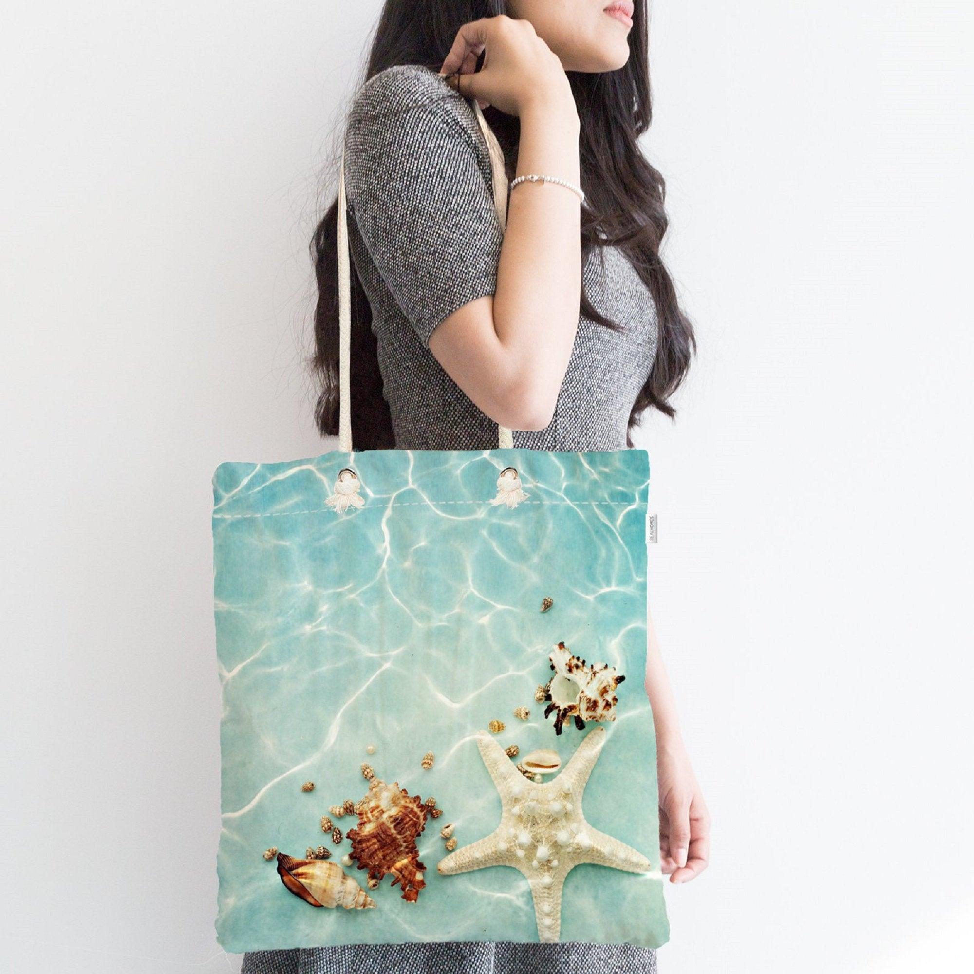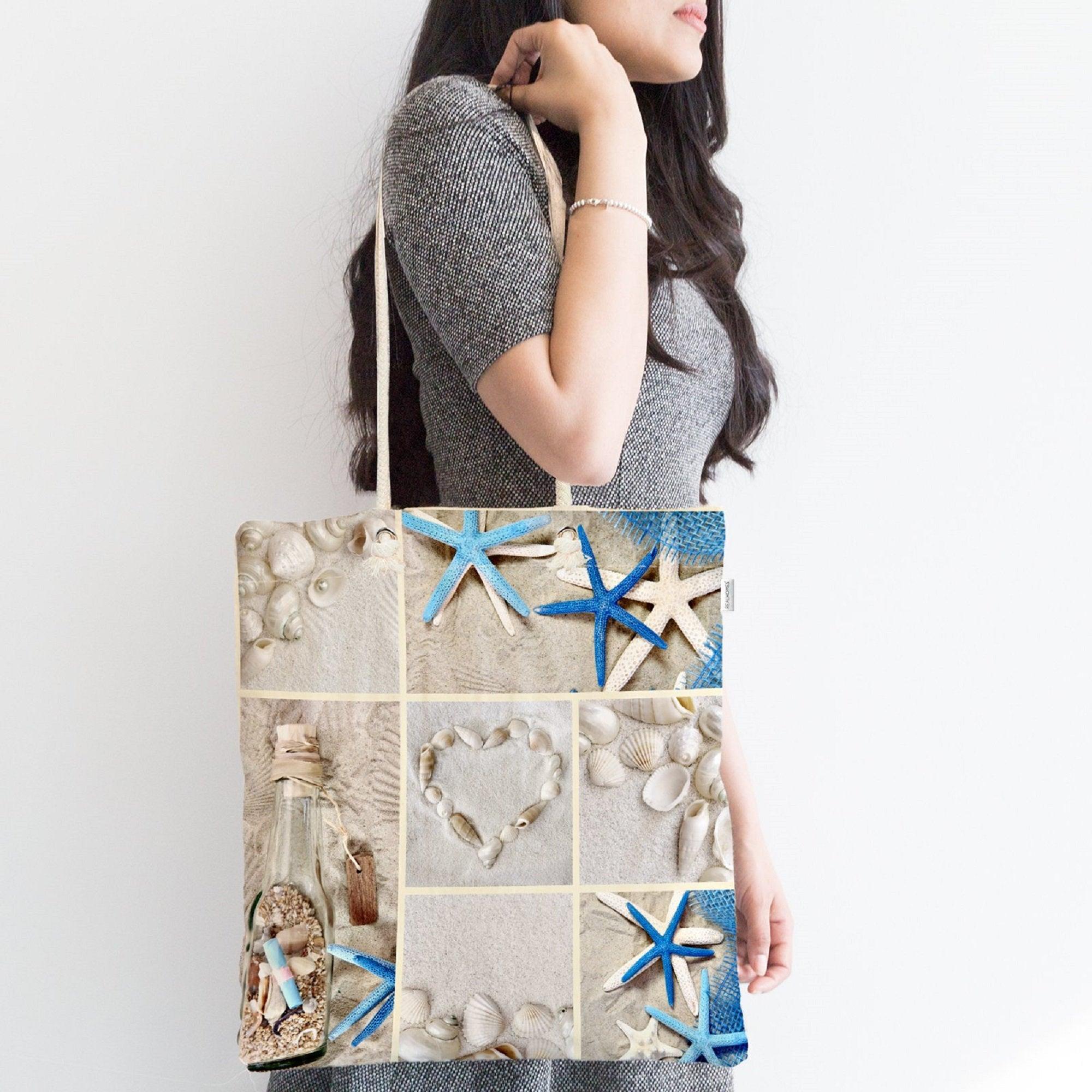 This elegant modern colorful nautical design digital printed fabric tote/messenger bag with starfish and seashells;