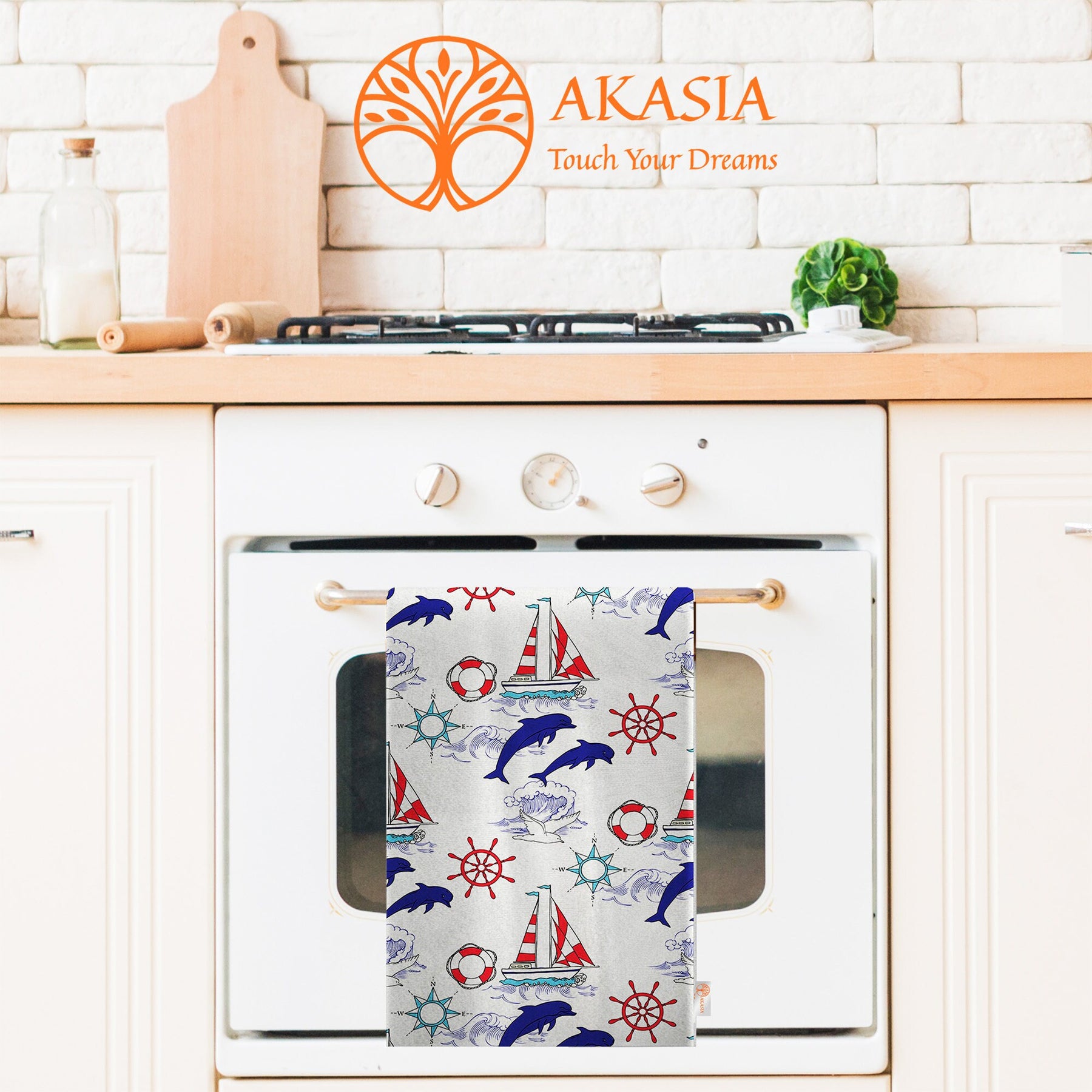 These elegant decorative rectangle kitchen/dish/hand/tea towels with colorful marine fish, dolphin, shark, wheel and sailing boat prints;