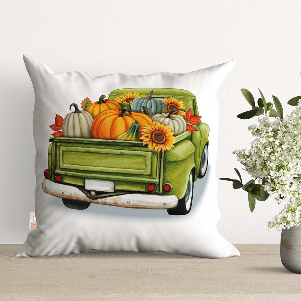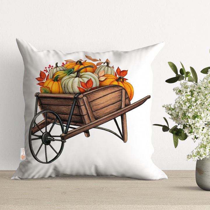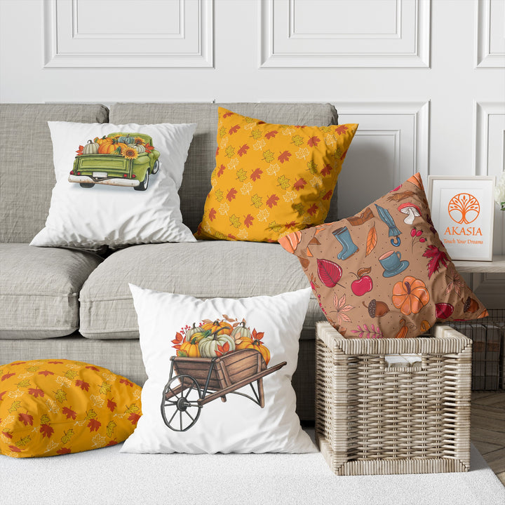 These elegant square decorative farmhouse throw pillow covers with pumpkin, dry leaves, wheelbarrow and pumpkin truck;