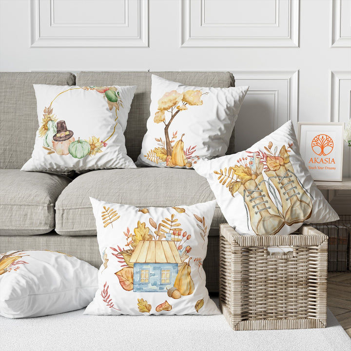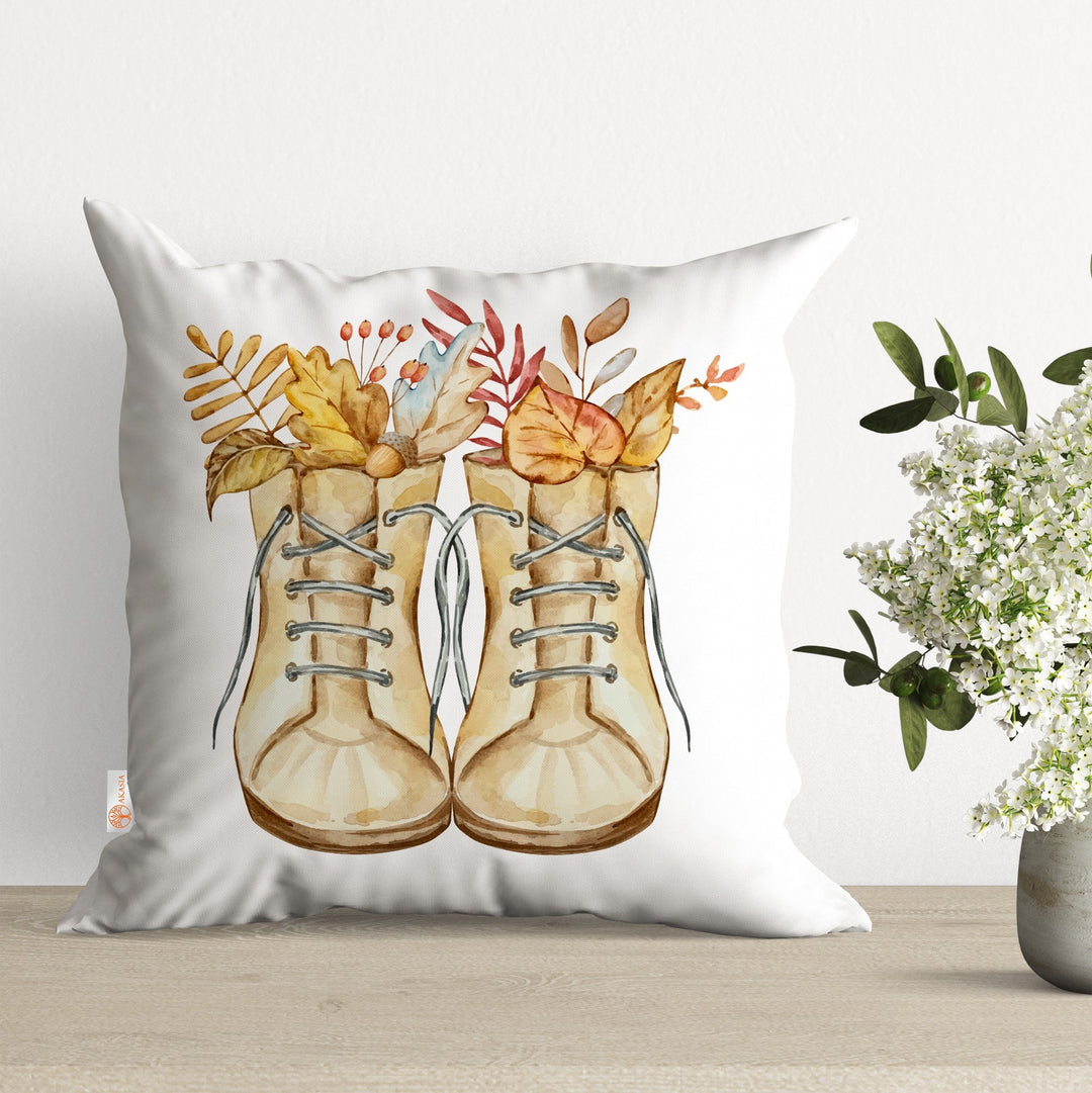 These elegant square decorative farmhouse throw pillow covers with Dry Leaves, Pumpkin, Autumn Tree and Boot print;