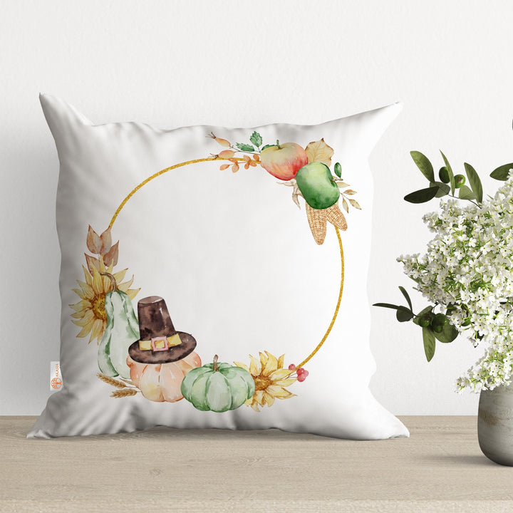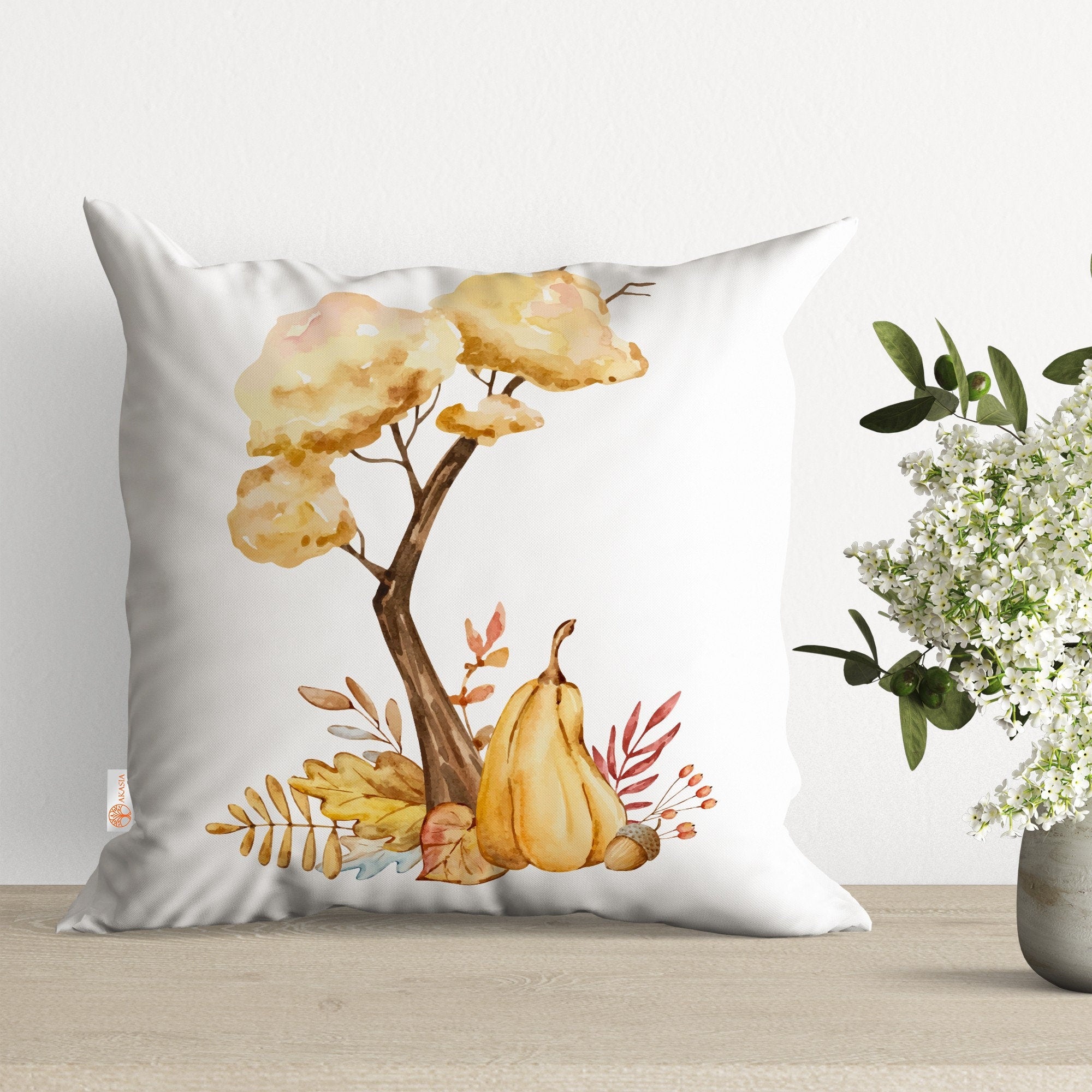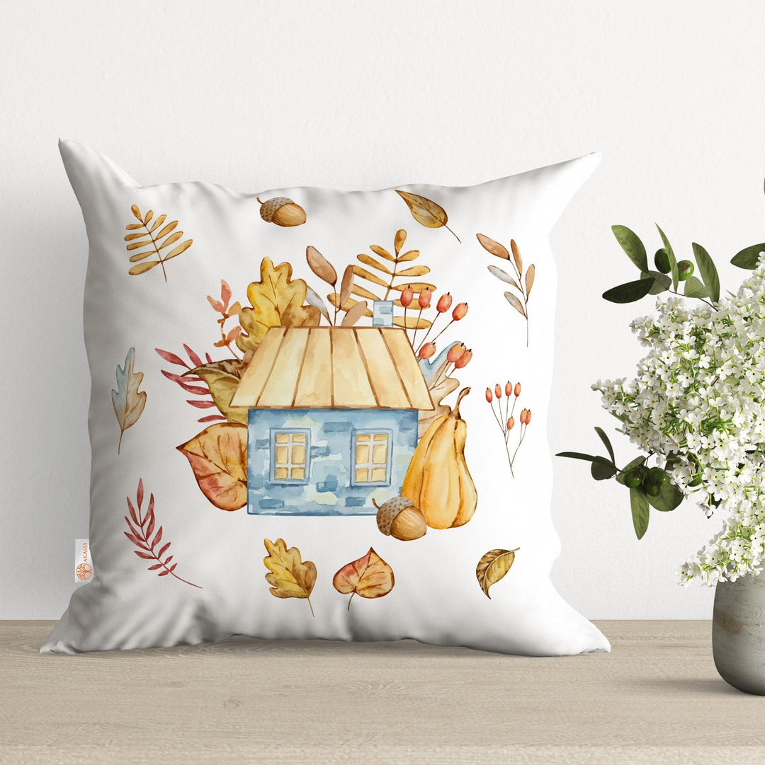 Fall Pillow Cover with Dry Leaves and Pumpkin