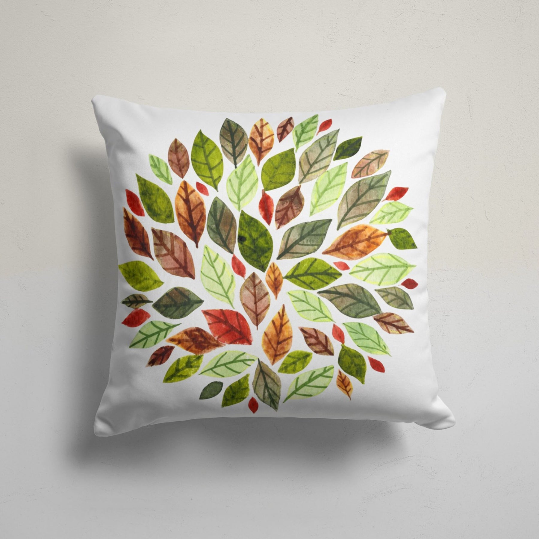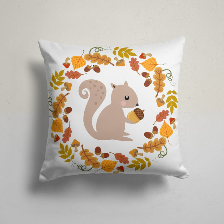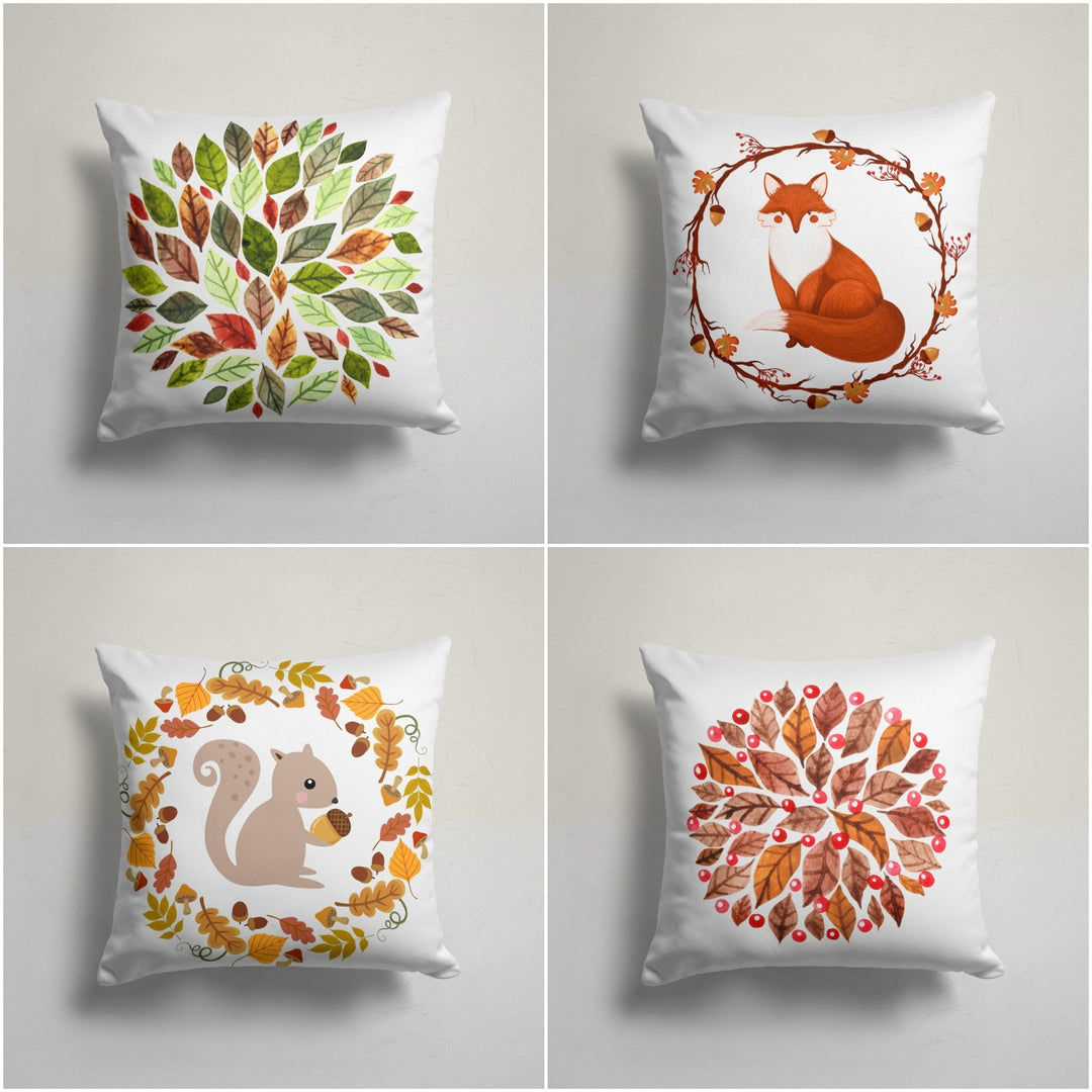 These decorative square fall trend throw pillow covers with Orange Green Leaf Drawing, Fox, Squirrel and Acorn;