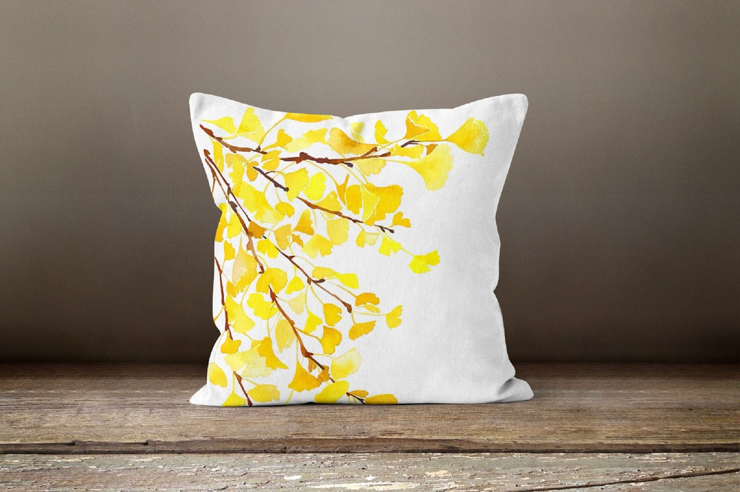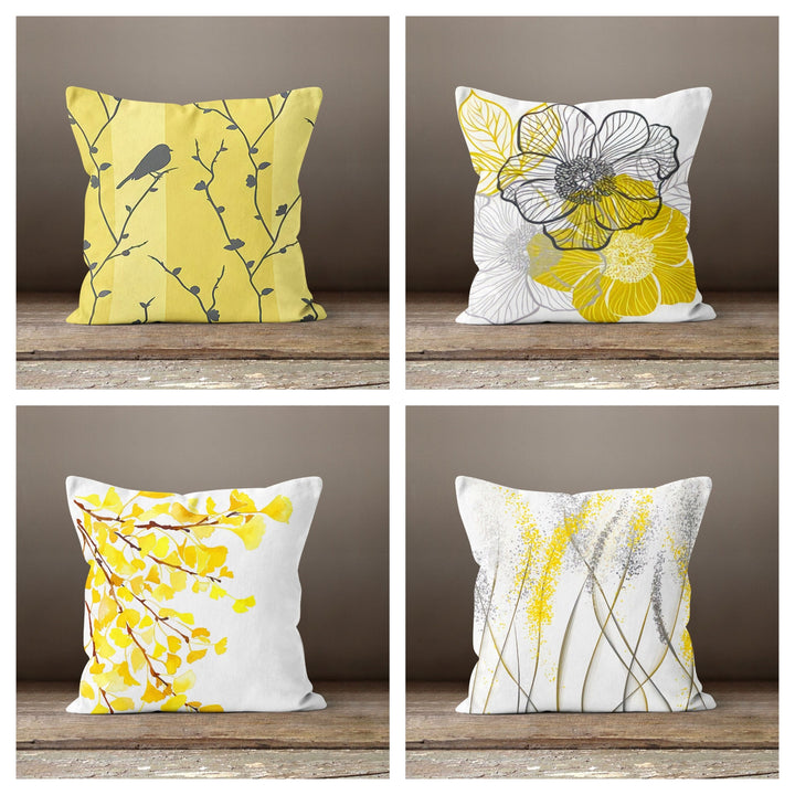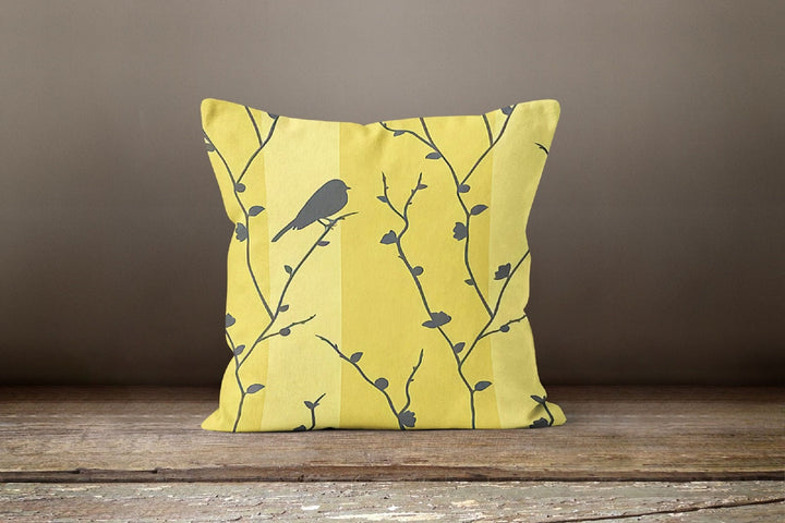 Yellow Floral Pillow Cover|Gray Bird on Tree|Decorative Fall Throw Pillow Top|Boho Bedding Home Decor|Housewarming Autumn Trend Cushion