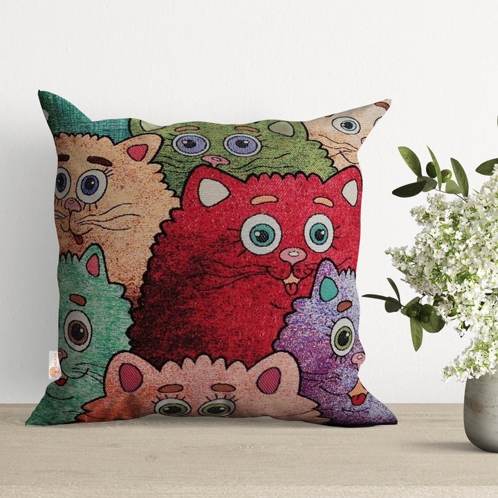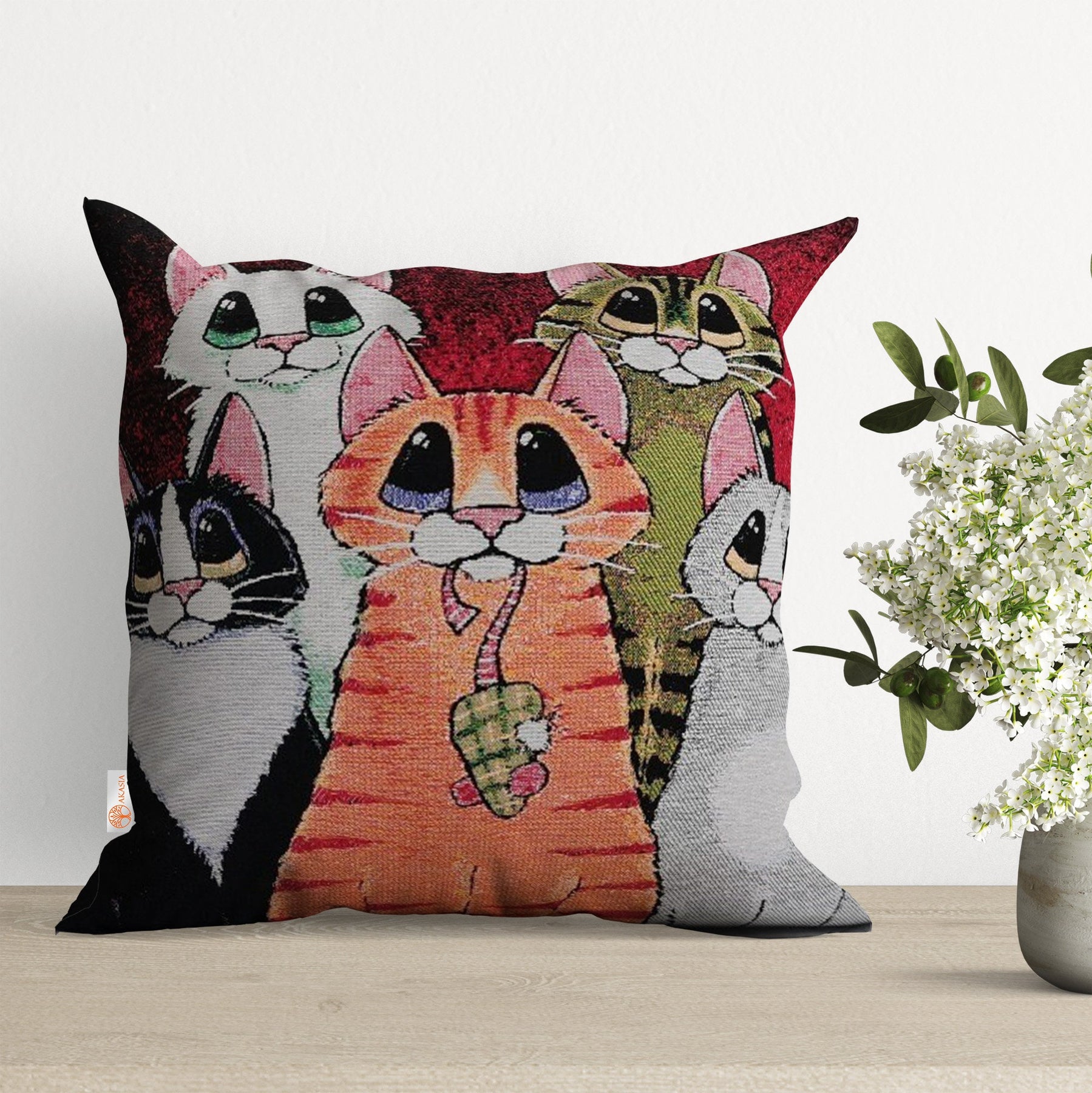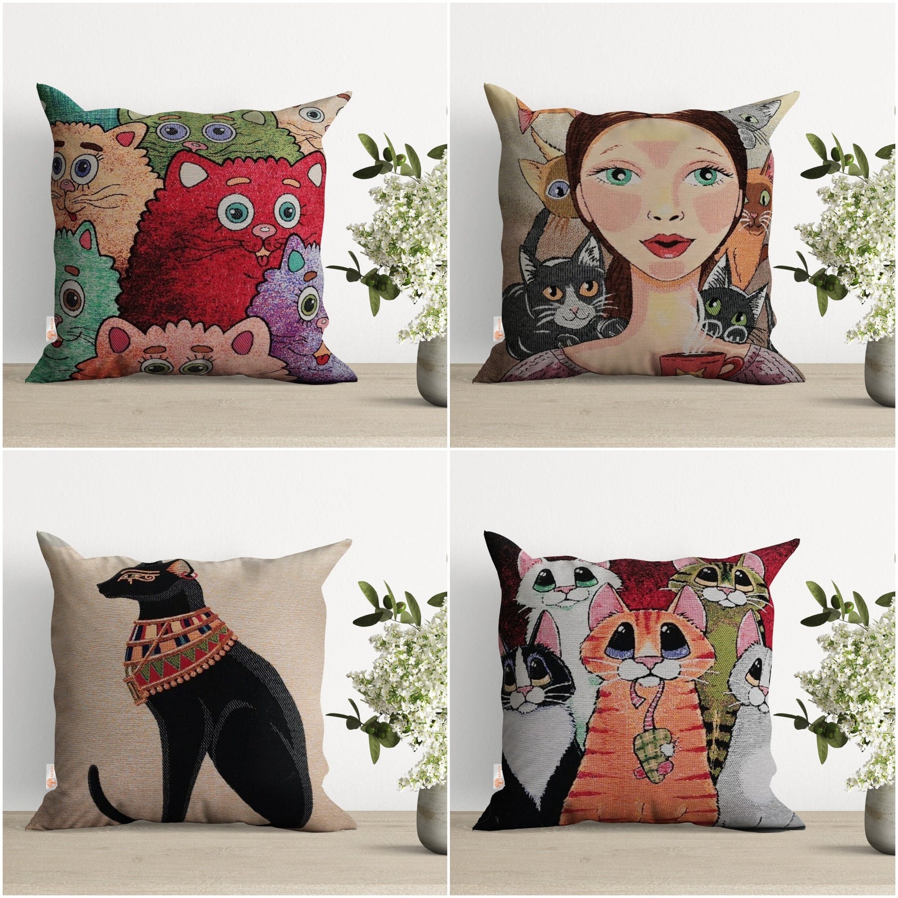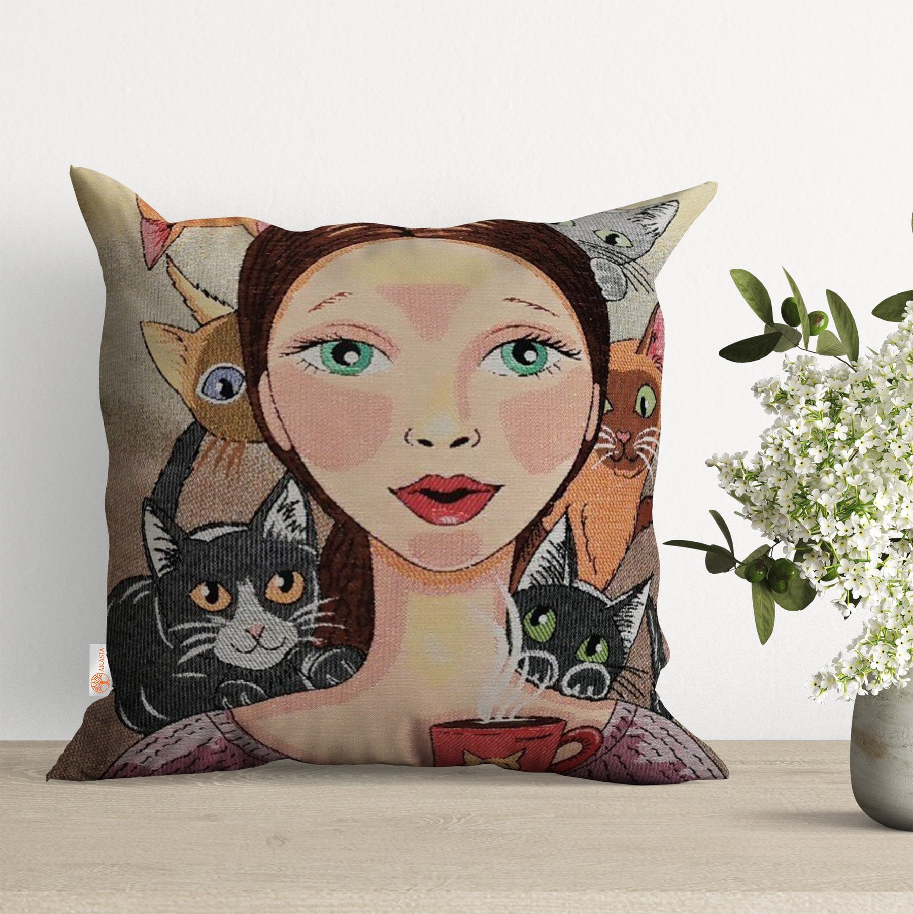 These elegant square throw pillow covers with colorful cute cats and pretty girl;