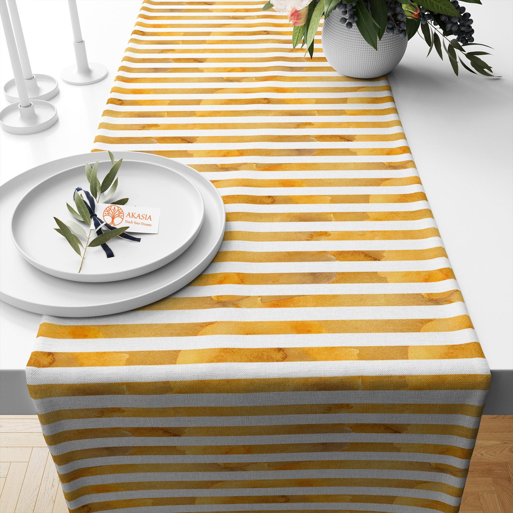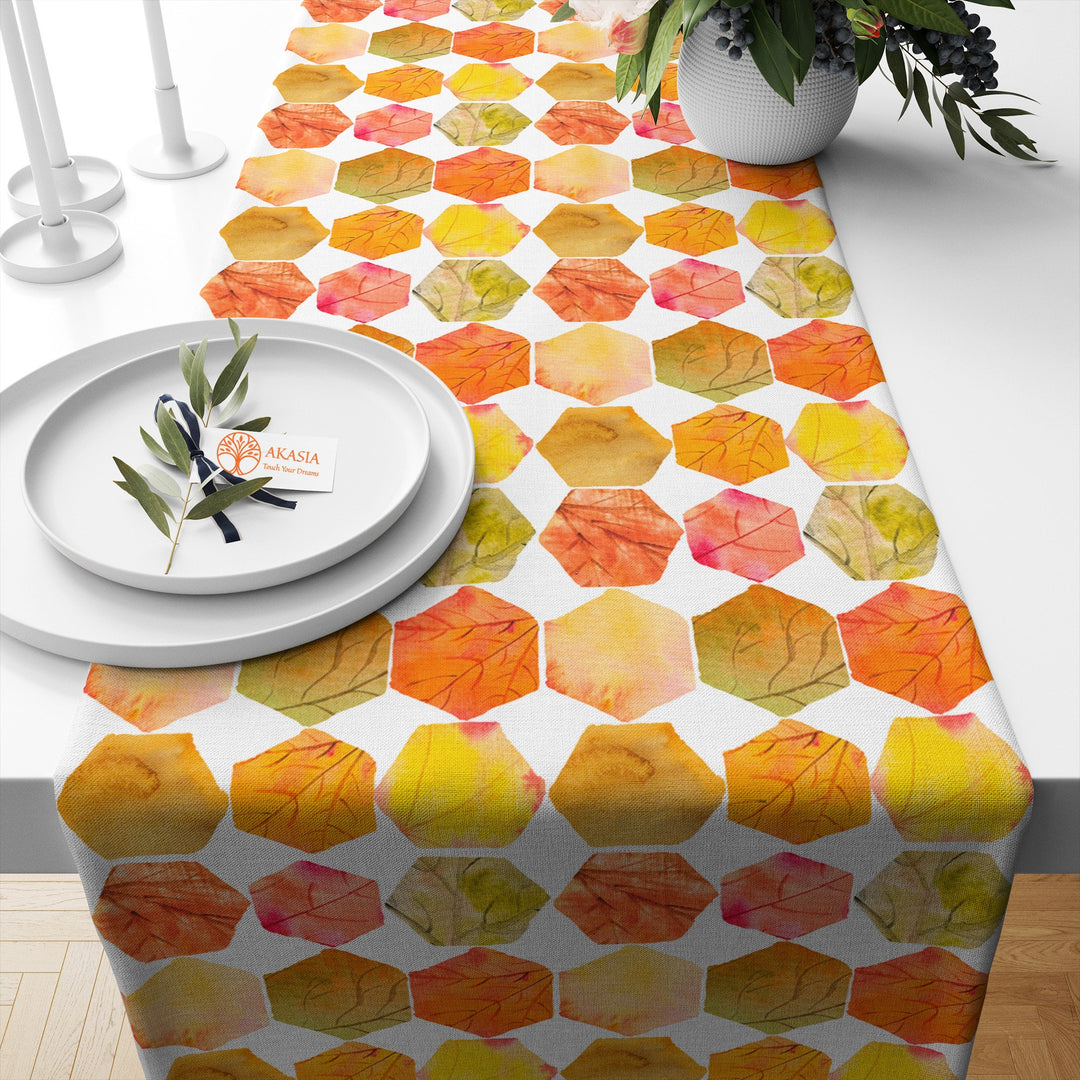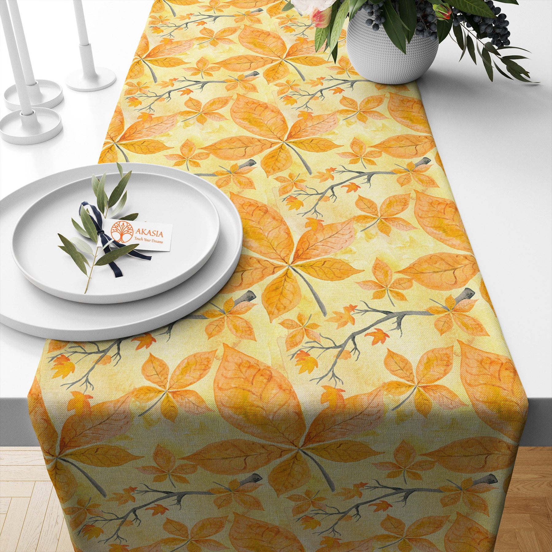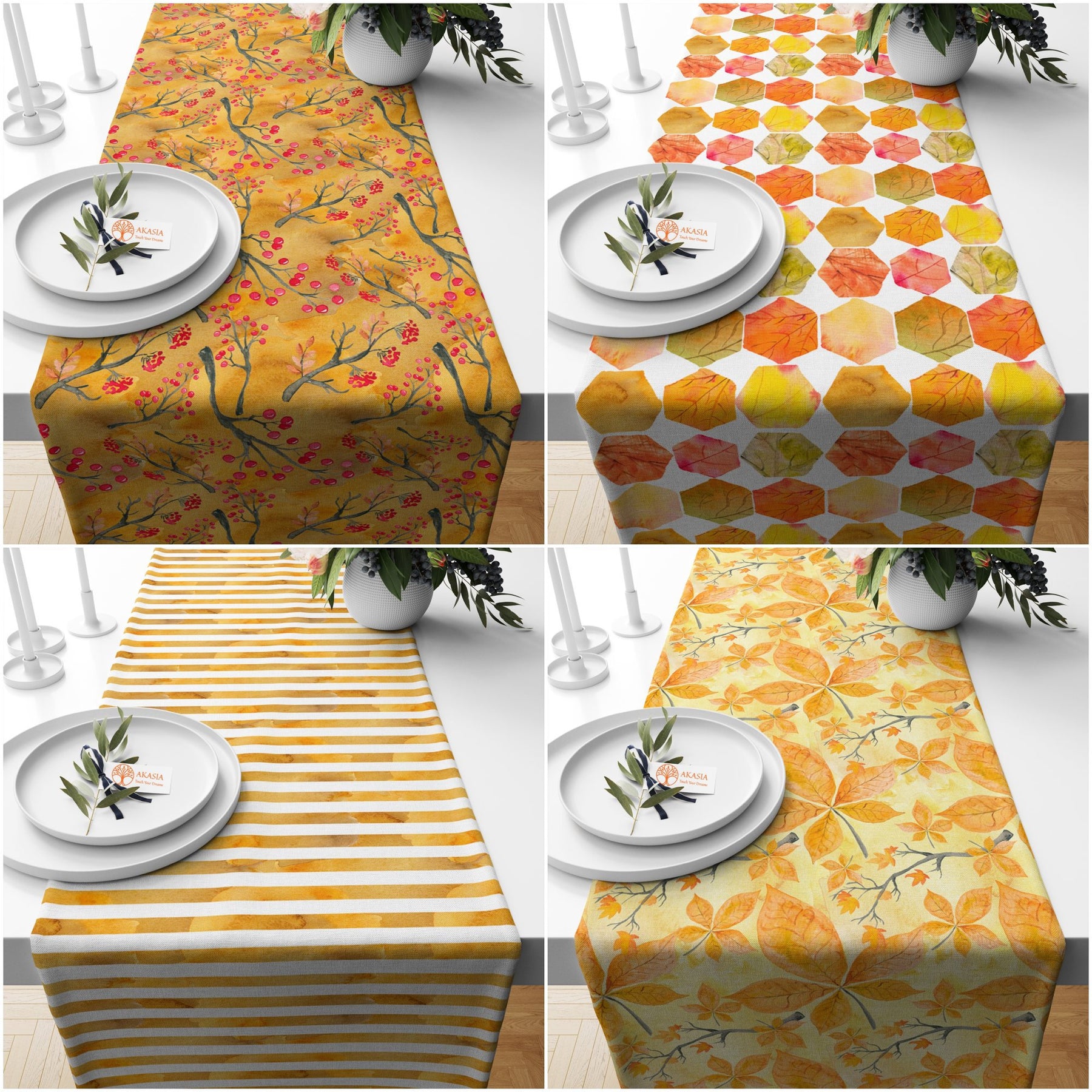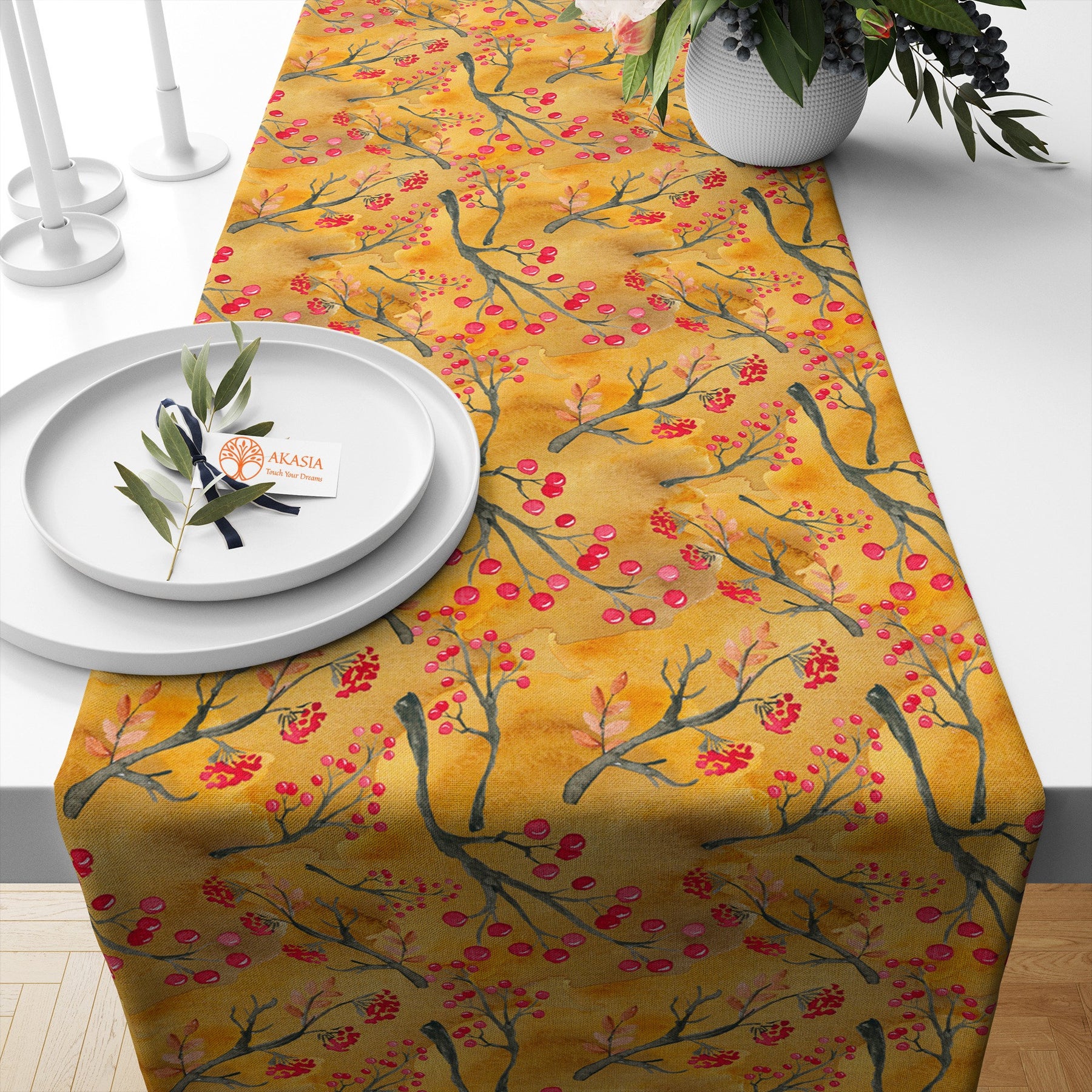 This high quality, rustic farmhouse style table decor with autumn, striped, orange, leaf, fall, geometric, red berry print;