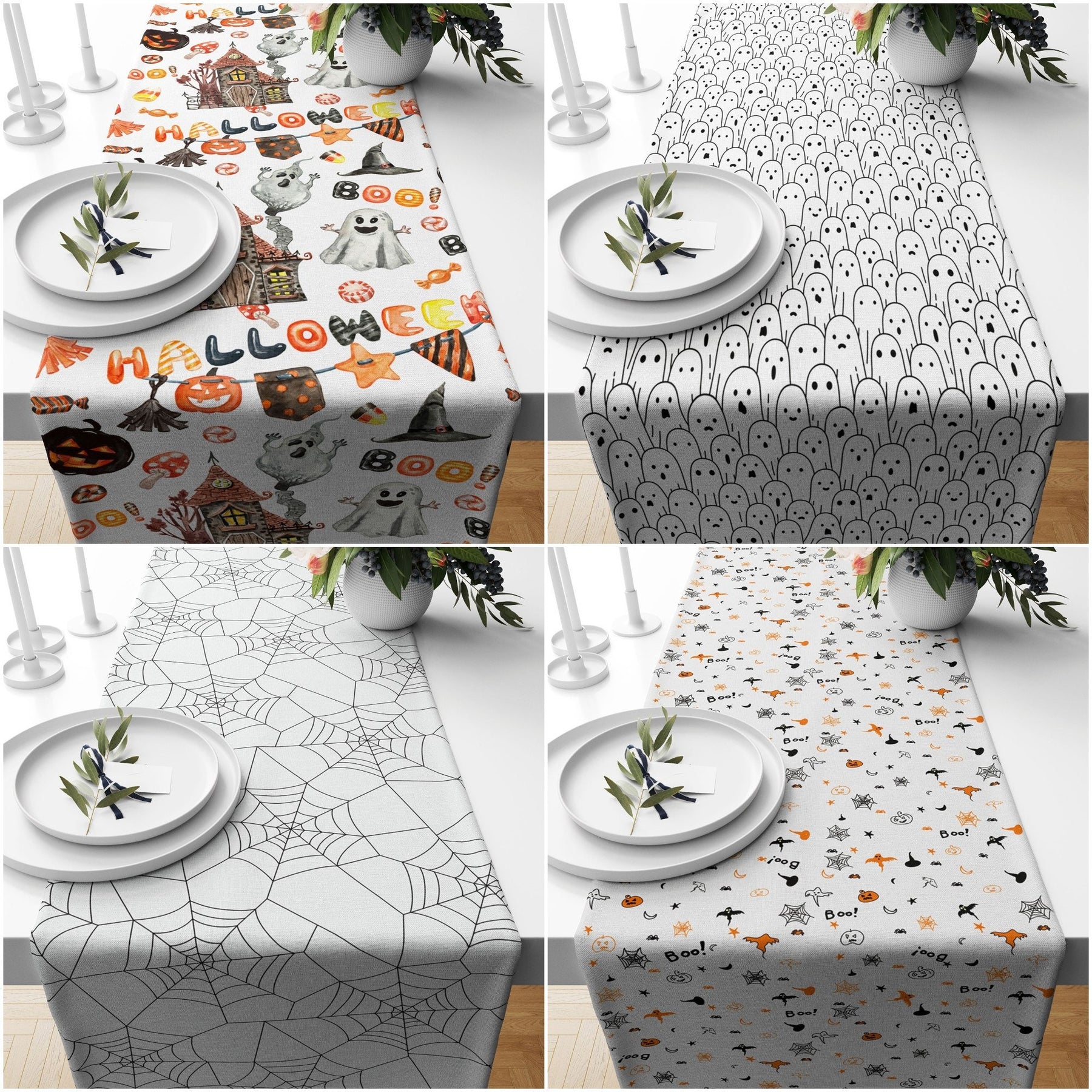 This high quality, farmhouse style rectangle table decor with Ghost, Spider Web, Haunted House, Pumpkin and Boo prints;