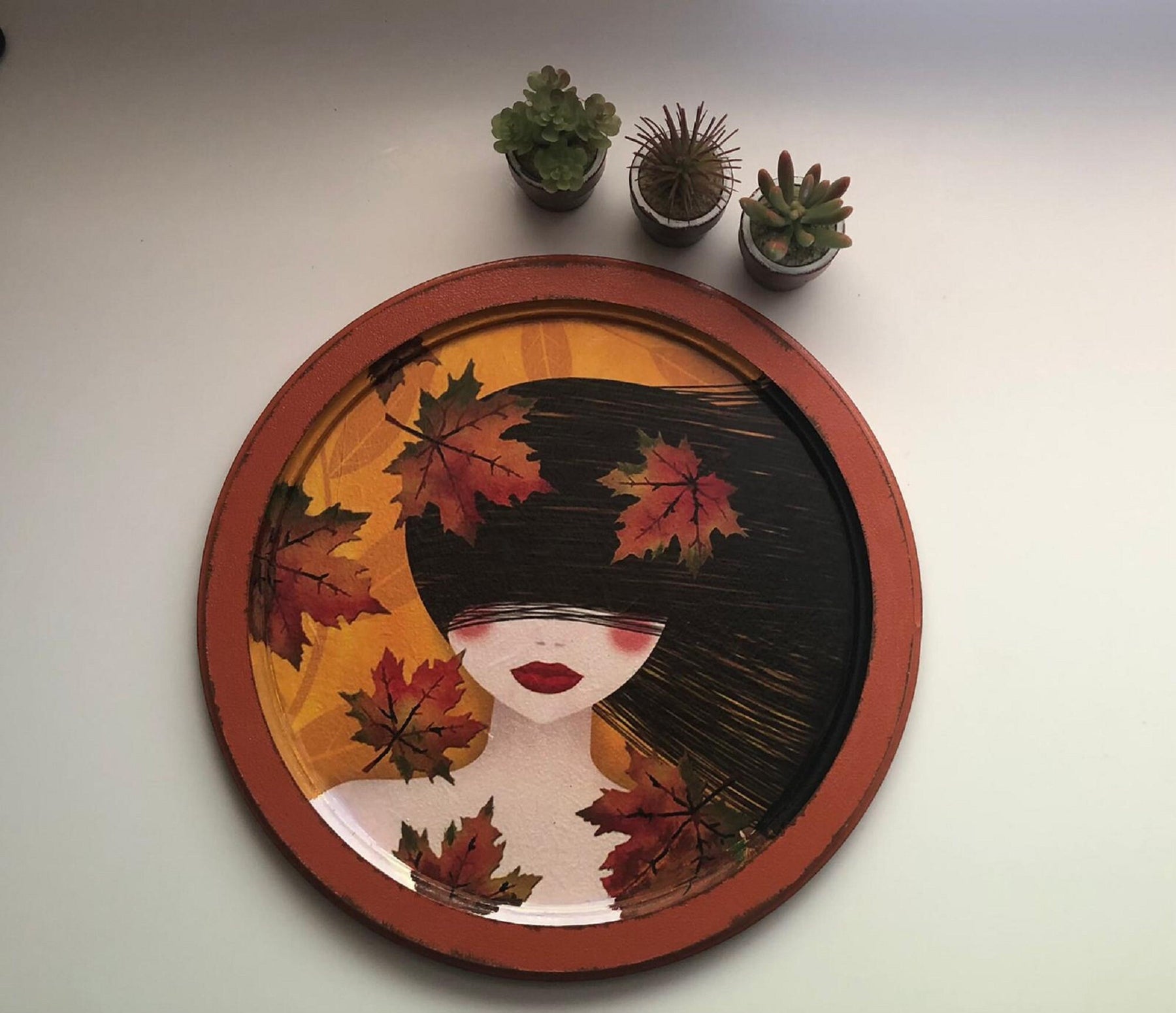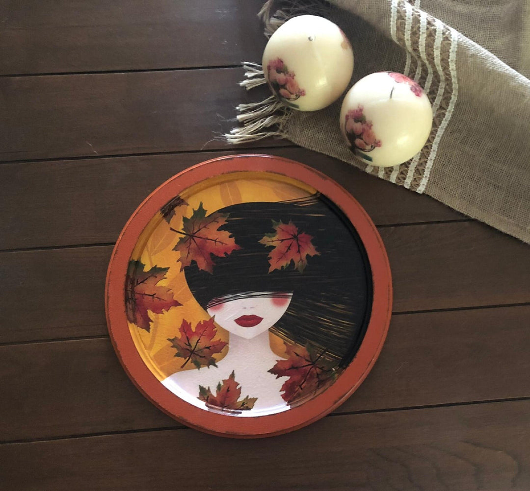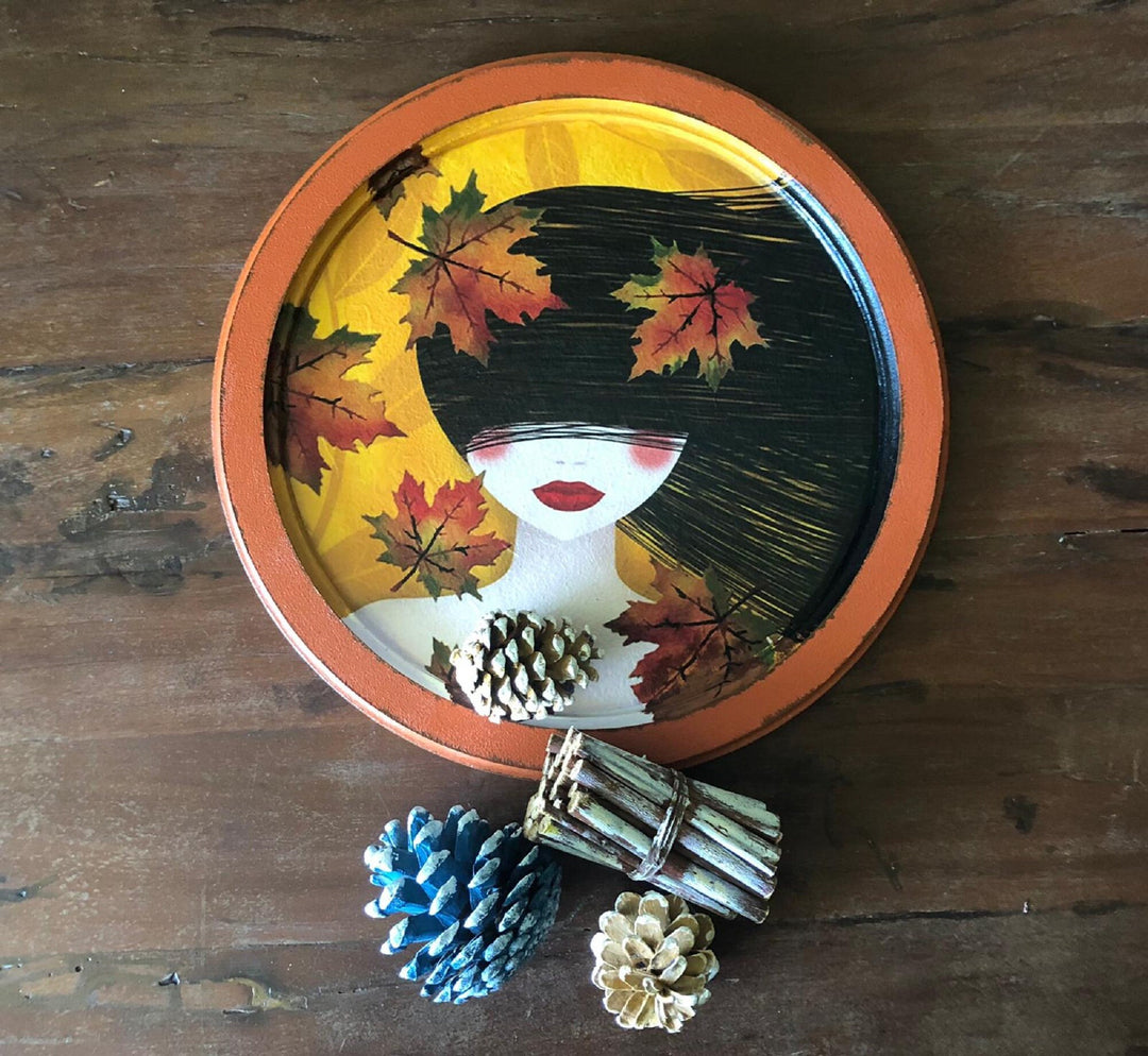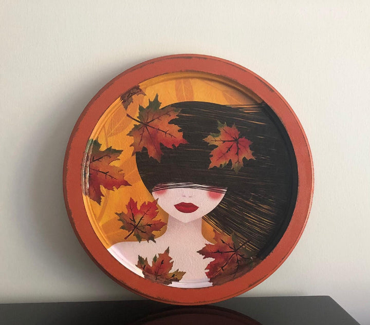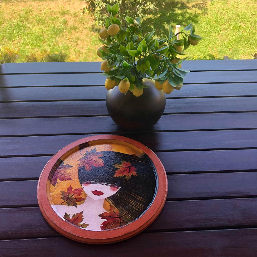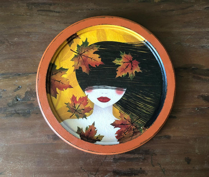 Hand Painted Wooden Tray with Girl and Leaves