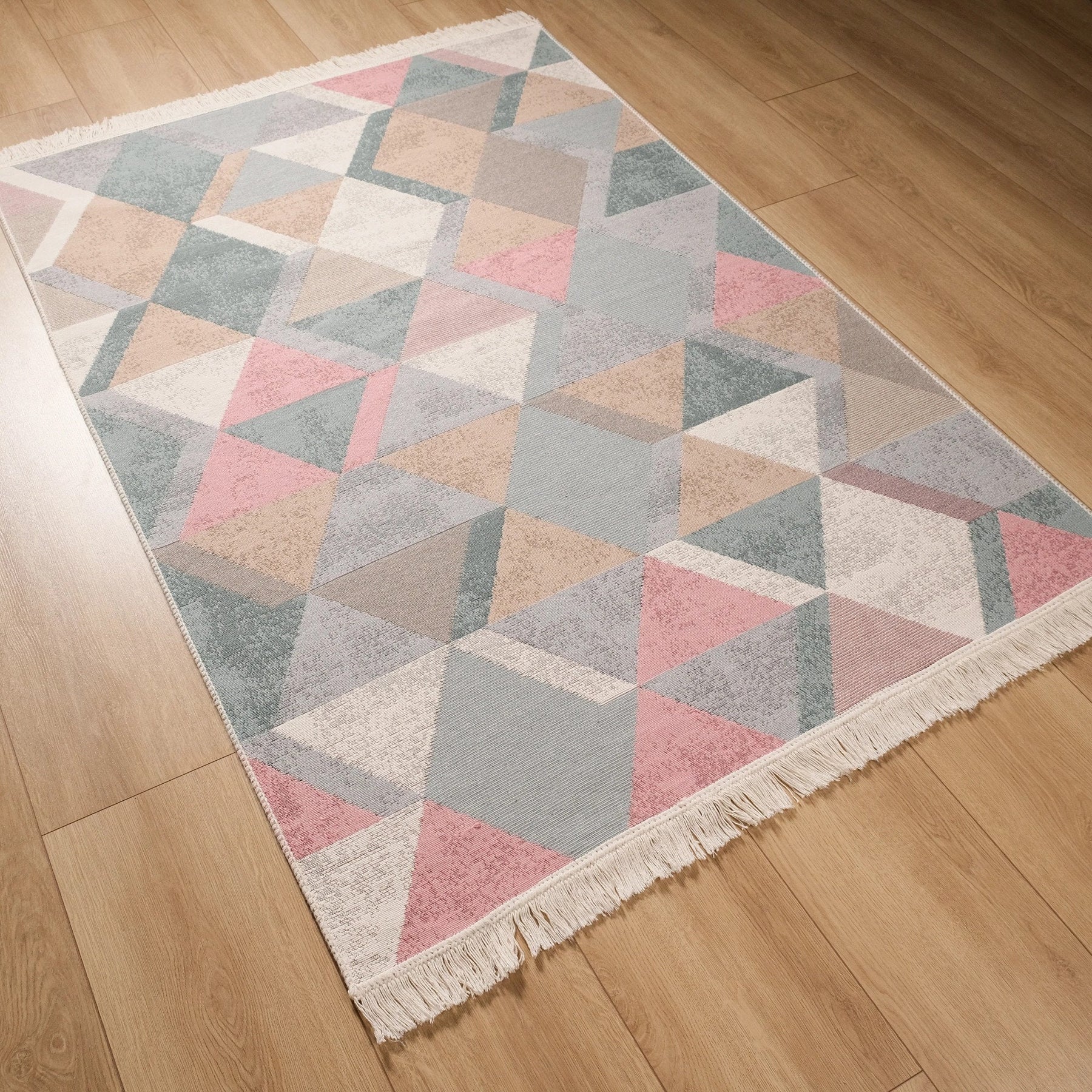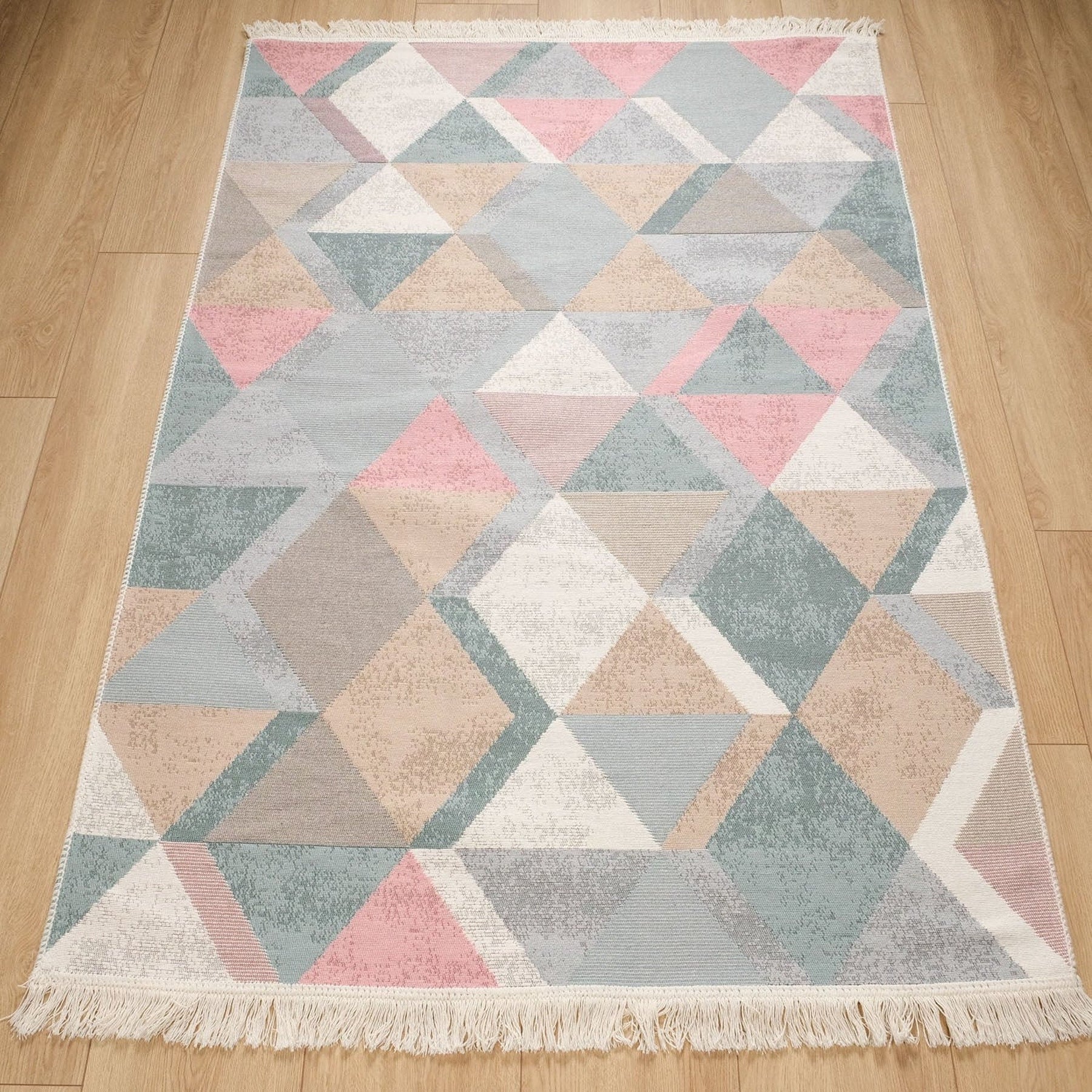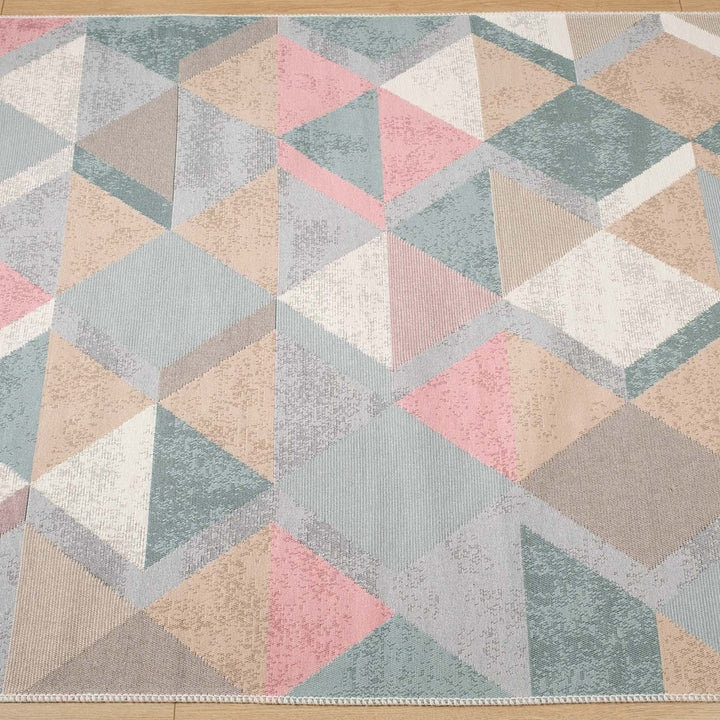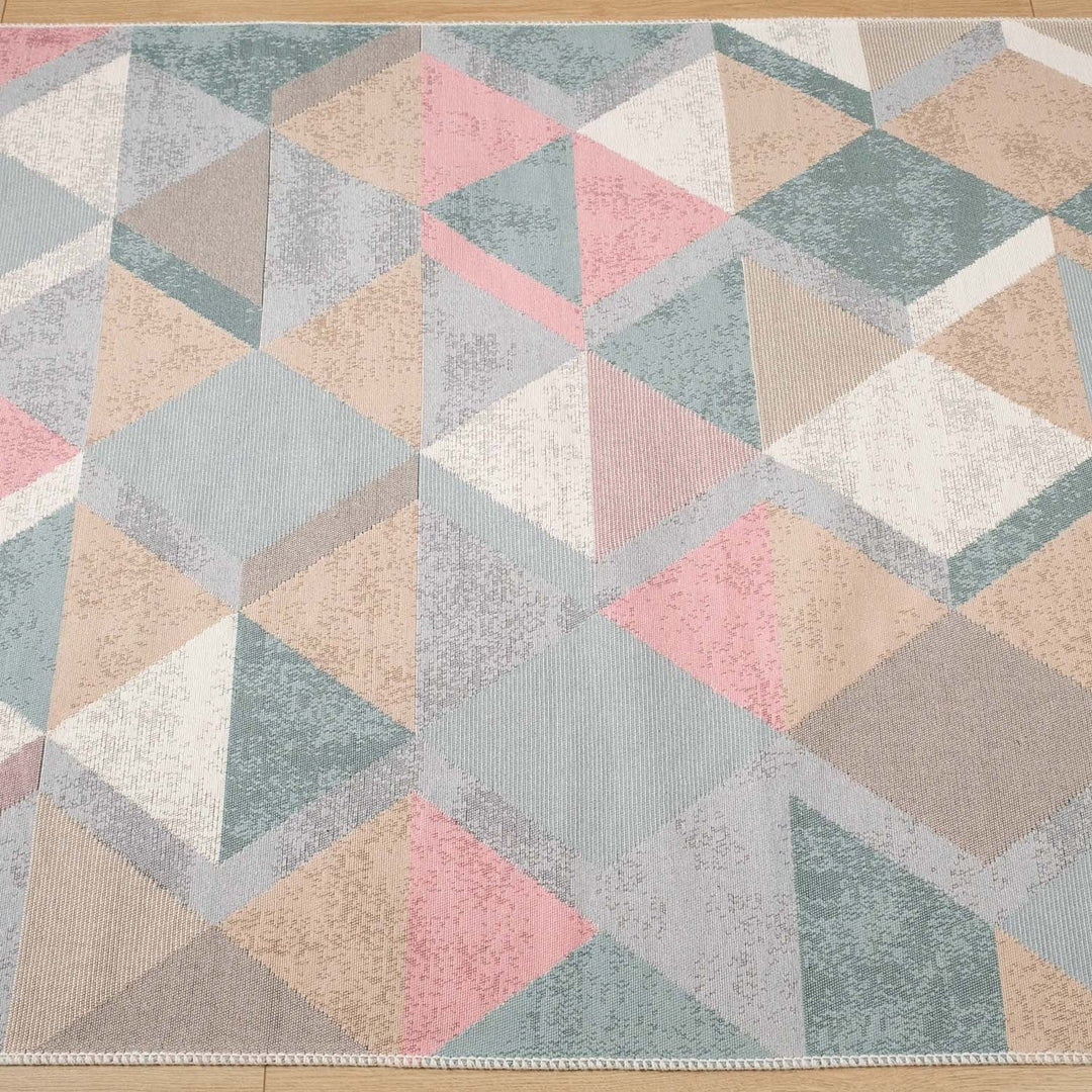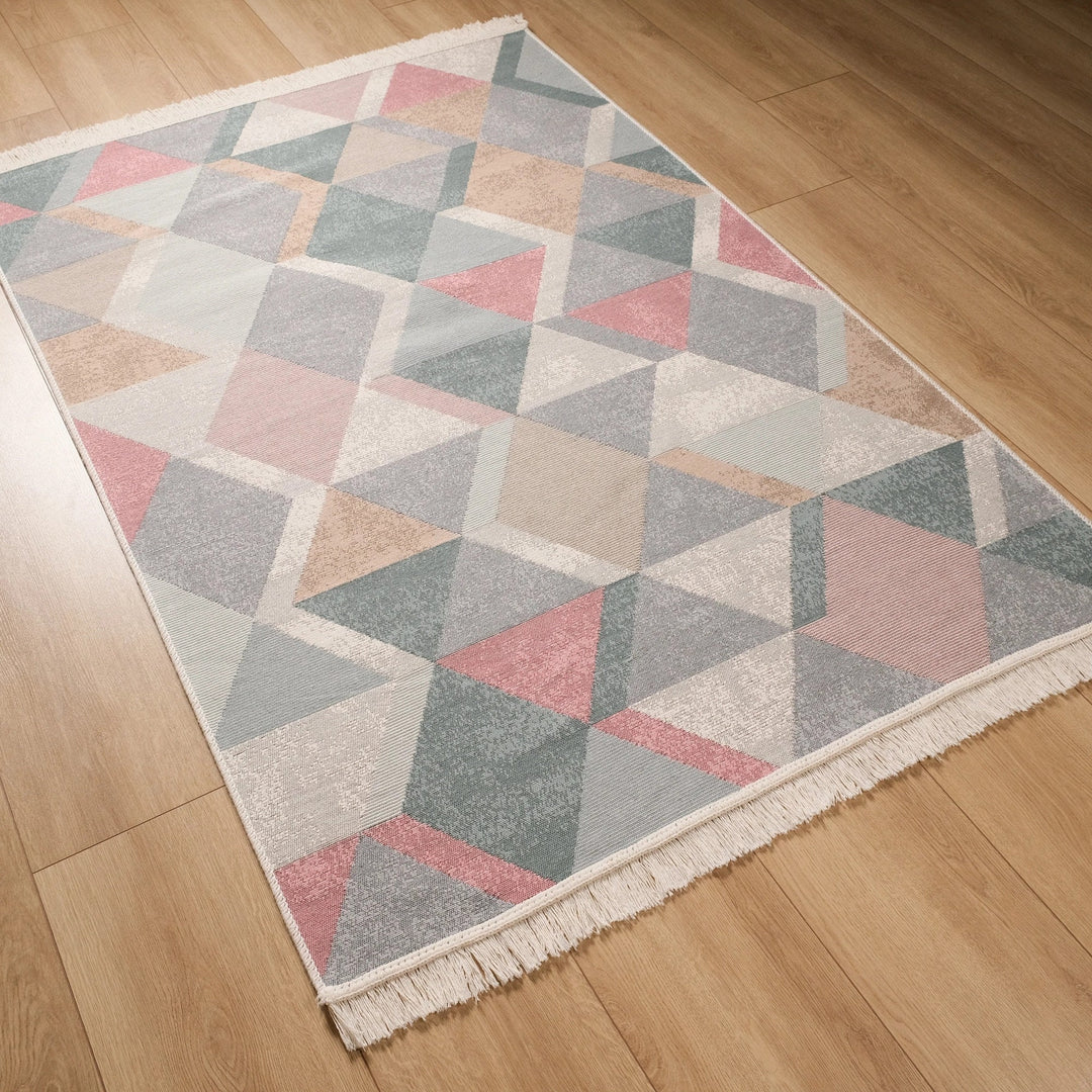 This elegant Machine Woven and Machine-Washable reversible floor rug with colorful Triangle Pattern;