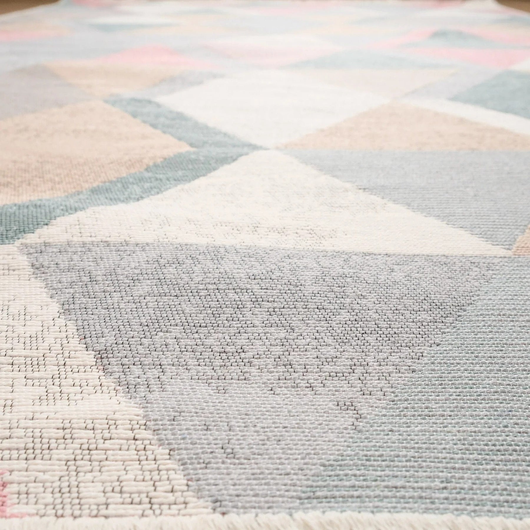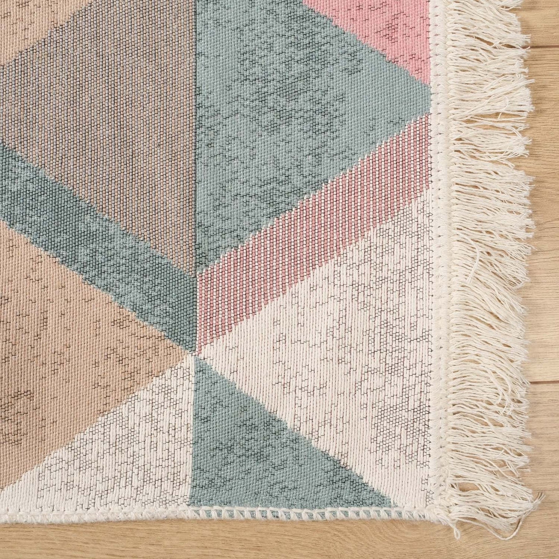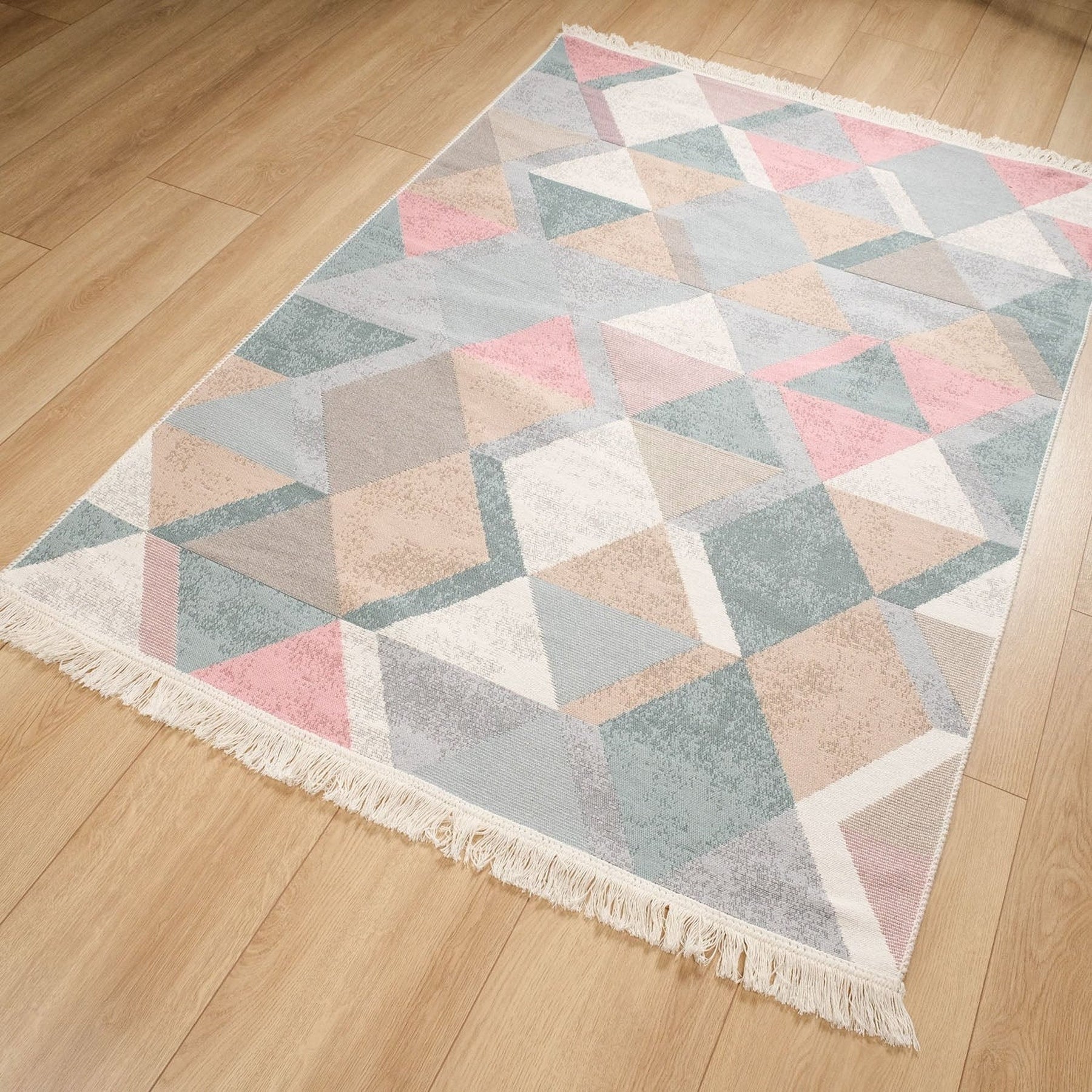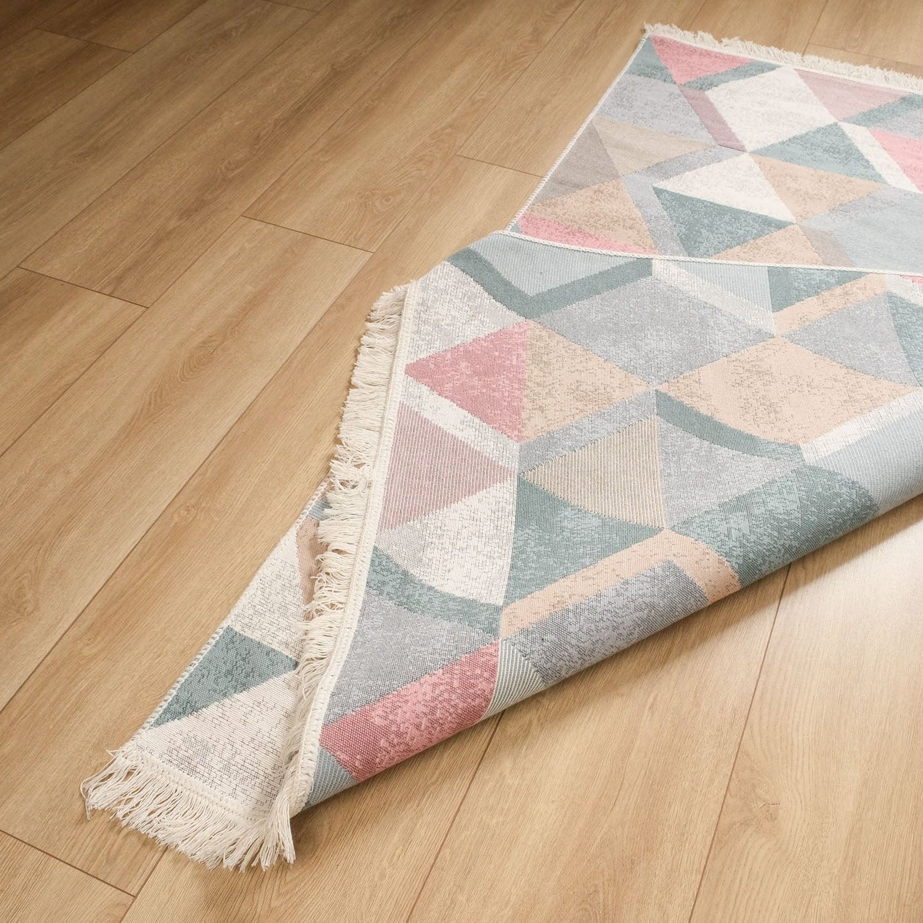 This elegant Machine Woven and Machine-Washable reversible floor rug with colorful Triangle Pattern;