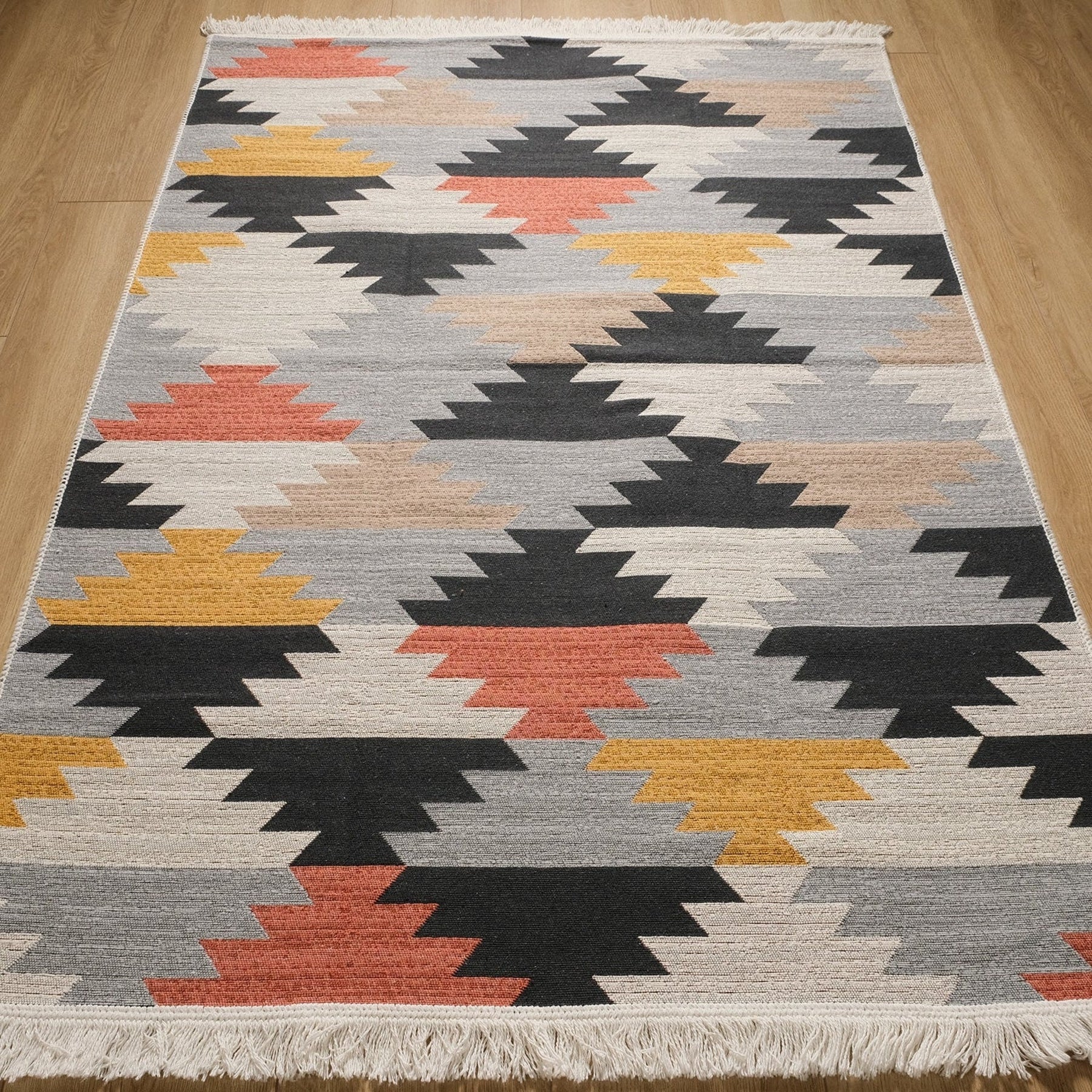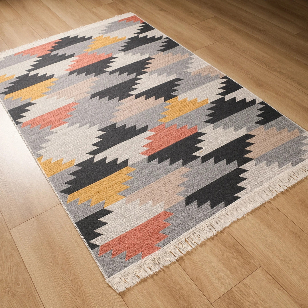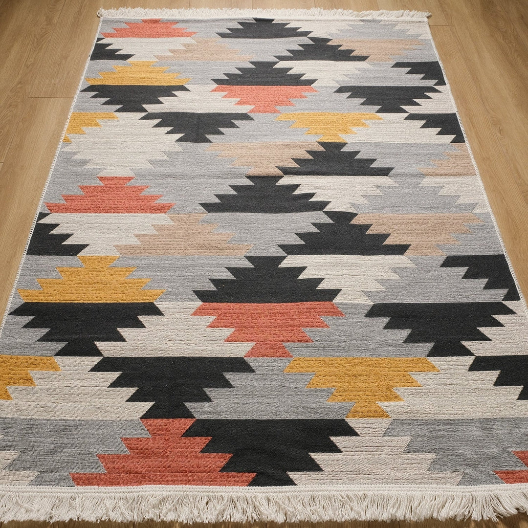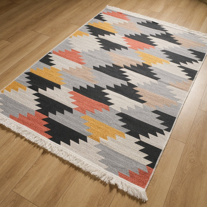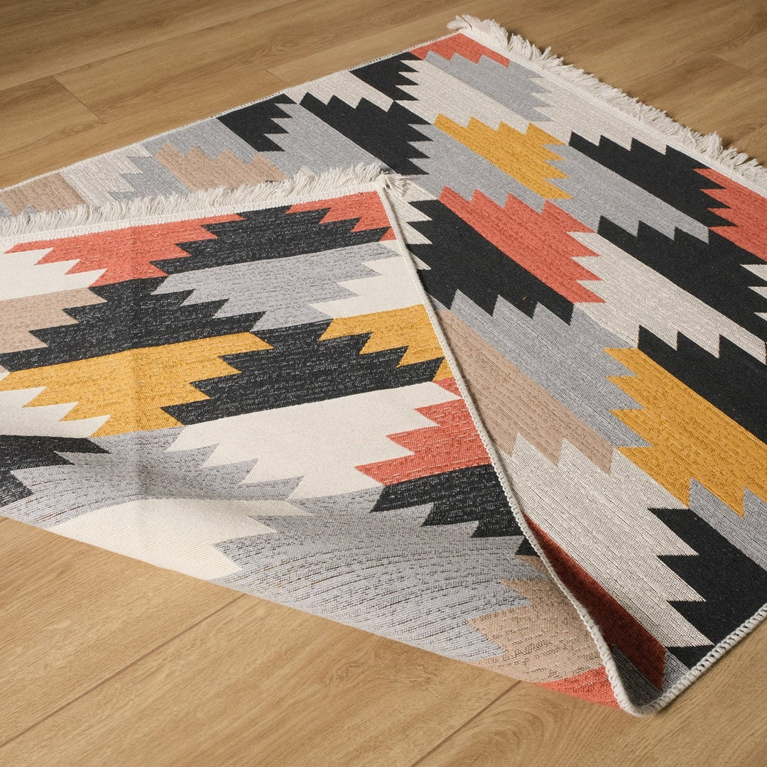 This elegant Machine Woven and Machine-Washable reversible floor rug with colorful geometric kilim design;