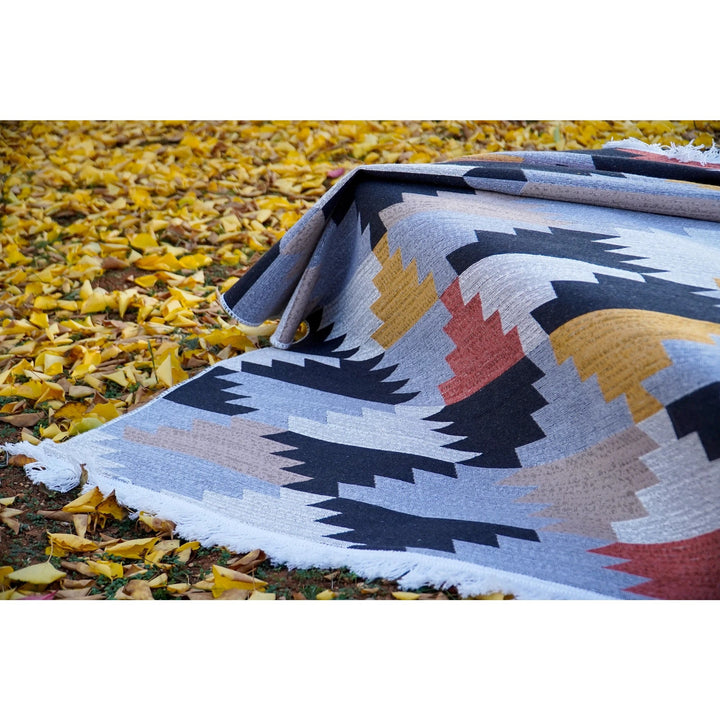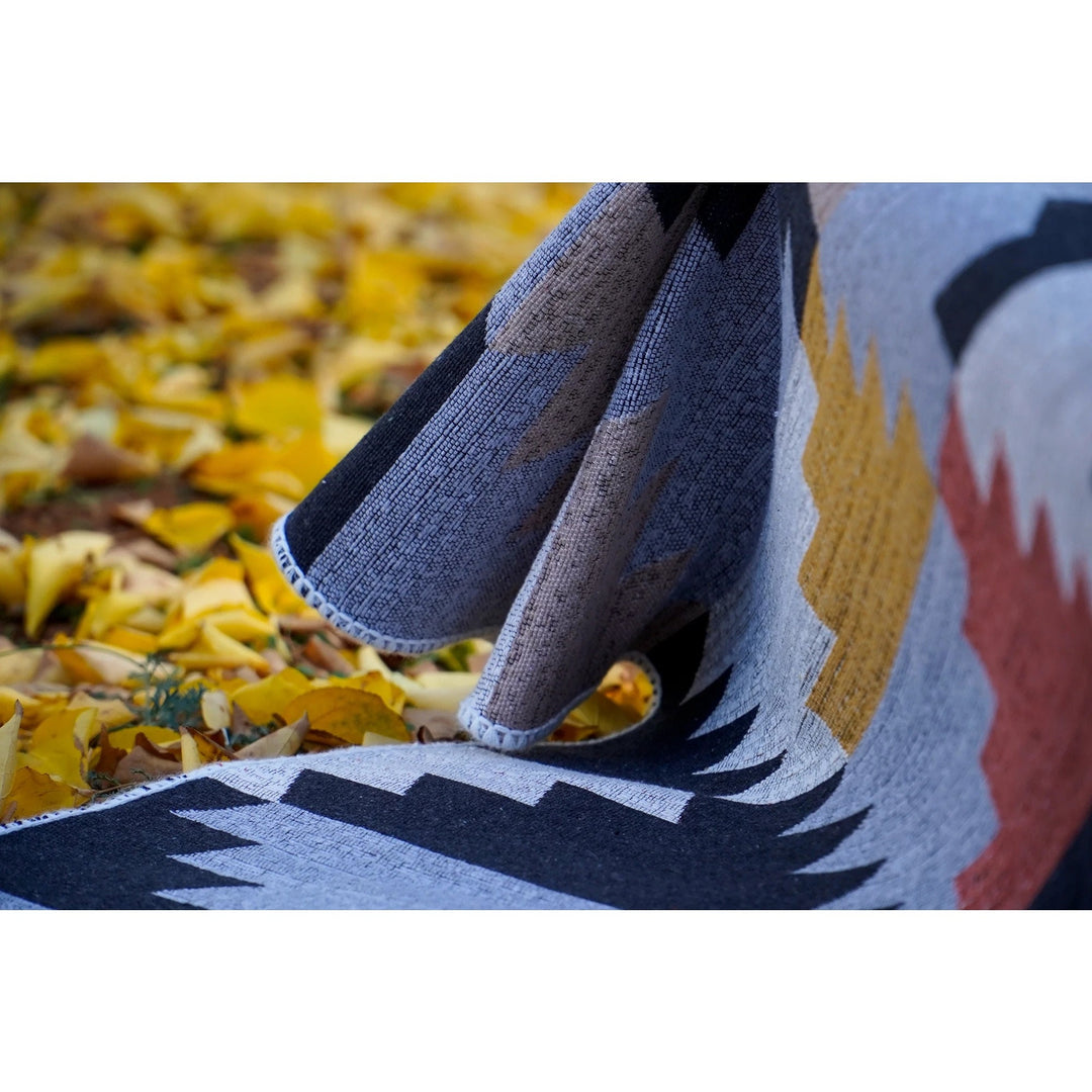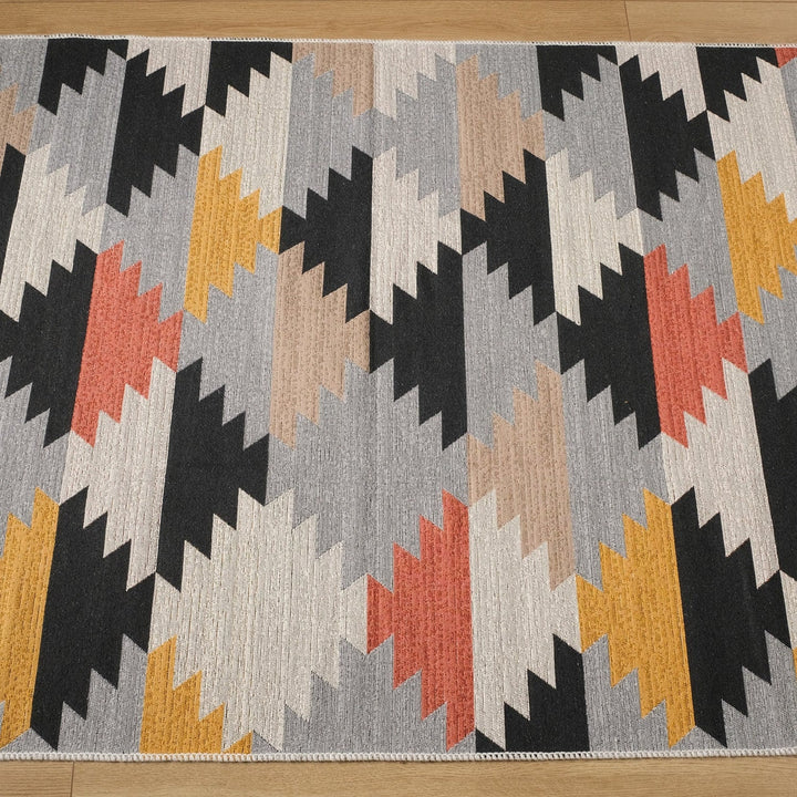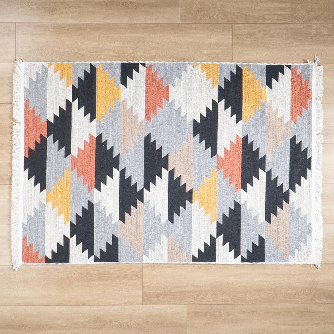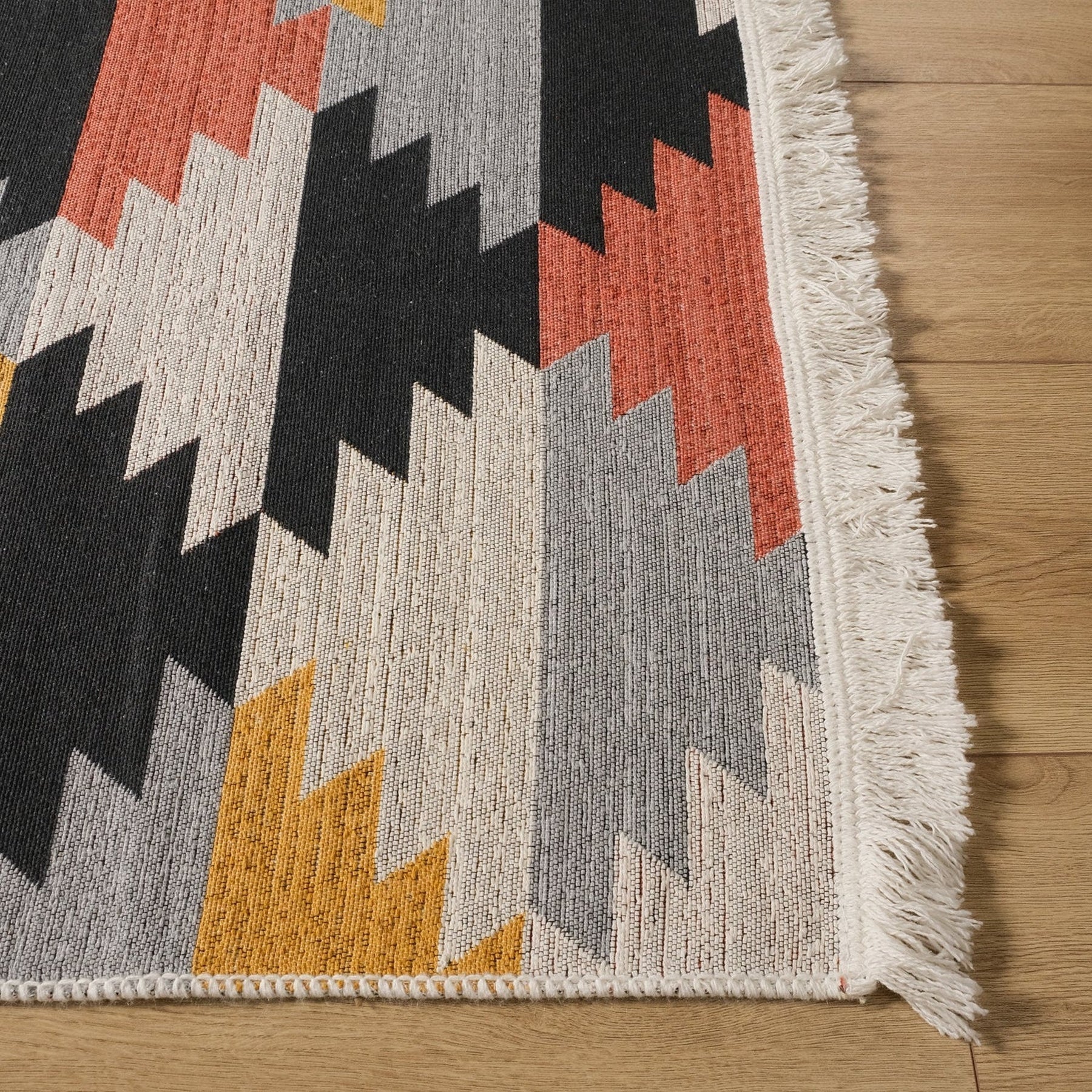 This elegant Machine Woven and Machine-Washable reversible floor rug with colorful geometric kilim design;