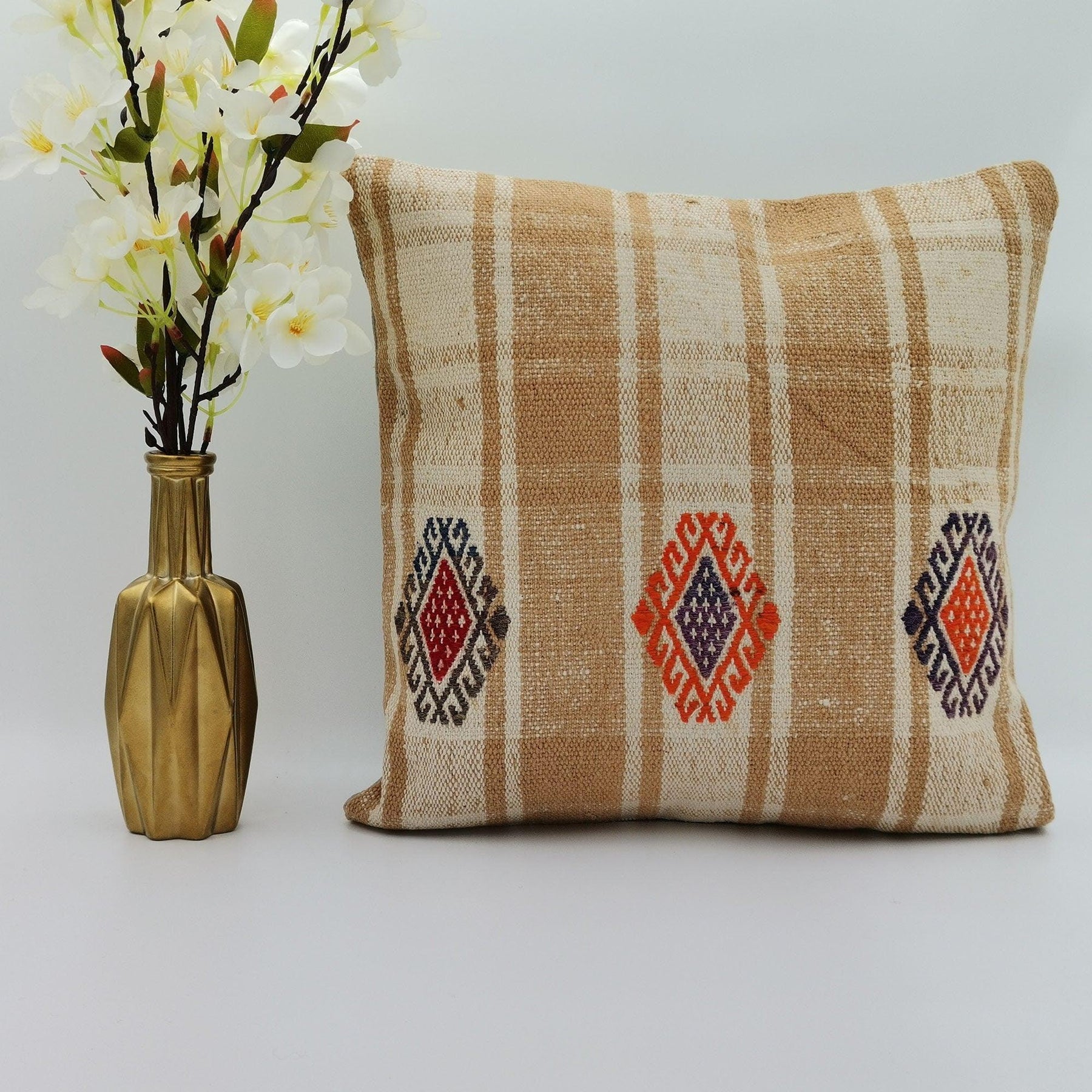 Vintage Kilim Pillow Cover|Diamond Pattern Turkish Kilim Cushion Case|Antique Soft Throw Pillow Top|Handwoven Rug Design Cushion Case 16x16