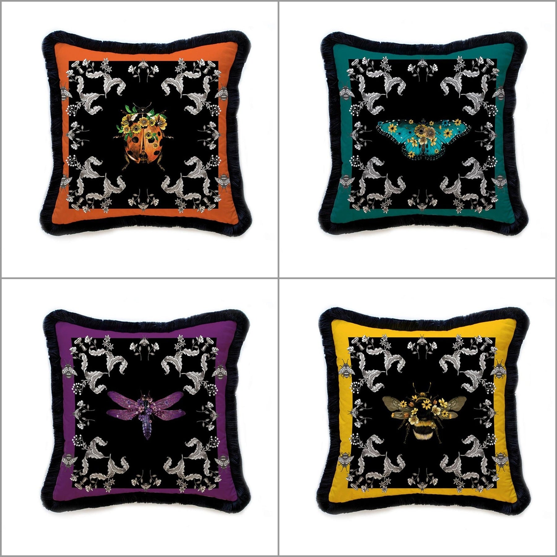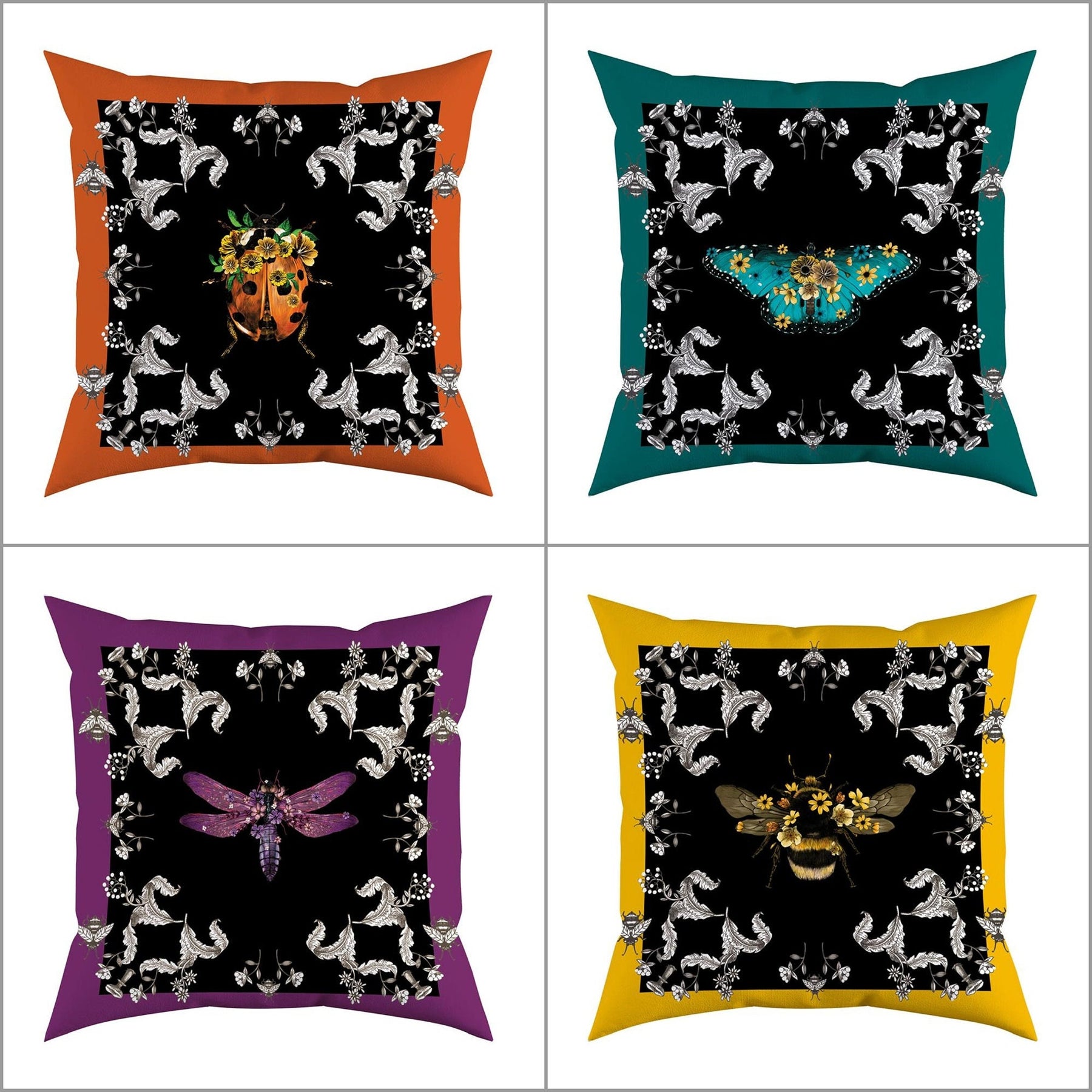 These elegant stylish and high quality throw pillow covers with Ladybug, Butterfly, Dragonfly and Bee prints on geometric design;