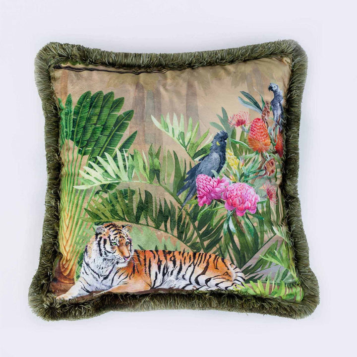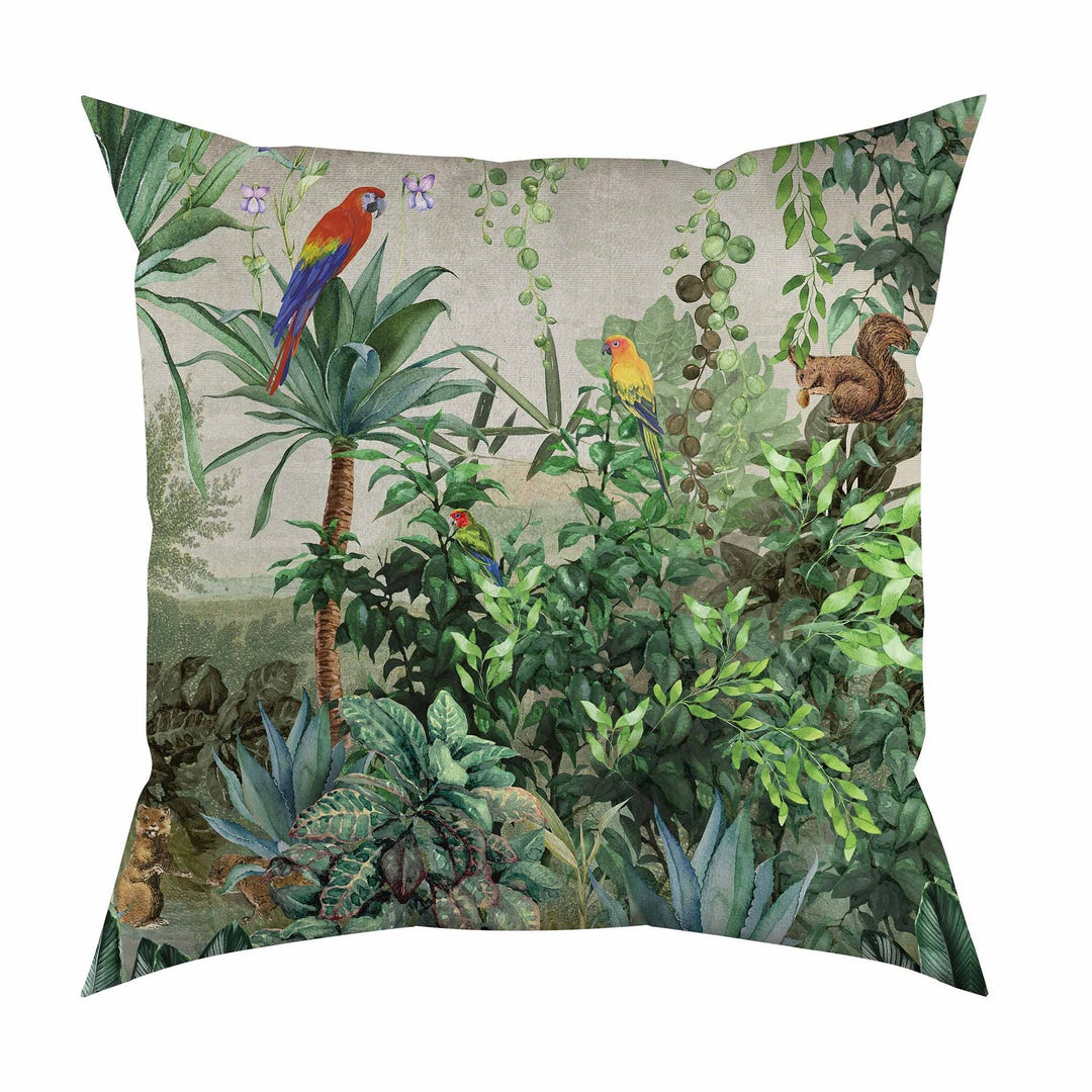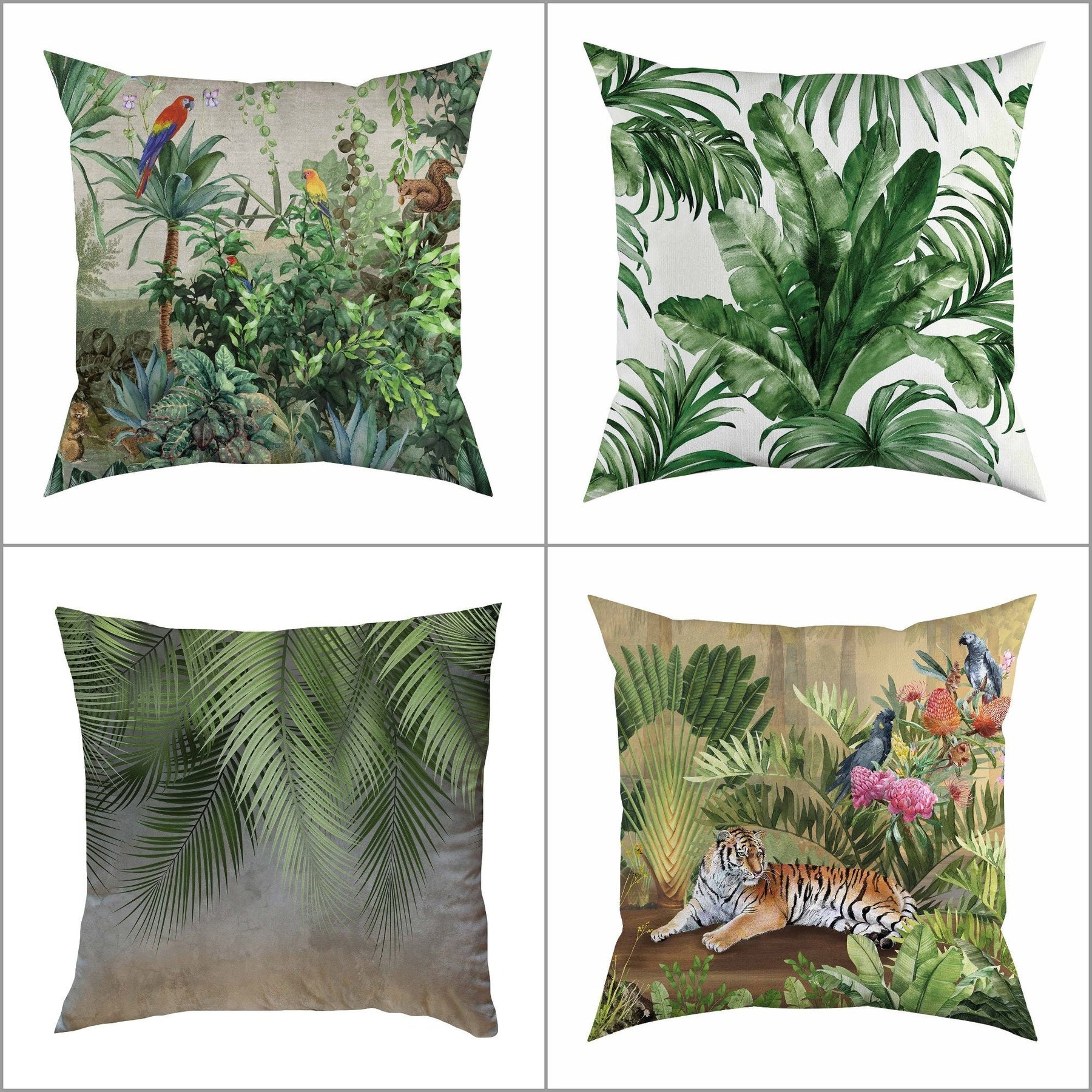 These elegant stylish and high quality throw pillow covers with tropical parrots, green plants and tiger in forest;