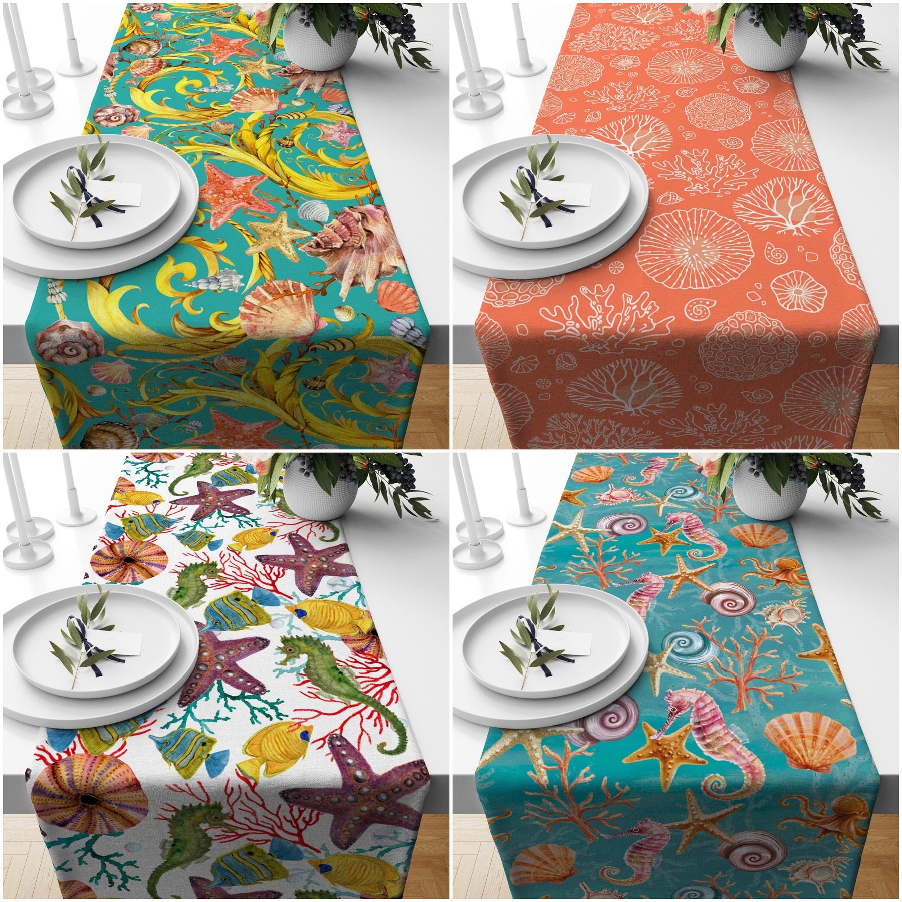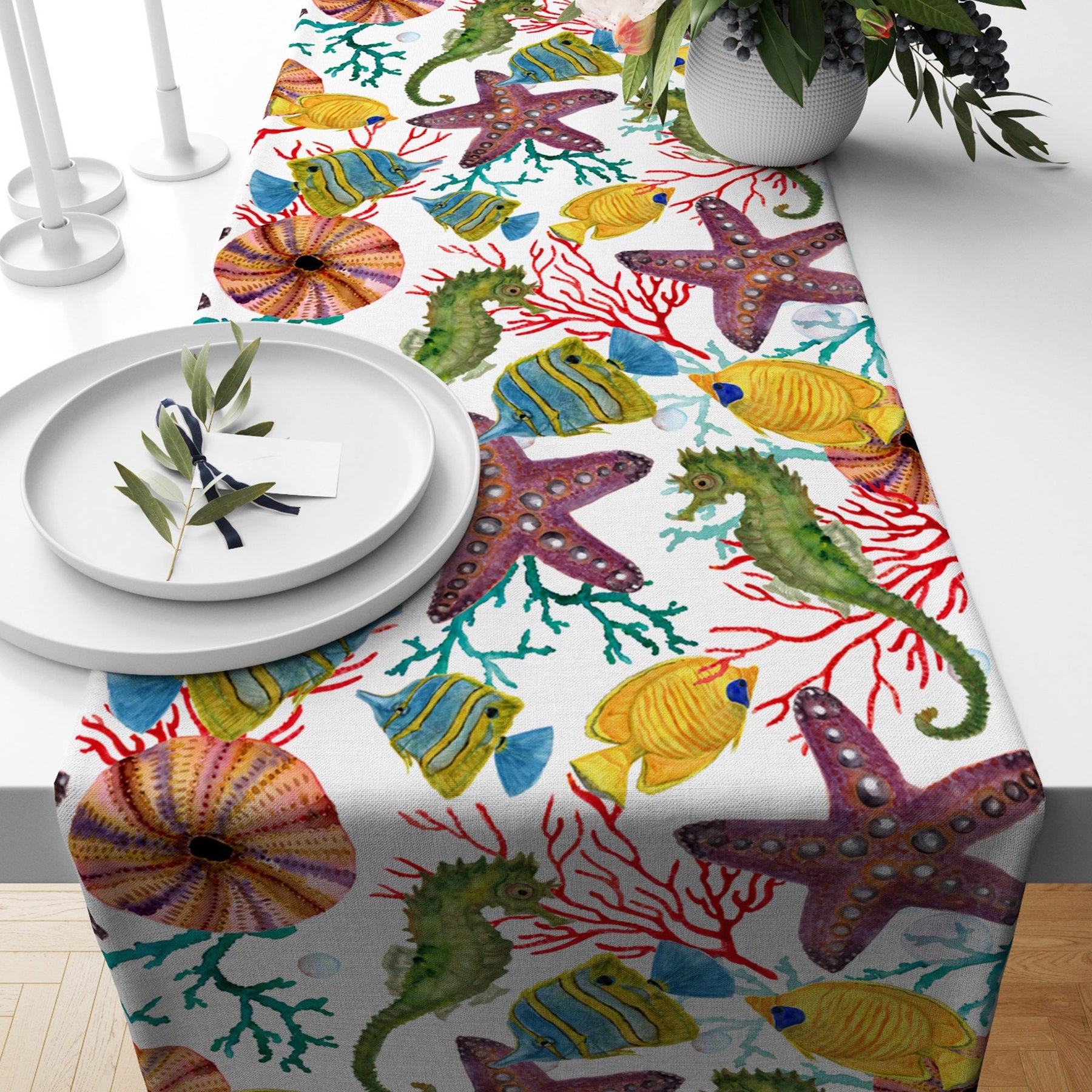 This high quality, beach house style starfish, seahorse, coral, fish and seashell printed nautical table runner;