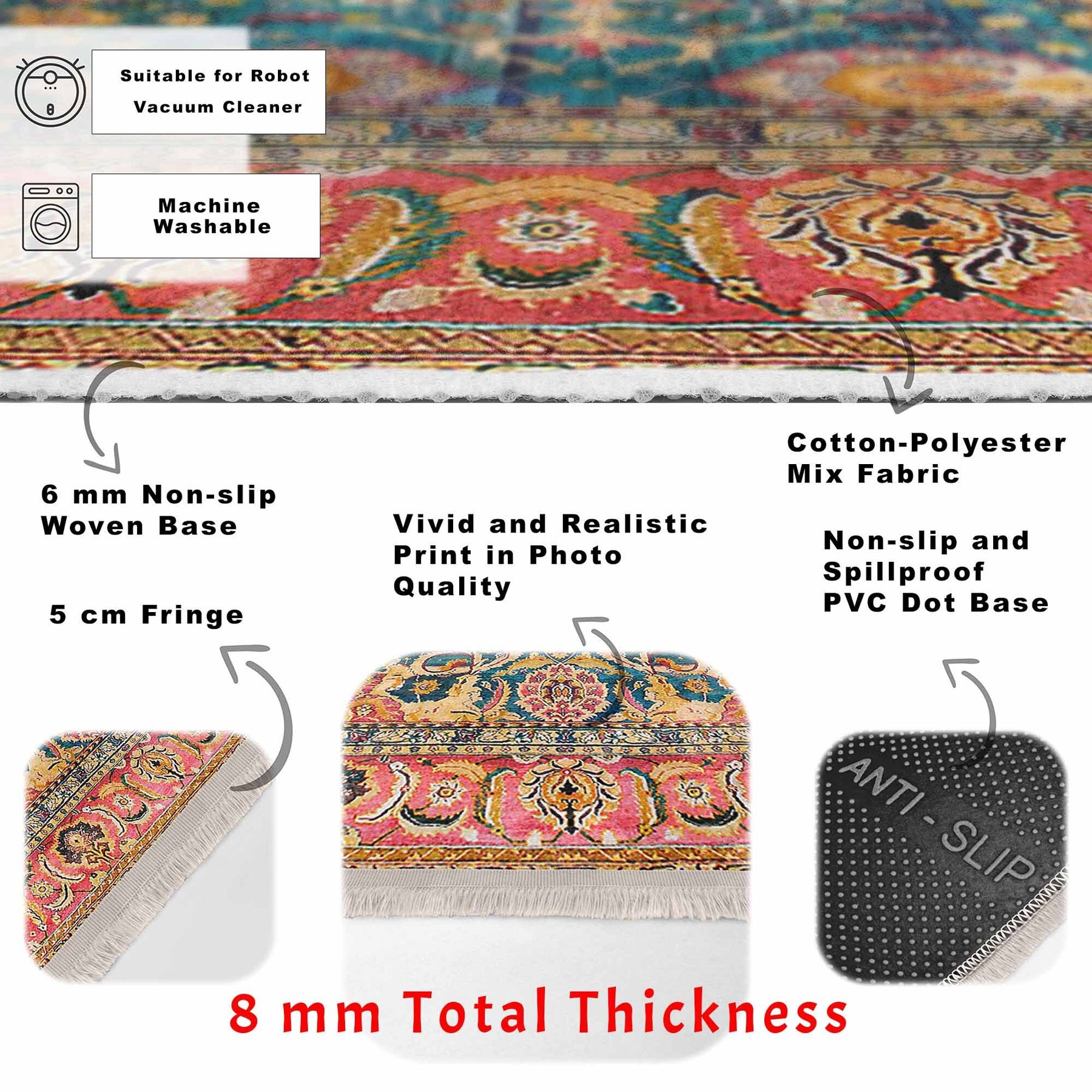 • Has 6 mm non-slip woven base. Total thickness of carpet is 8 mm.