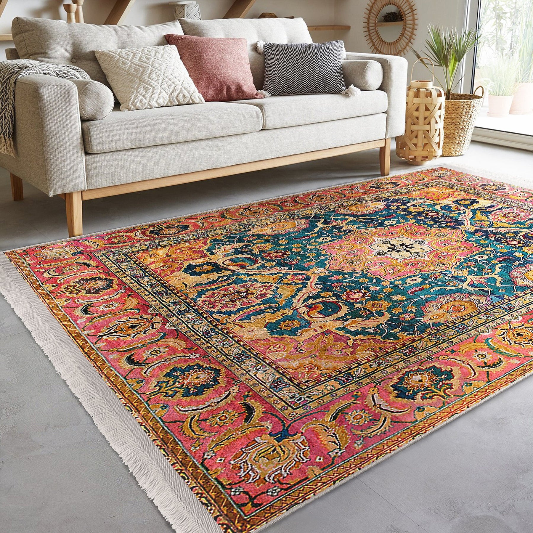 • Has 5 cm fringes on the short sides of these rectangular rugs and on the two edges of the square rugs in accordance with the pattern.