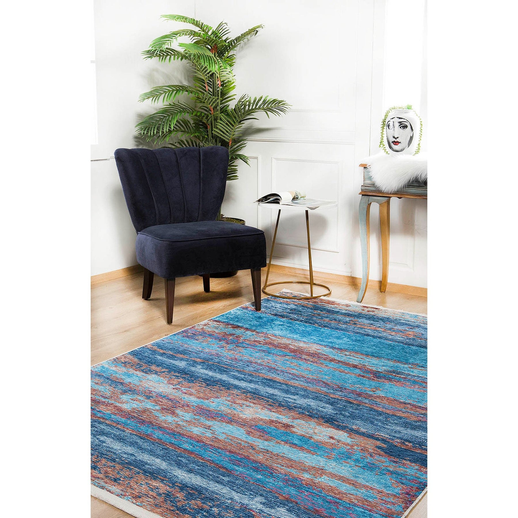 This elegant Machine-Washable floor rug with Blue Tile Transition design;
