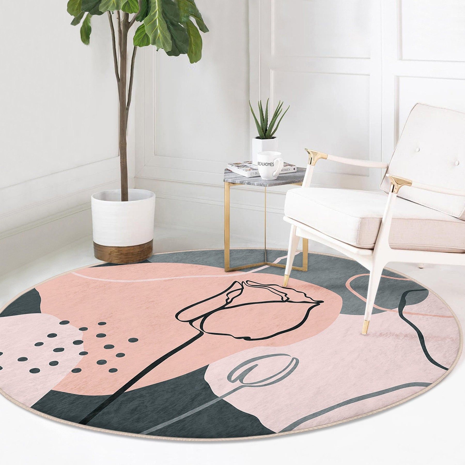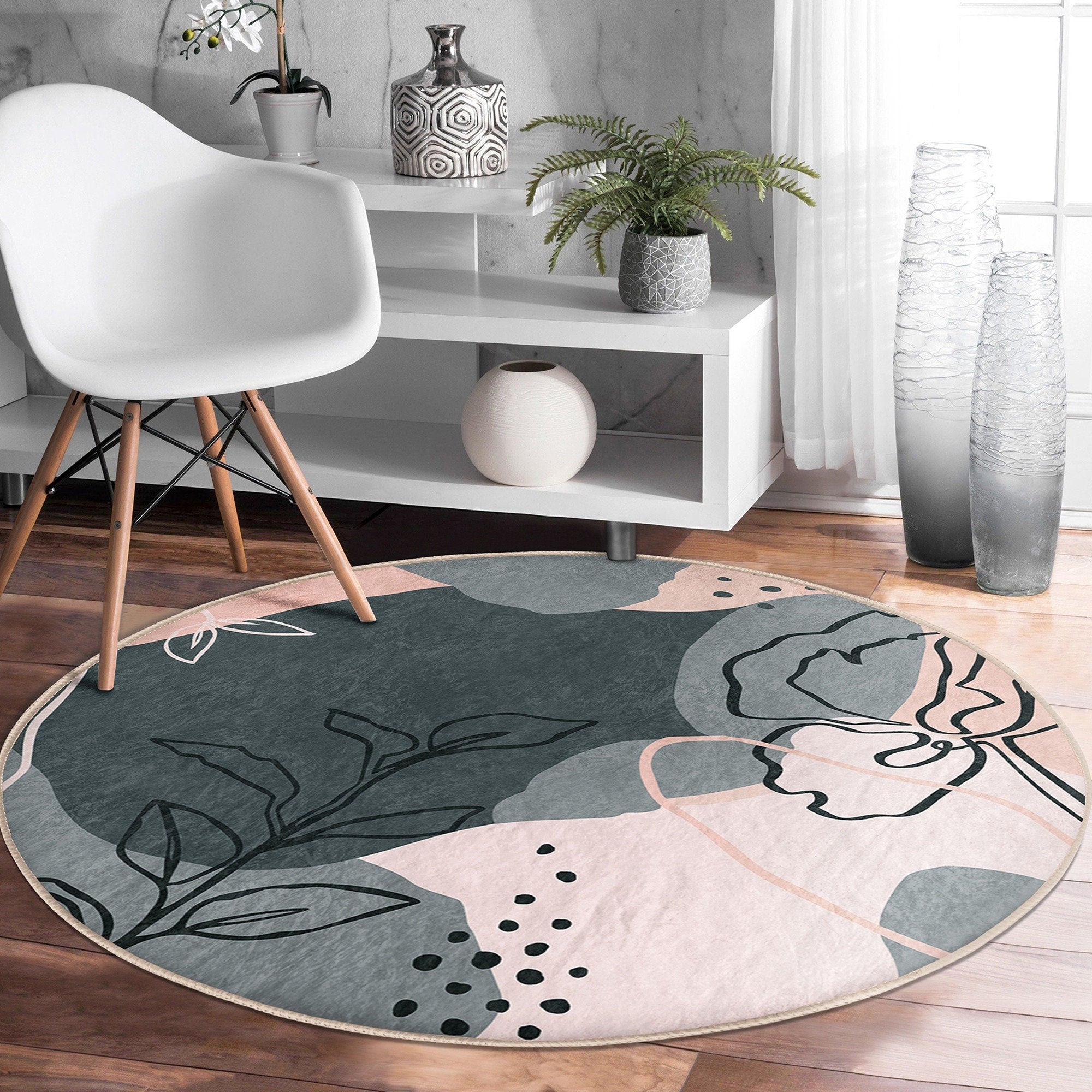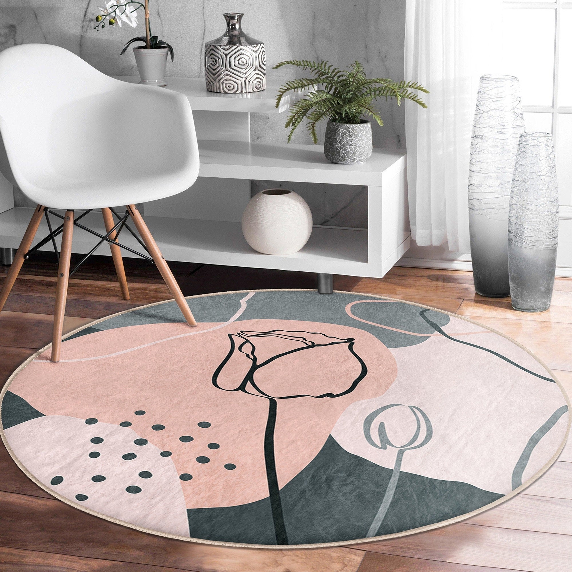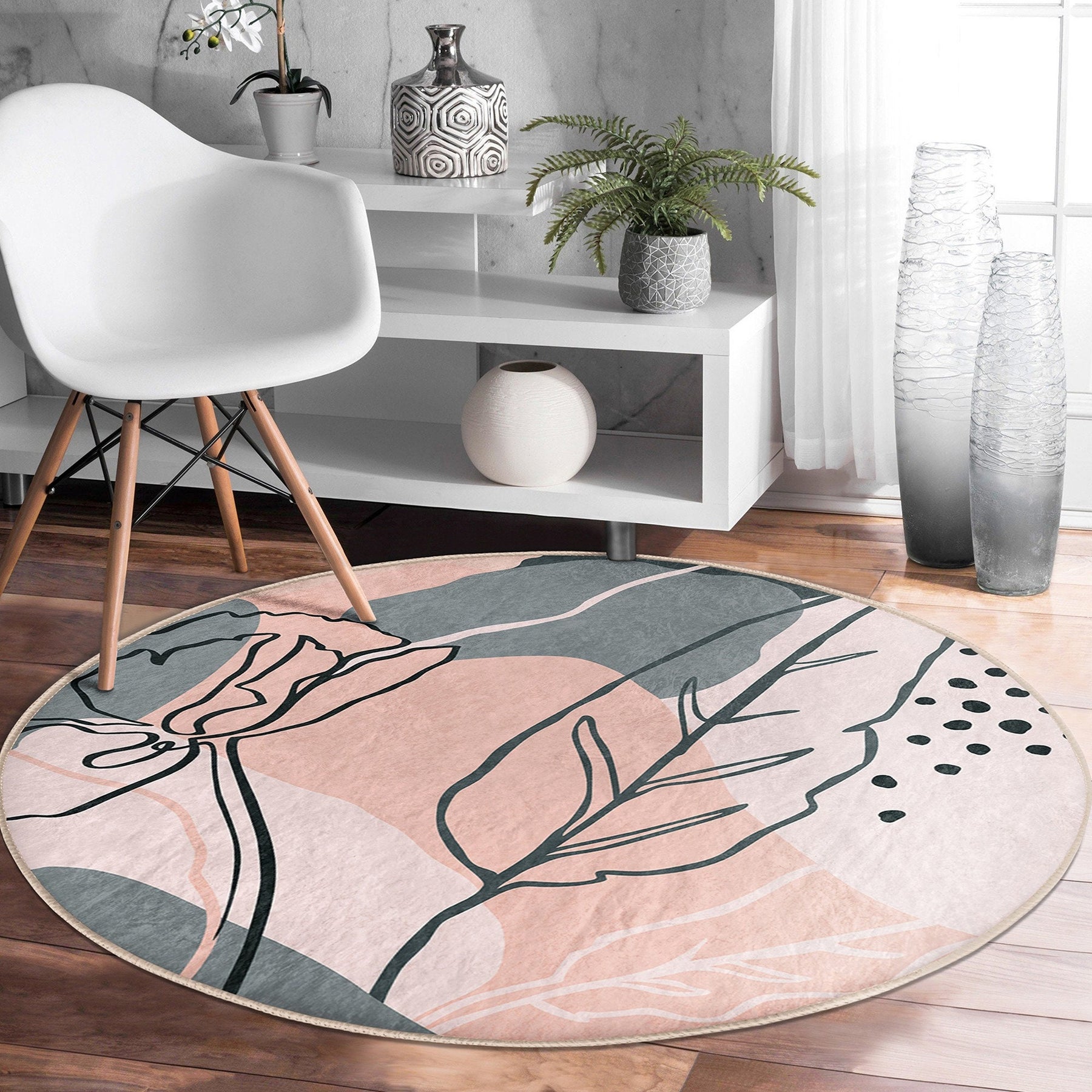 These elegant round floor rugs with abstract onedraw floral design;